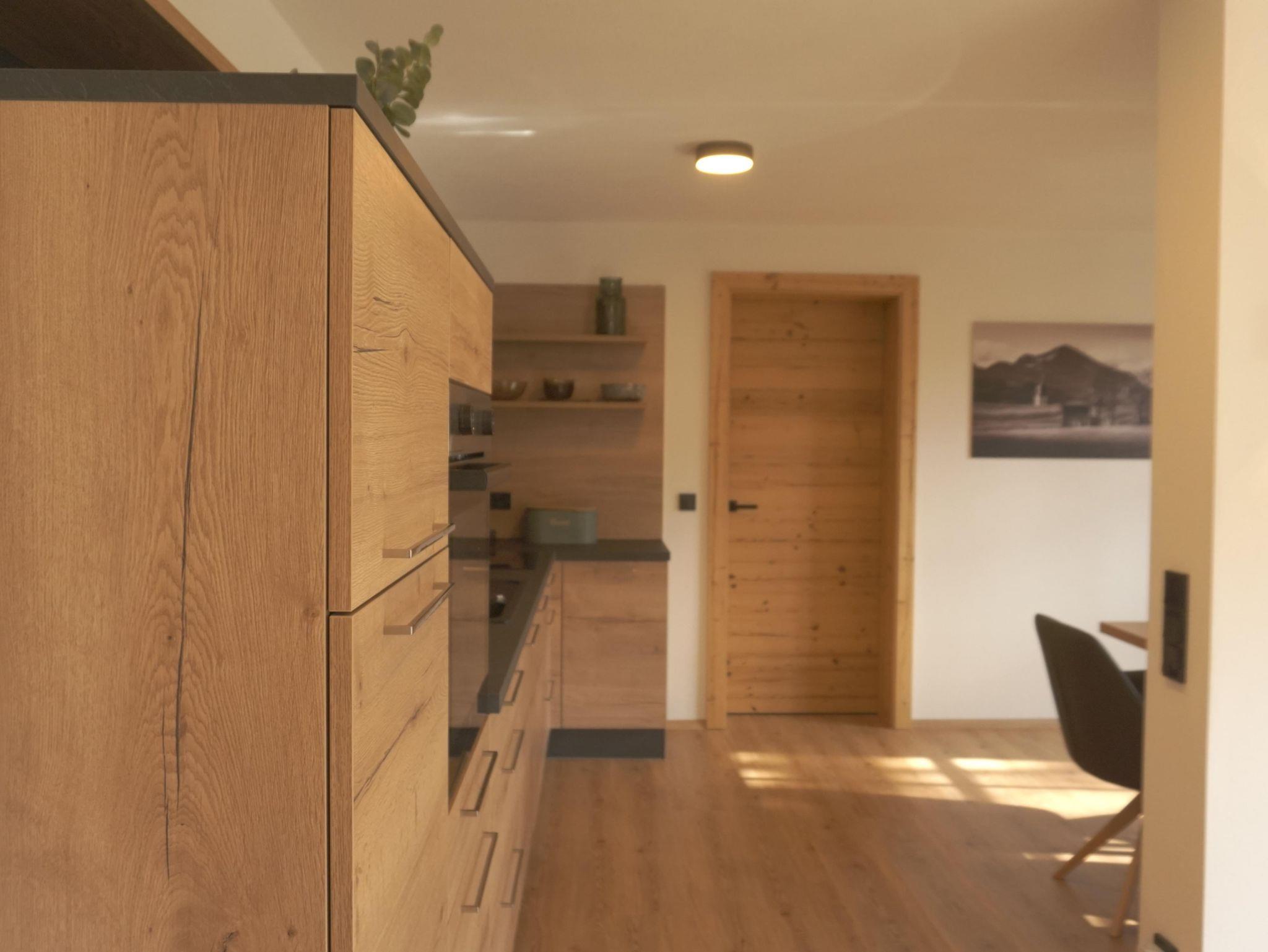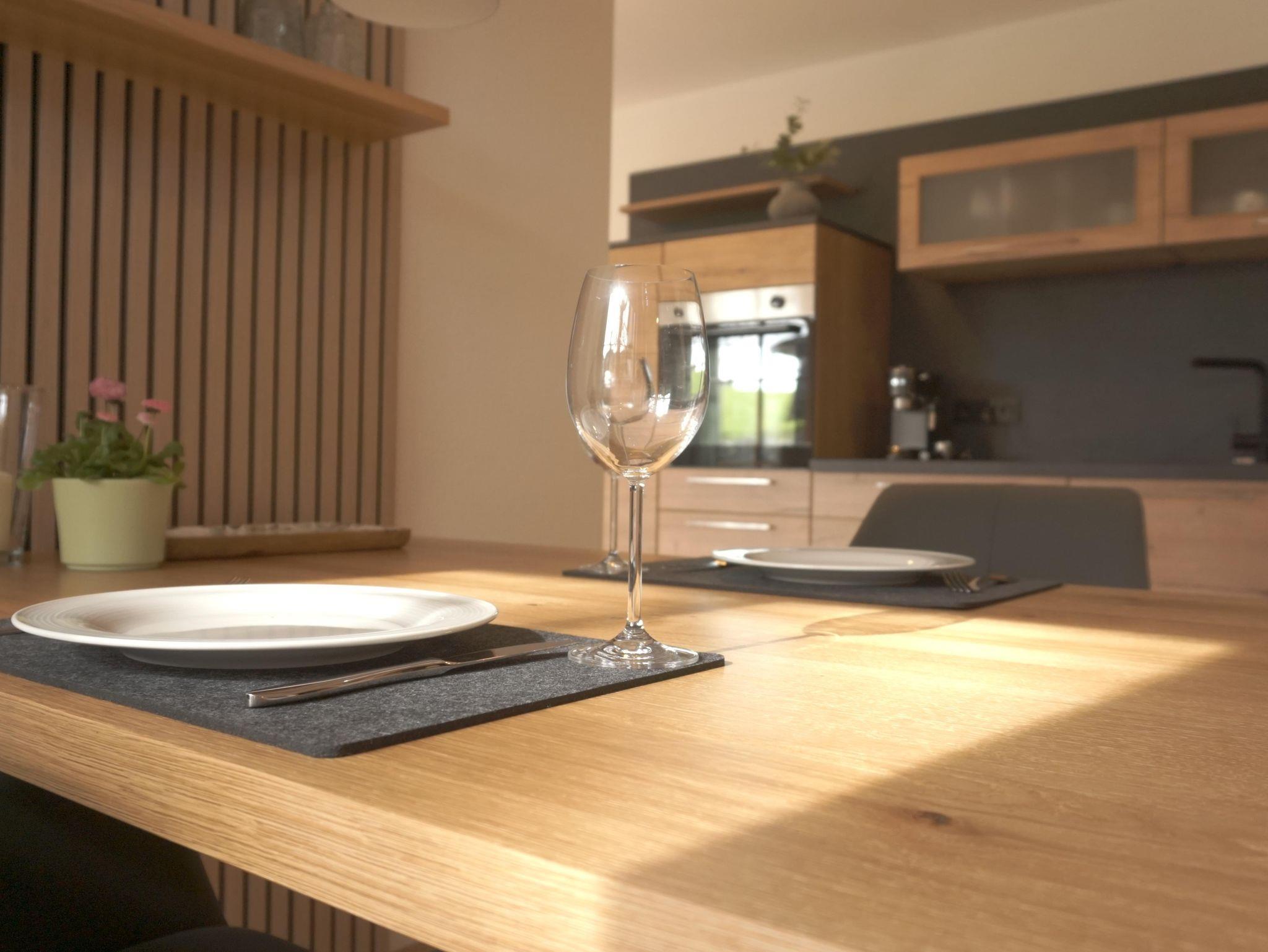 In unserer neuen, 65 qm großen Ferienwohnung erwartet Sie eine moderne, voll ausgestattete Wohnküche mit Geschirrspüler, Backofen und Kühlschrank mit Gefrierfach, Espressomaschine und allem dazugehörigen Zubehör.