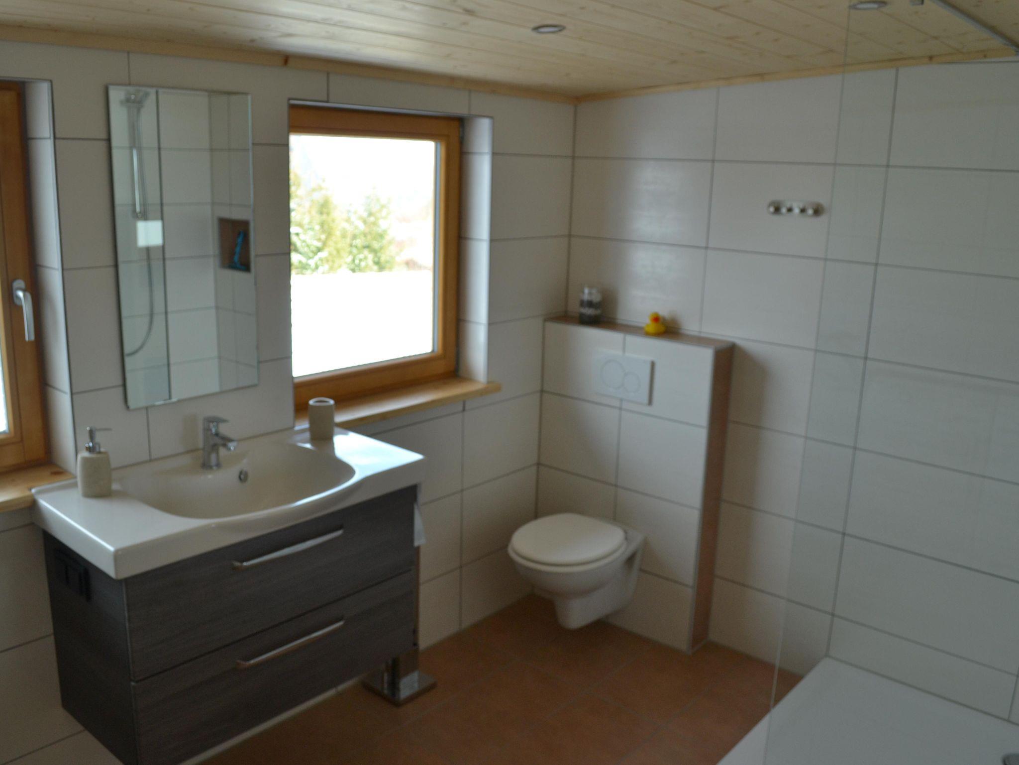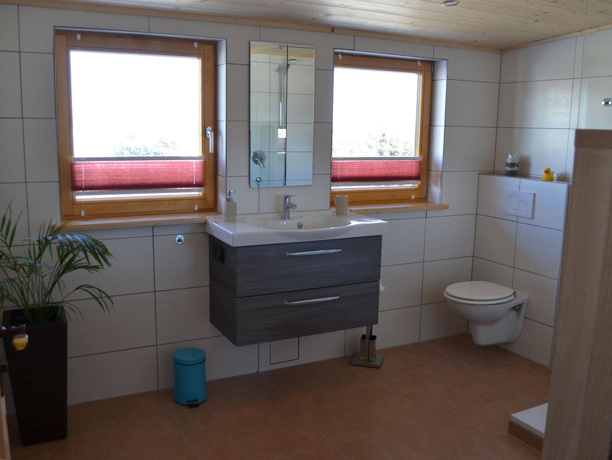 Das schöne Tageslichtbad mit Ausblick hat eine große Dusche, WC und Waschbecken, ebenfalls eine Waschmaschine mit Trockner.