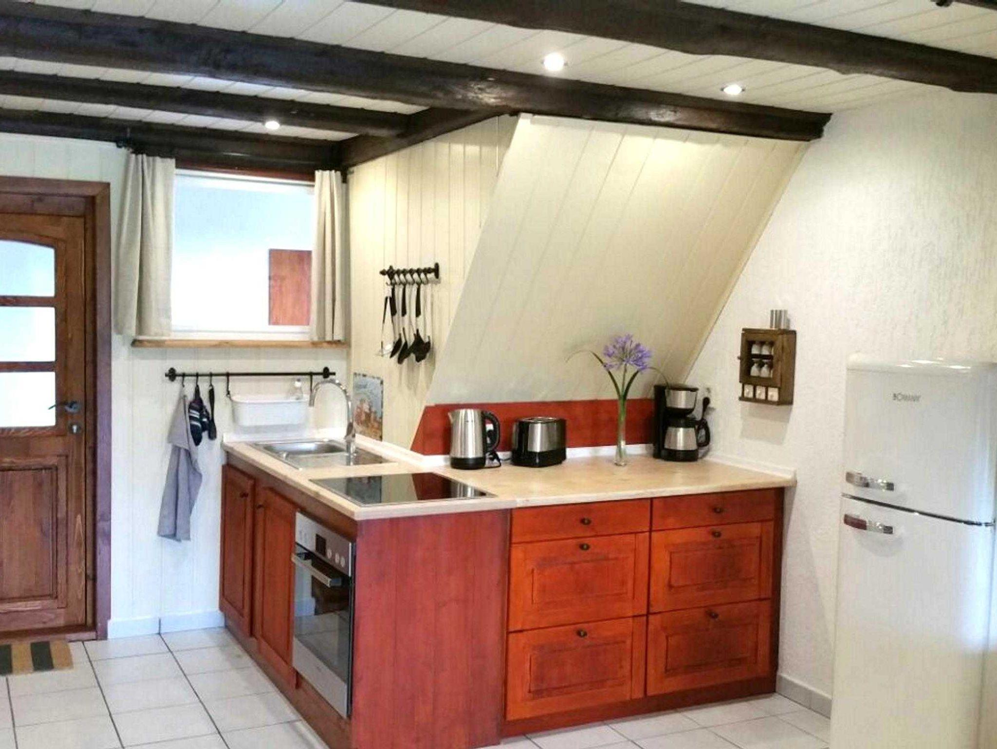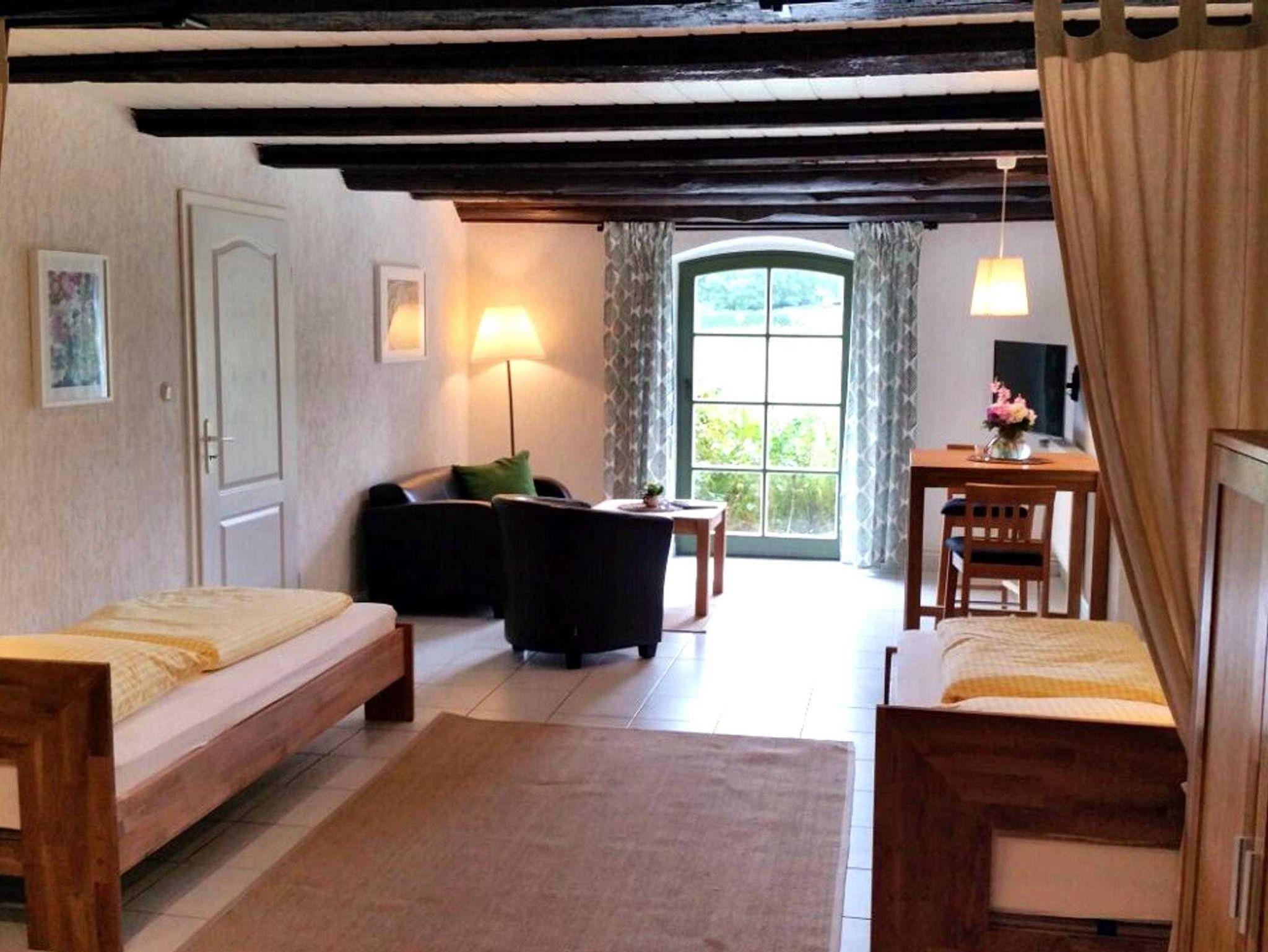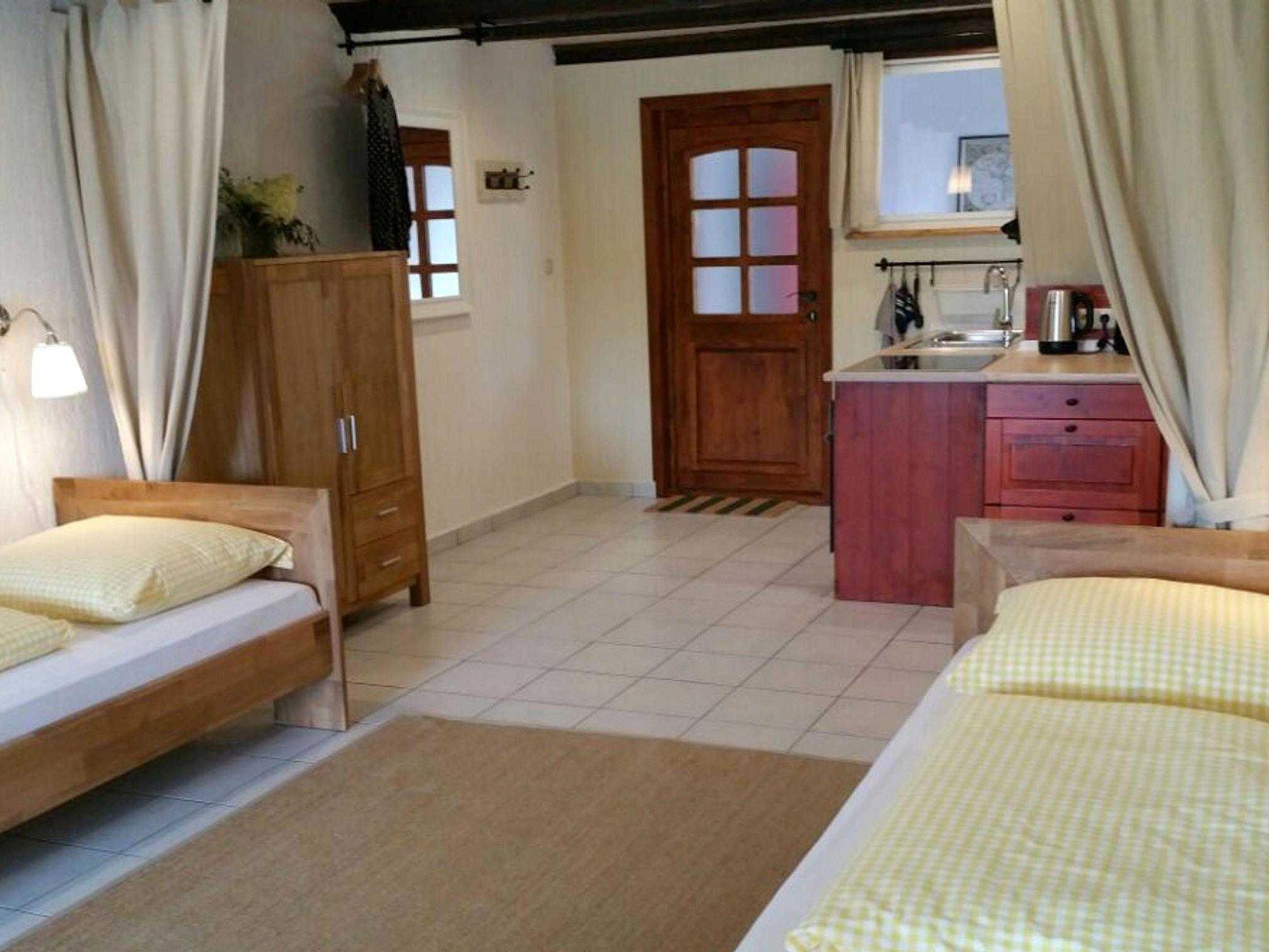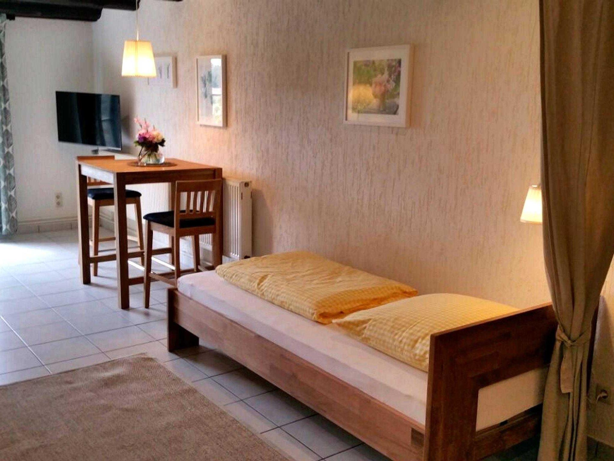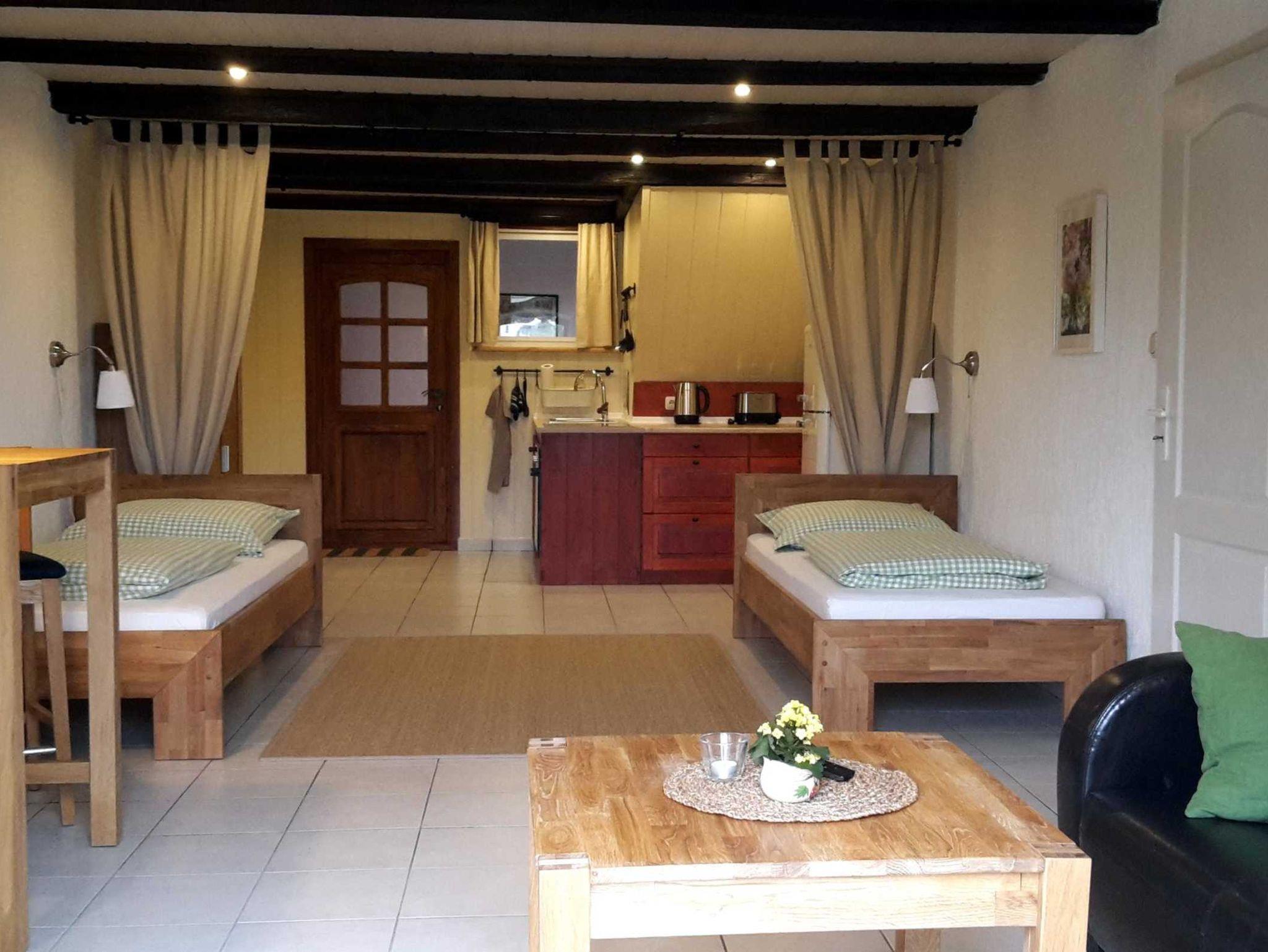 In dem Wohnraum sind Küche, Essplatz, Schlafzimmer und Sitzecke integriert. Die Wohnung ist mit schönem, massivem Holz- und Ledermobiliar eingerichtet. Sie schlafen in Einzelbetten, die bei Bedarf zusammenschiebbar sind. Aus der Terrassentür hat man einen direkten Zugang in den Garten, der direkt an den Feldrand grenzt.