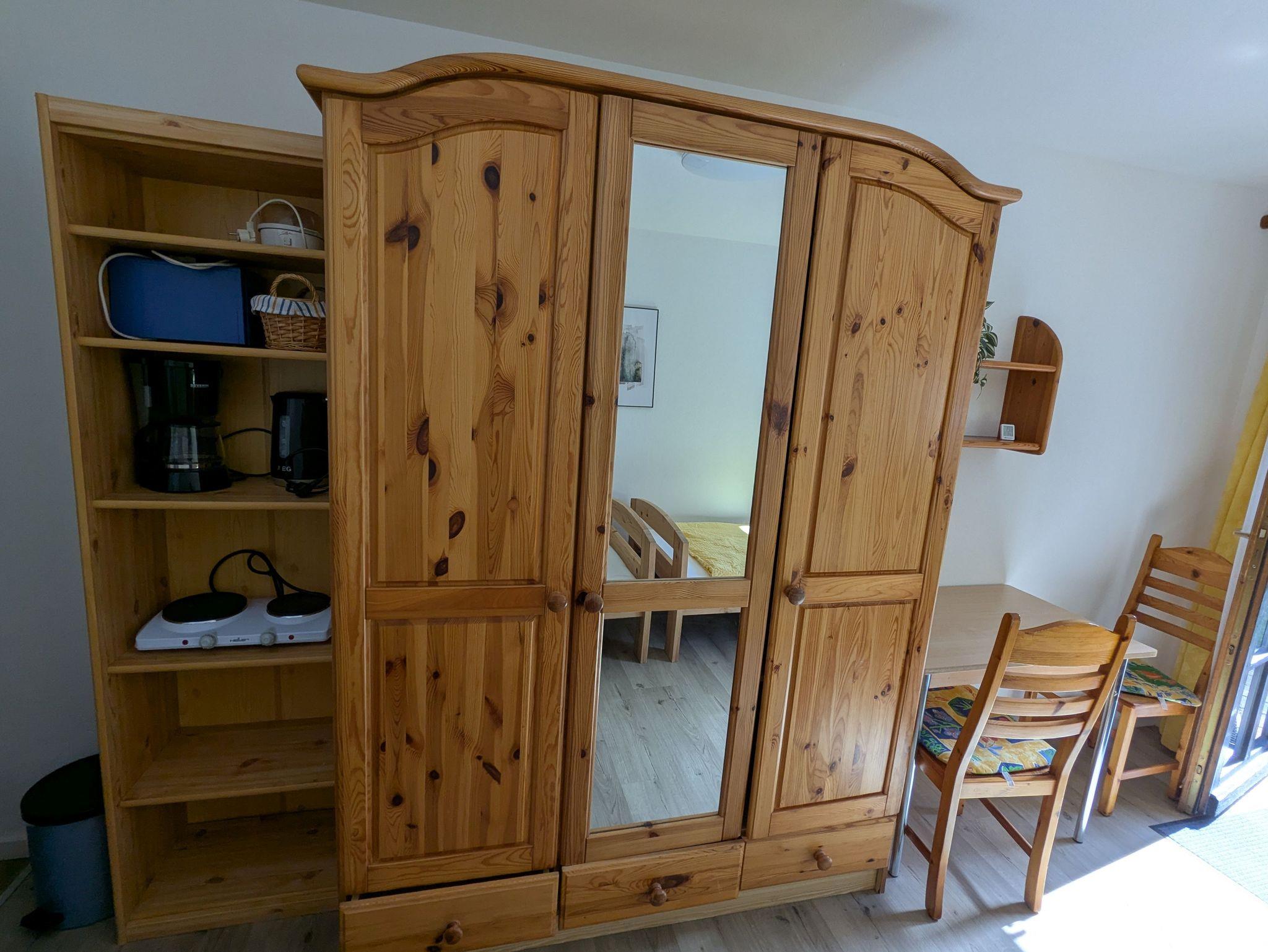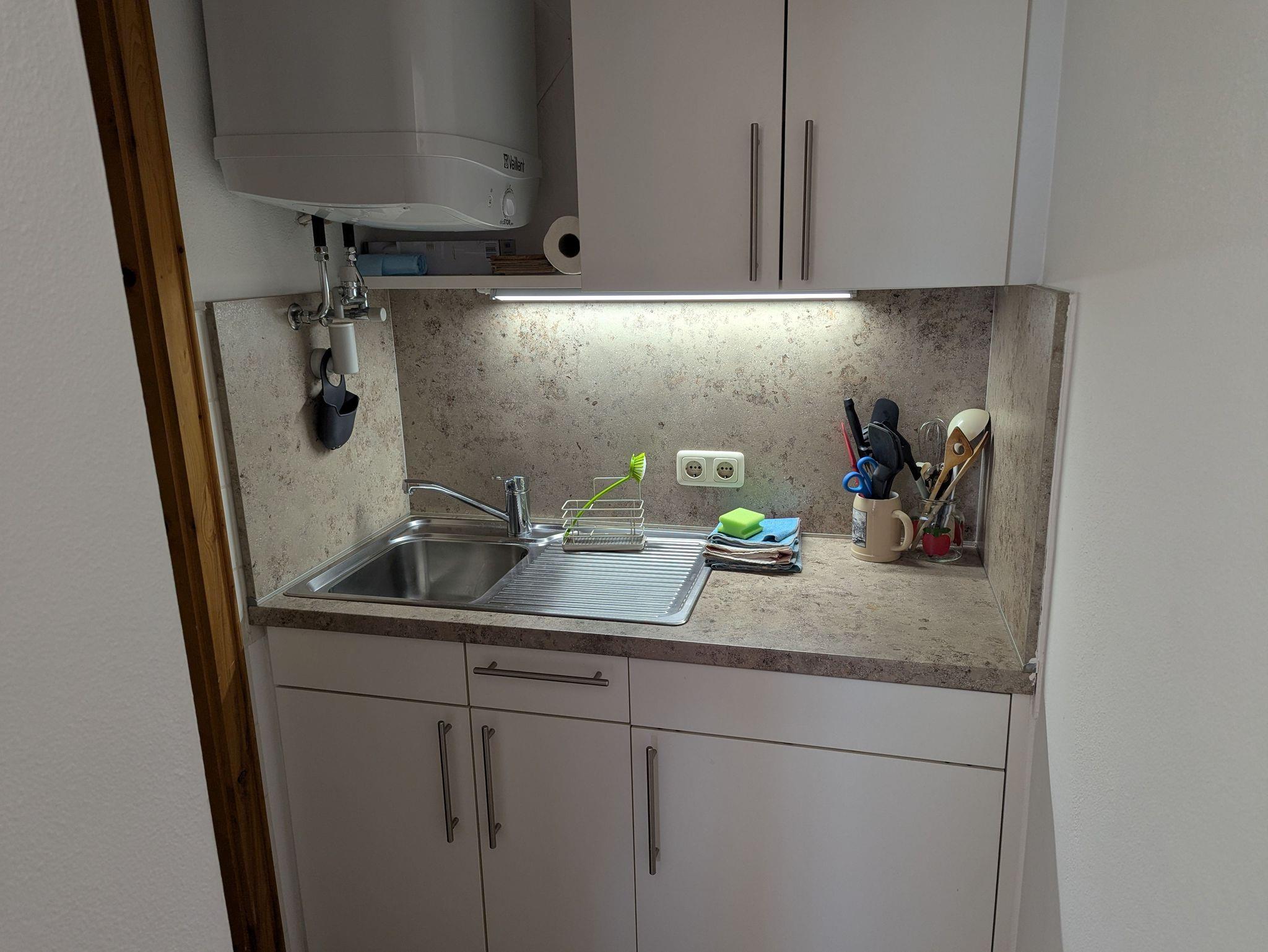 Die Küchenzeile lässt keine Wünsche offen: Sie finden eine Kaffeemaschine, Wasserkocher, einen 2-Platten-Herd, einen Kühlschrank, einen Eierkocher, Toaster sowie Geschirr, Töpfe und Pfannen. Für die Reinigung stehen Geschirrtücher, Spüllappen, -bürste und Spülmittel bereit. Im Bad erwarten Sie Handtücher, WC-Papier und Handseife.