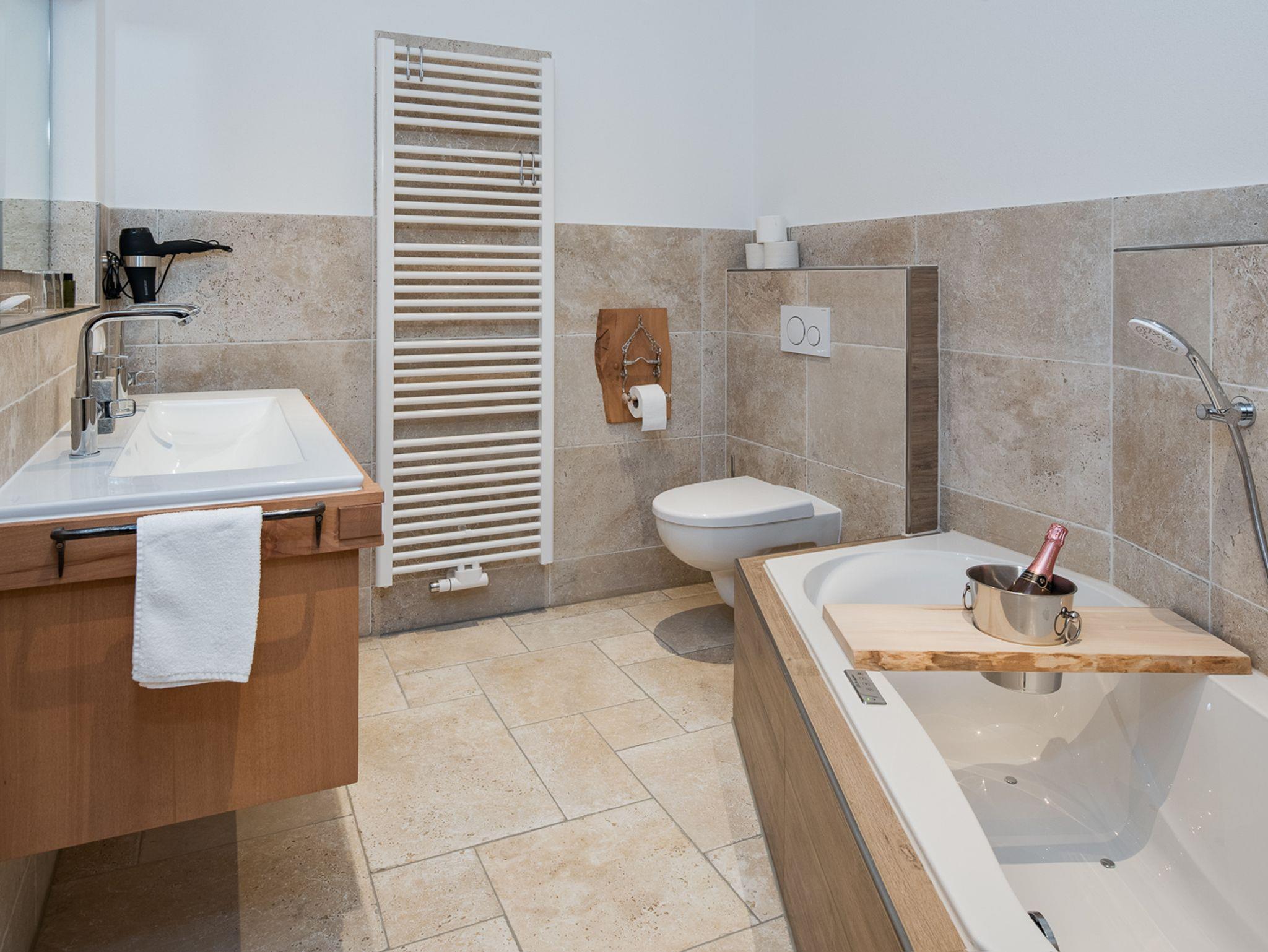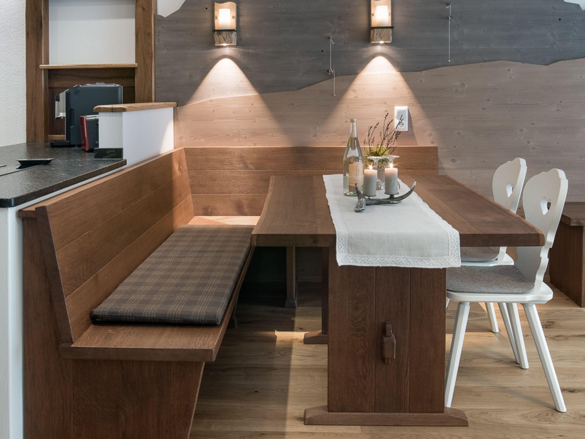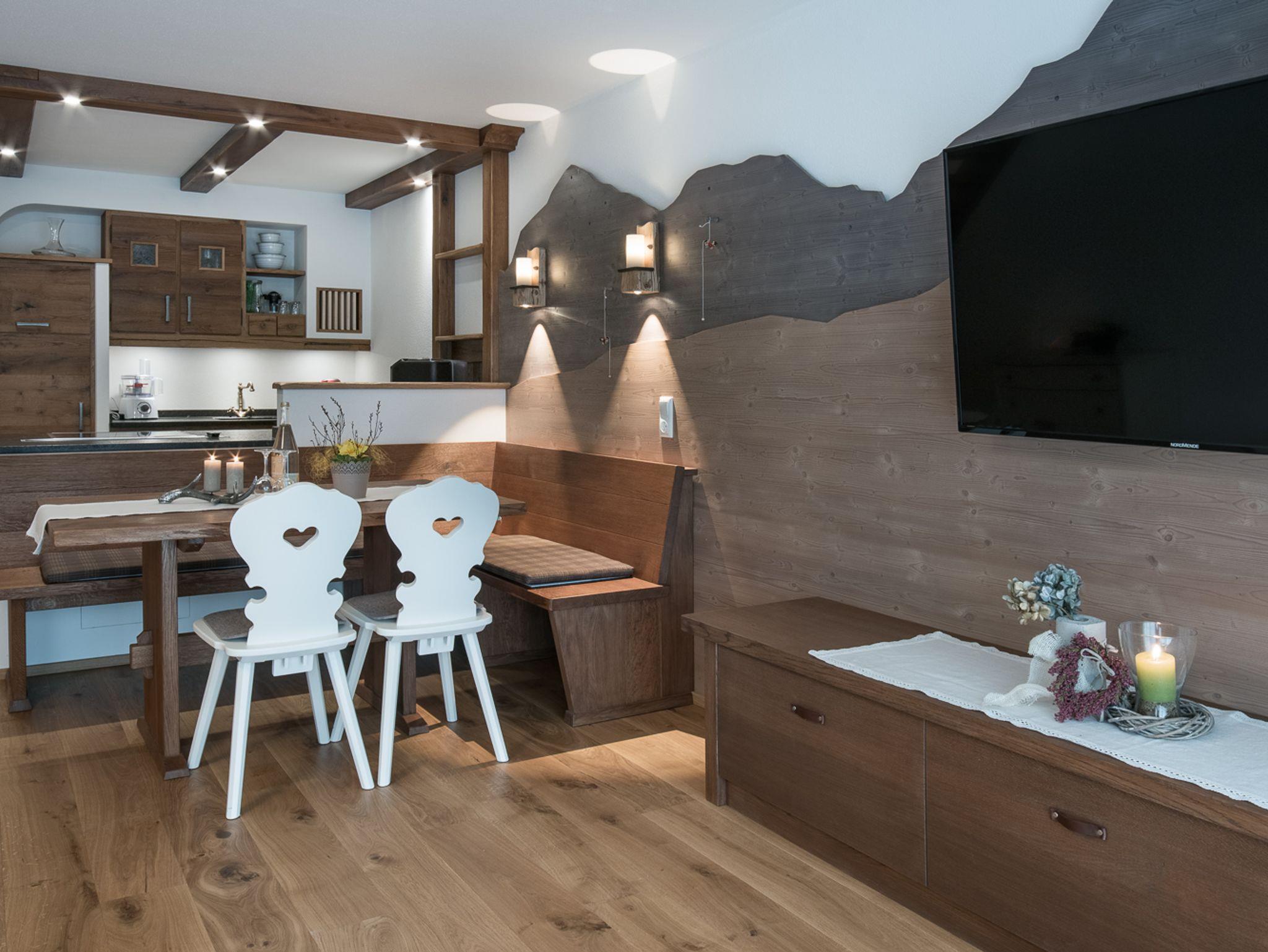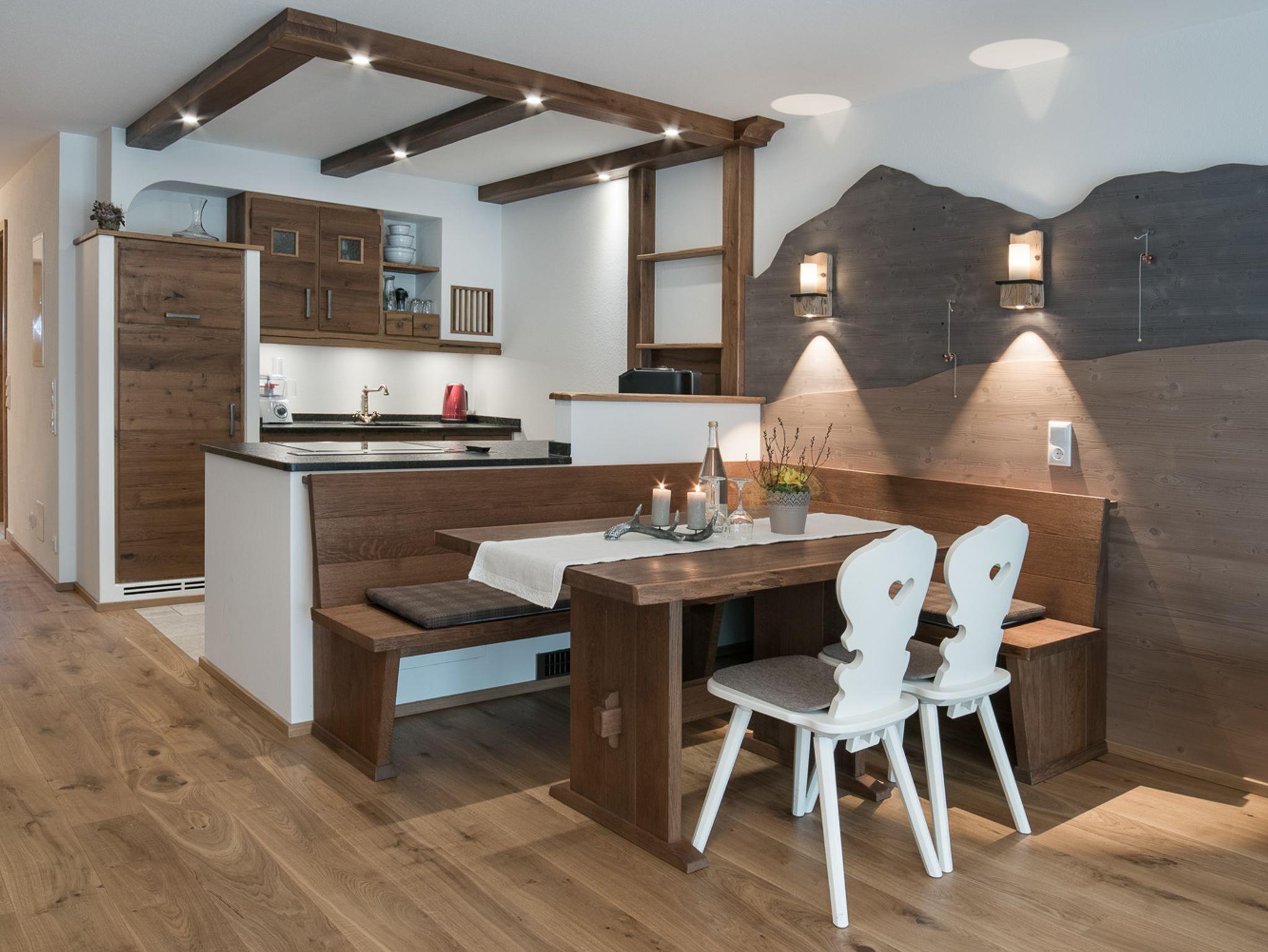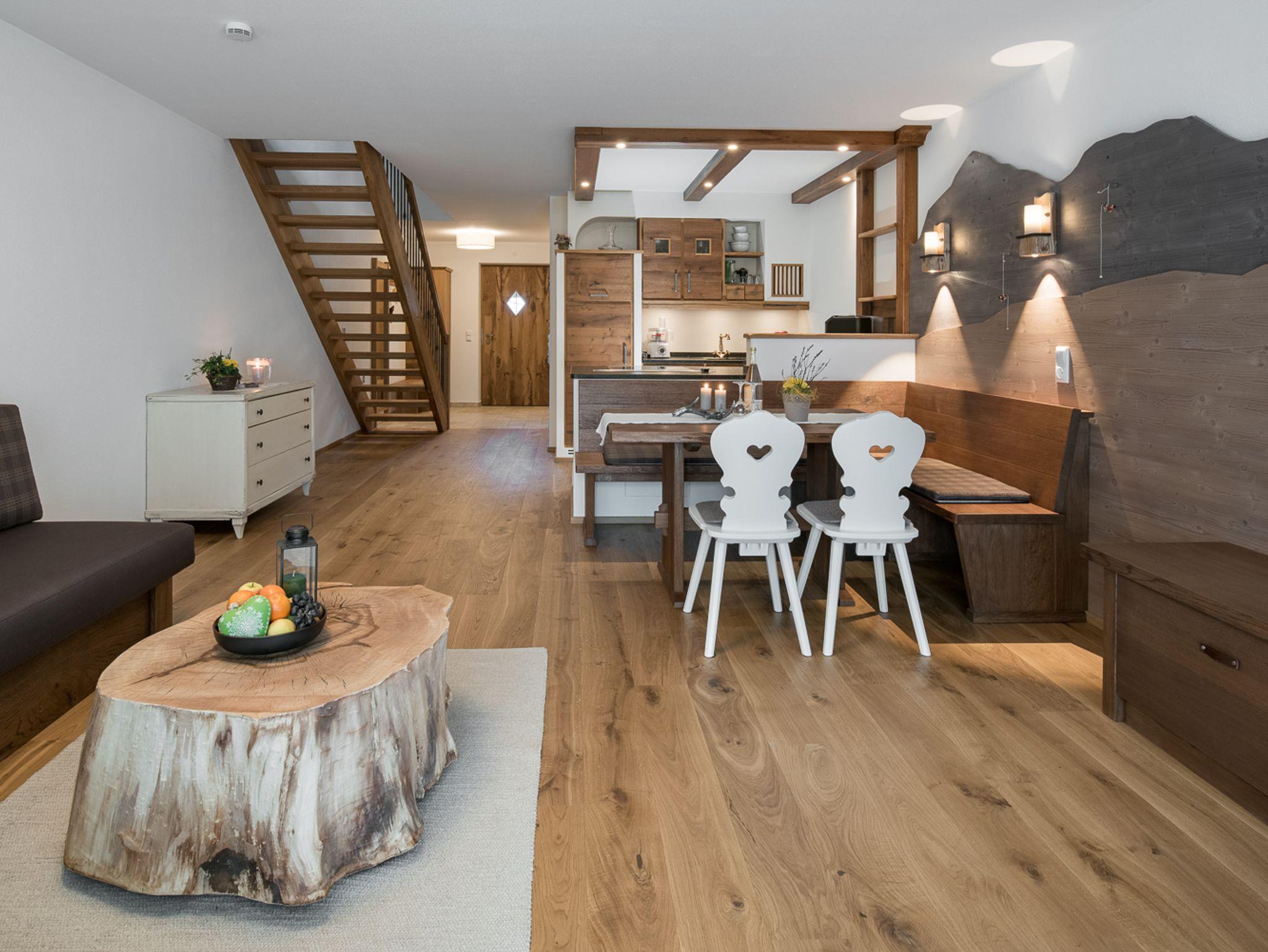 Ferienwohnung mit moderner, exklusiver Eichenholzeinrichtung im Landhausstil. Exklusive Terrasse und Balkon mit Bergblick.