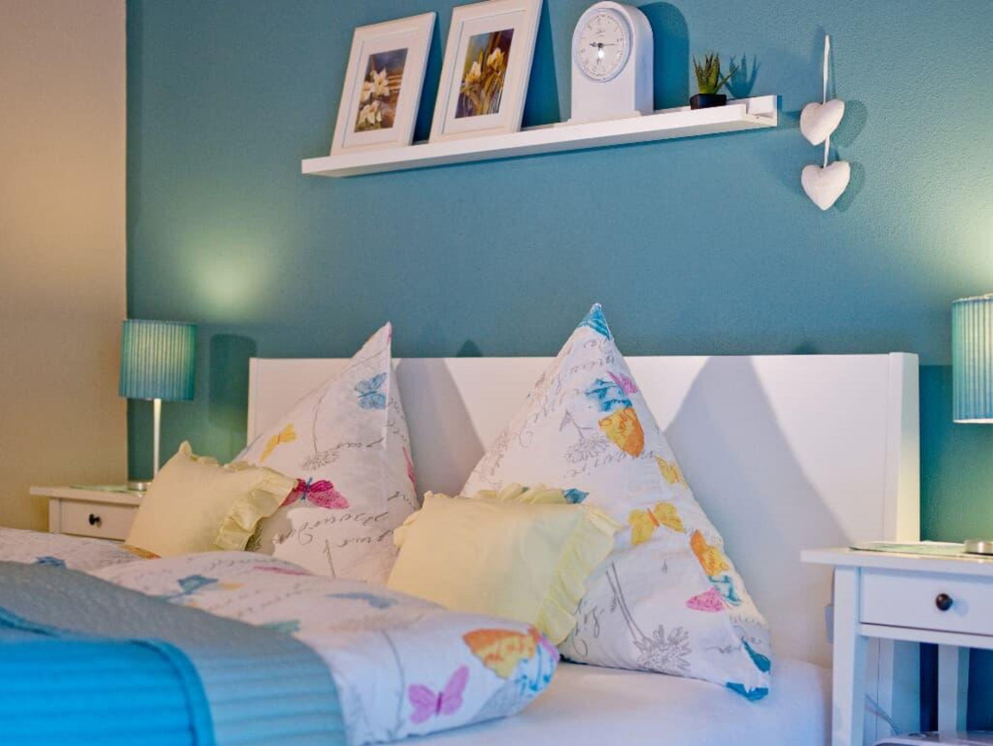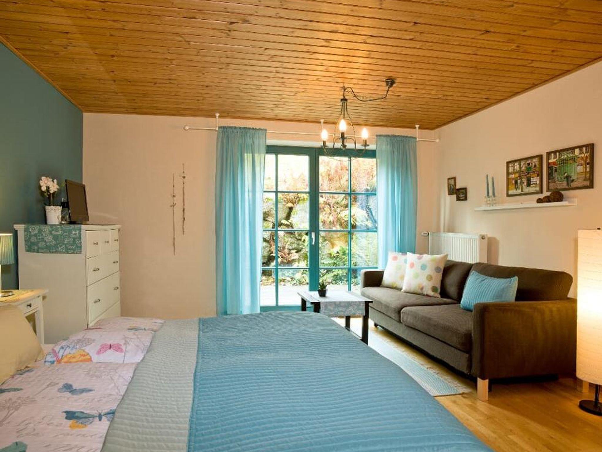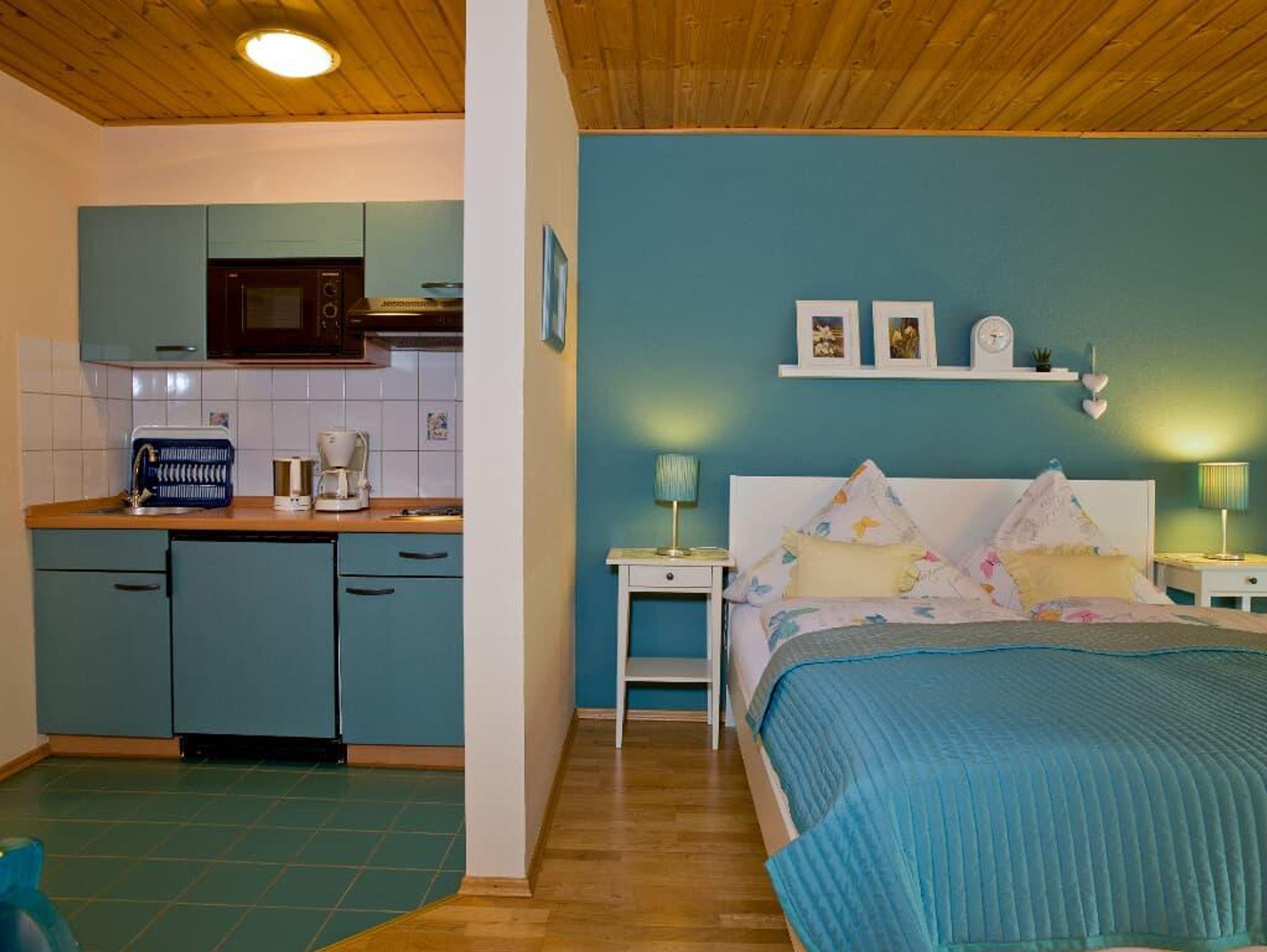 WohnungLusen 1-Zi.Komfort-Ferienwohnung mit 36 qm und kleiner Terrasse, liegt im Untergeschoß auf der Südseite des Ferienhauses. Sie finden eine sehr gut ausgestattete und gemütliche kleine Fewo, mit großer Sitzecke (kann als tt ausgezogen werden), Sat-TV/Flachbildschirm, CD-Player/Radio, Doppelbett (160x200cm) mit sehr gut ausgestatteter Bettenausstattung und schöner Bettwäsche für guten Schlaf, kleine Essecke mit vier Stühlen, Küchenzeile (mit Micro, 2-Platten-Herd, Wasserkocher, Kaffeemaschine, Kühlschrank, Mixer, reichlich Geschirr u.Küchenuntensilien), Badezimmer mit Dusche, WC, Fön, Schminkspiegel, reichlich Hand-u.Badetücher, Eingangsdiele mit Garderobe und Gartenmöbel (Stühle, Tisch, Sonnenschirm u. Liege) auf der Terrasse.