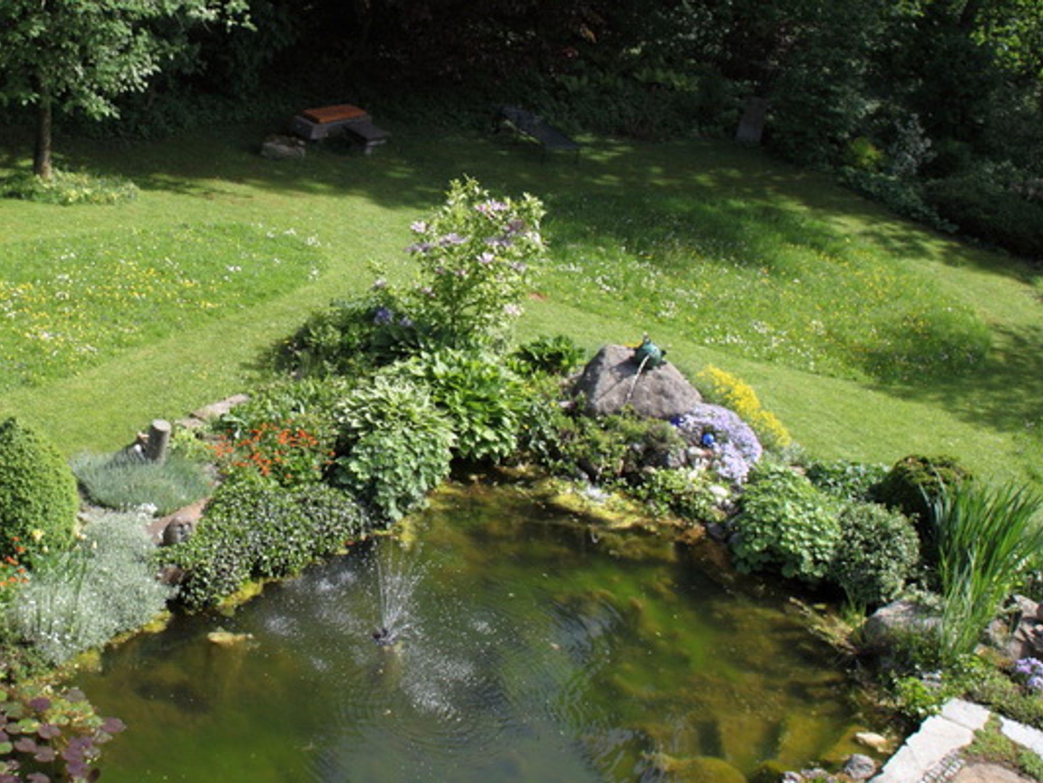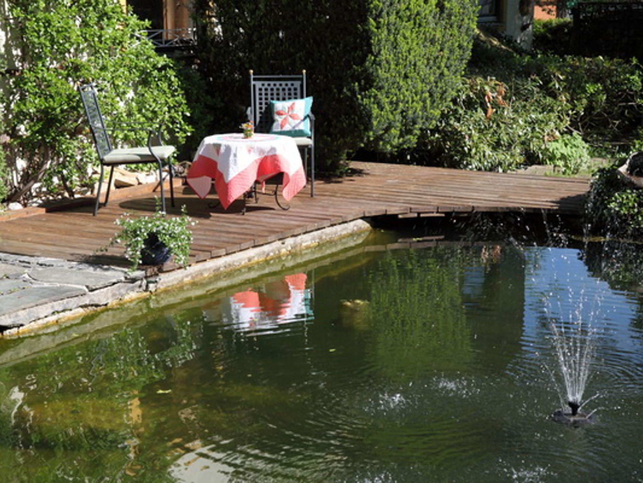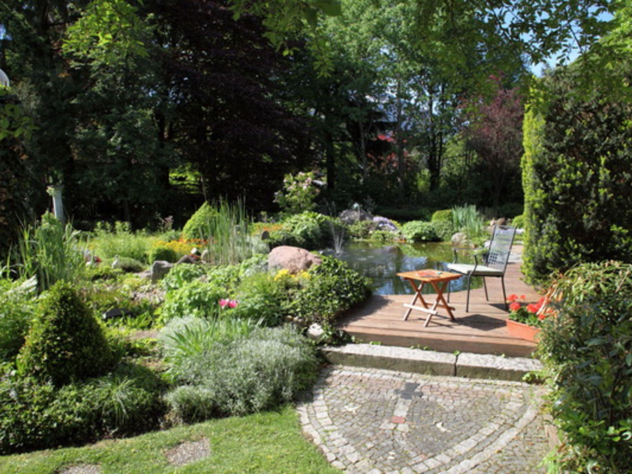 Im gepflegten großen Garten ist eine Sitzecke am Teich für Sie reserviert.