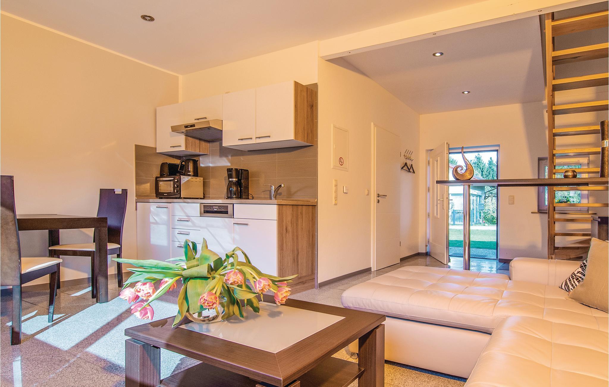 Der modern eingerichtete Wohnraum überzeugt mit offener Küche und breiter Glasfront. Von hier kommen Sie zur offenen Terrasse mit Rasenfläche. Im oberen Bereich des Hauses befinden sich die beiden Schlafräume. Eine dazugehörige Badestelle mit Steg liegt in Sichtweite des Pinnower Sees. Fahräder bekommen Sie gegen Gebühr an der Rezeption. Auch ein Ruderboot kann geliehen werden.