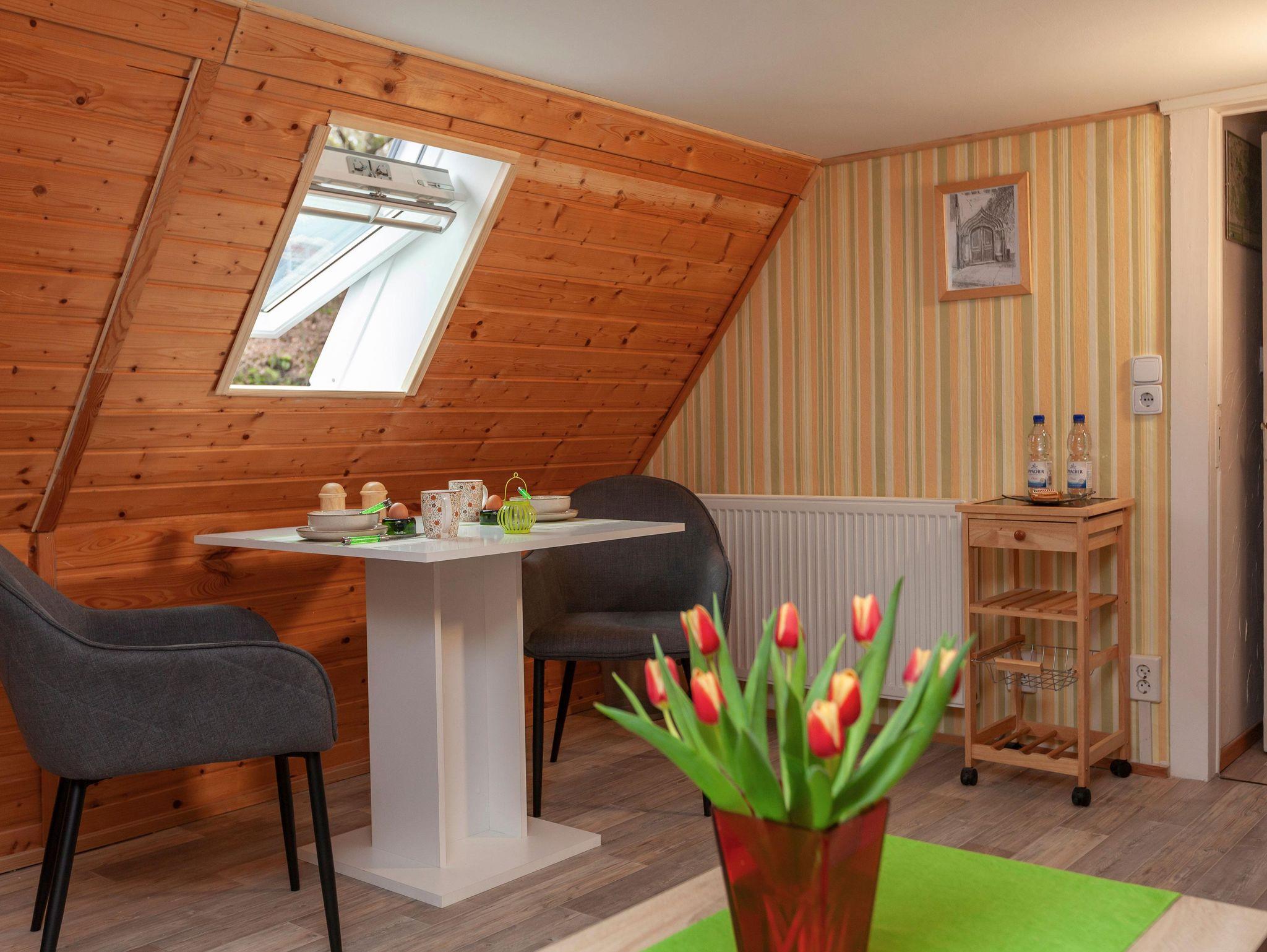 Die Nichtraucher-Ferienwohnung hat eine Größe von 45 m², liegt im Dachgeschoss und ist für 2 Personen geeignet. Sie verfügt über einen Wohnraum mit Couch, Essplatz, eingebautem Kleiderschrank, CD-MP3-Radio und Sat- TV. Die Küchenecke ist mit einem 2 Platten Ceran Kocher, Minibackofen, Kühlschrank mit Gefrierfach, Wasserkocher und Toaster ausgestattet. Das Schlafzimmer verfügt über ein Doppelbett (160 cm x 200 cm, geteilte Matratzen) und einen Wäscheschrank. Das kleine Bad ist mit einem WC und einer Badewanne mit integrierter Dusche ausgestattet.