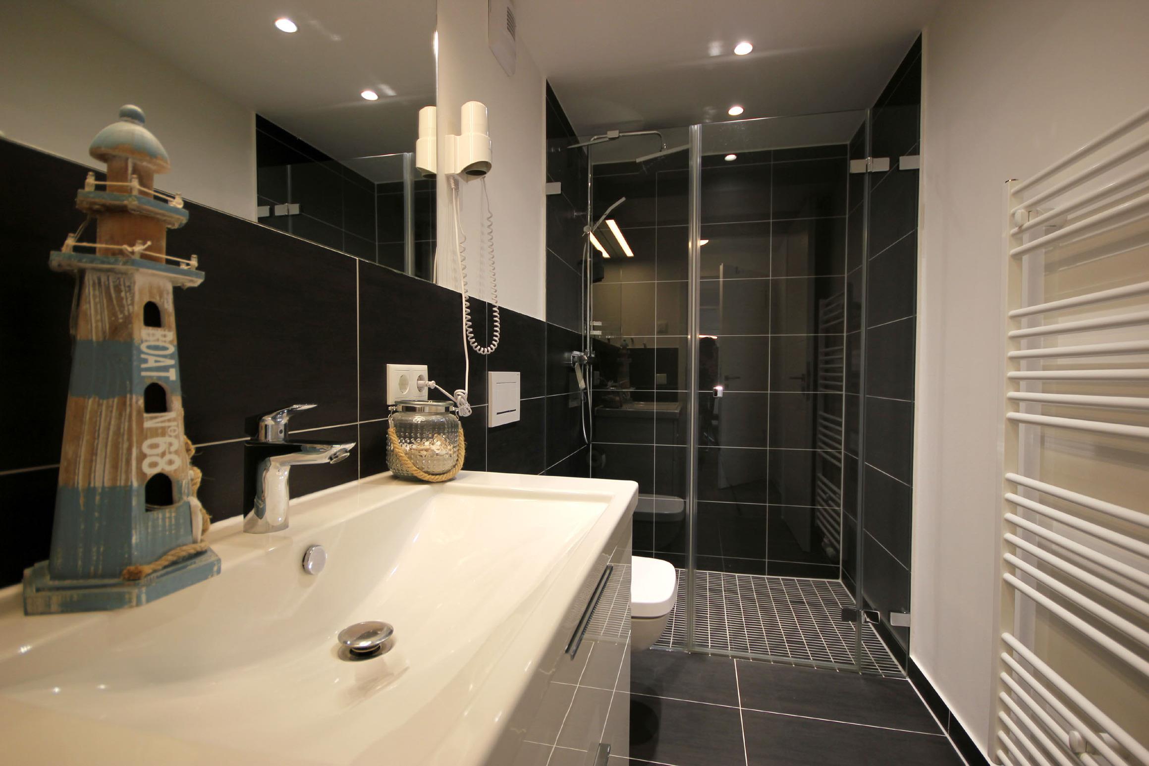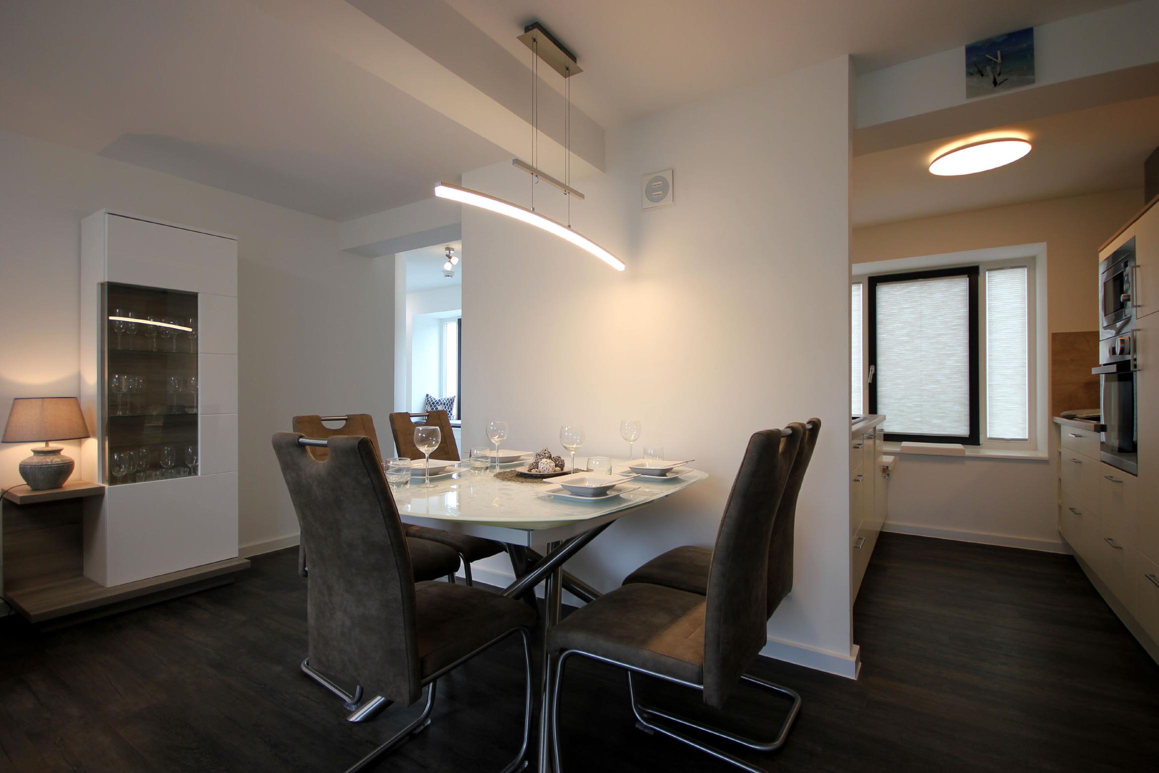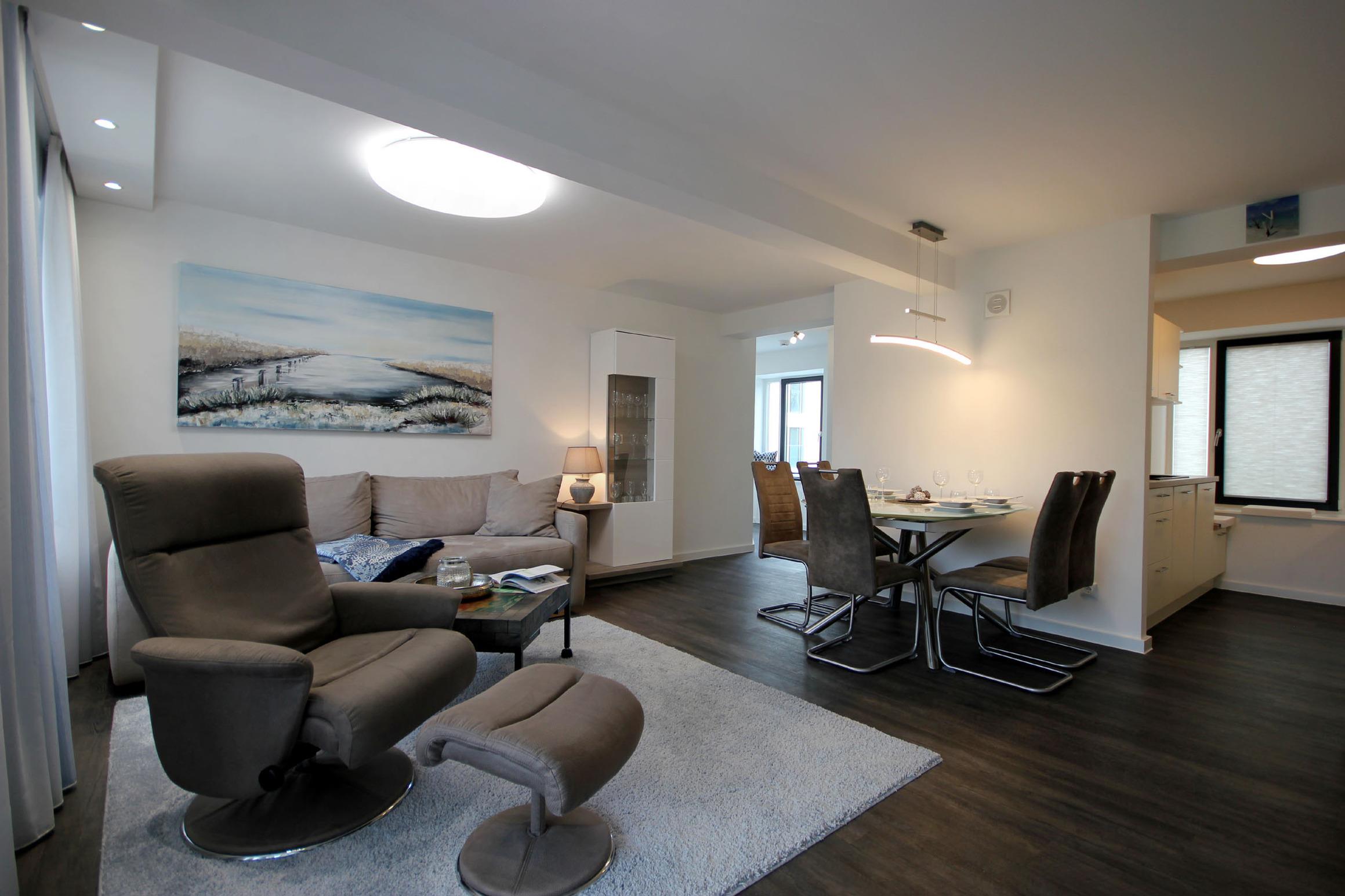 Ihr attraktives Appartement verfügt über einen einladenden Flur mit Garderobe und Zugang zum Gäste-WC mit Fenster. Angrenzend erreichen Sie den sehr gemütlichen Wohnbereich mit Essplatz sowie den erstklassig offenen Küchenbereich. Das geschmackvolle Wohnzimmer, mit Zugang zum Balkon, ist mit einer Sitzecke, Relaxsessel sowie mit einem großen Flachbild-TV und WLAN ausgestattet. In der attraktiven Küche erwartet Sie unter anderem ein Backofen, Cerankochfeld sowie ein Geschirrspüler, Kühlschrank, Tiefkühlschrank, eine Mikrowelle, Kaffeemaschine, Wasserkocher, Toaster sowie weiteres umfangreiches Kücheninventar. Das Hauptschlafzimmer verfügt über ein bequemes Doppelbett, Kleiderschrank, zusätzlichem Flachbild-TV sowie Zugang zum Balkon. Das Hauptbad erwartet Sie mit einer ebenerdigen Regendusche, einem Waschtisch, fest installiertem Fön sowie WC. Im zweiten Schlafbereich befindet sich ein französisches Doppelbett, ein bequemer Schlafsessel für die 5. Person, Flachbild-TV und Kleiderschrank. In beiden Schlafzimmern sorgen zusätzliche Verdunklungsstoffe für einen erholsamen Schlaf. Rundum eine erstklassig eingerichtete Wohnung zum Abschalten vom Alltag und Genießen des Urlaubes.