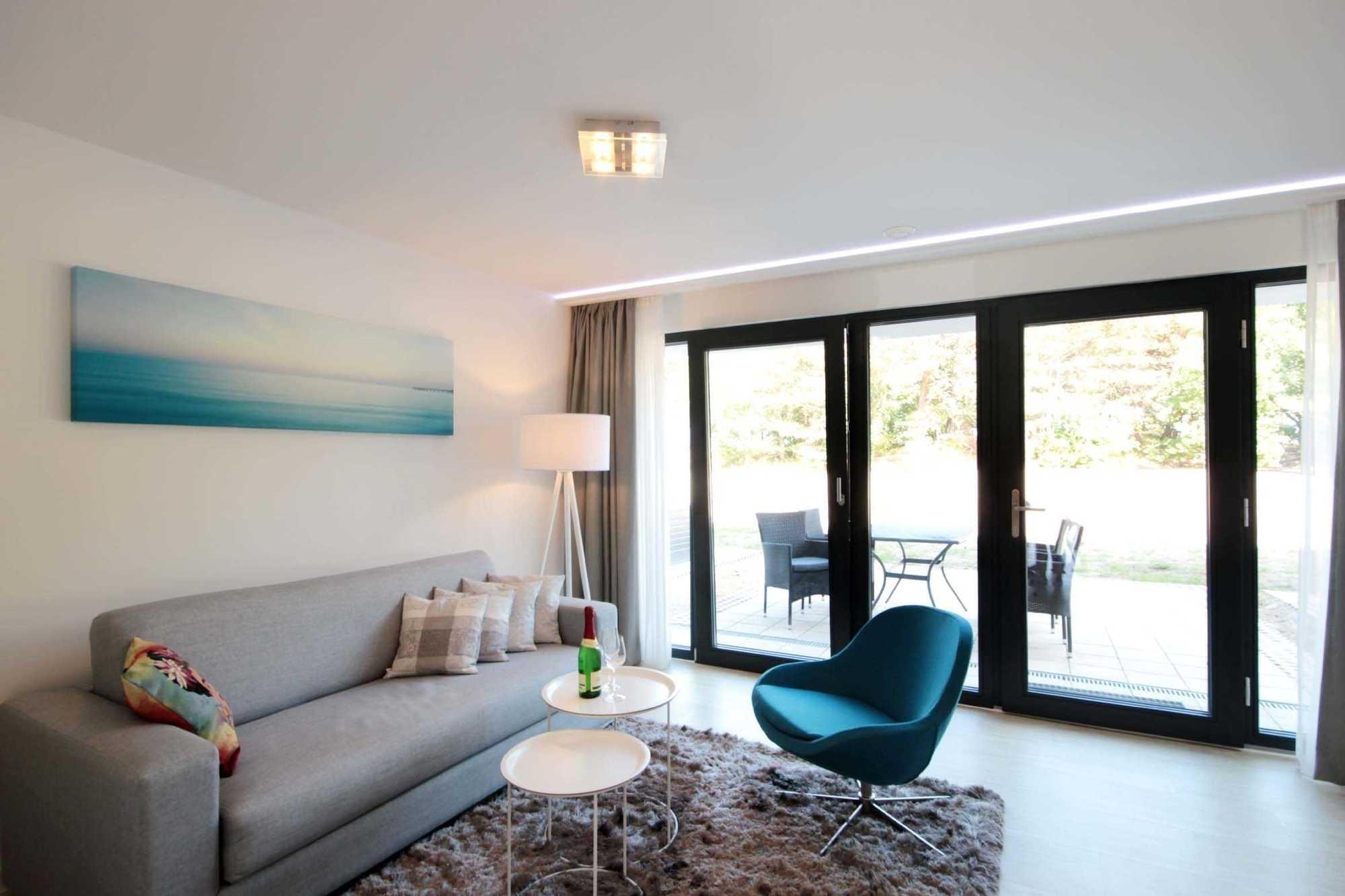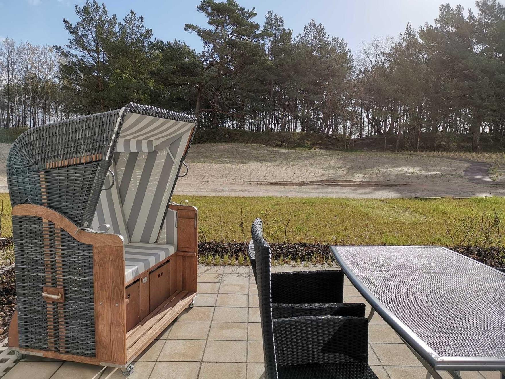 Ihre hochmoderne Wohnung 110RB6 liegt im Erdgeschoss und verfügt über einen separaten Eingang. Die 2-Raum-Wohnung mit Ihren 50 qm ist mit bis zu 4 Personen + 1 Vierbeiner belegbar und besticht durch ihre zwei schönen Außenterrassen, eine mit wohnungseigenem Strandkorb (Mai-Sept.) und Blick zum Kiefernwald sowie Ostseedünen. Die hochwertige, attraktive Ausstattung trägt zur Entschleunigung für einen erholsamen Aufenthalt bei.