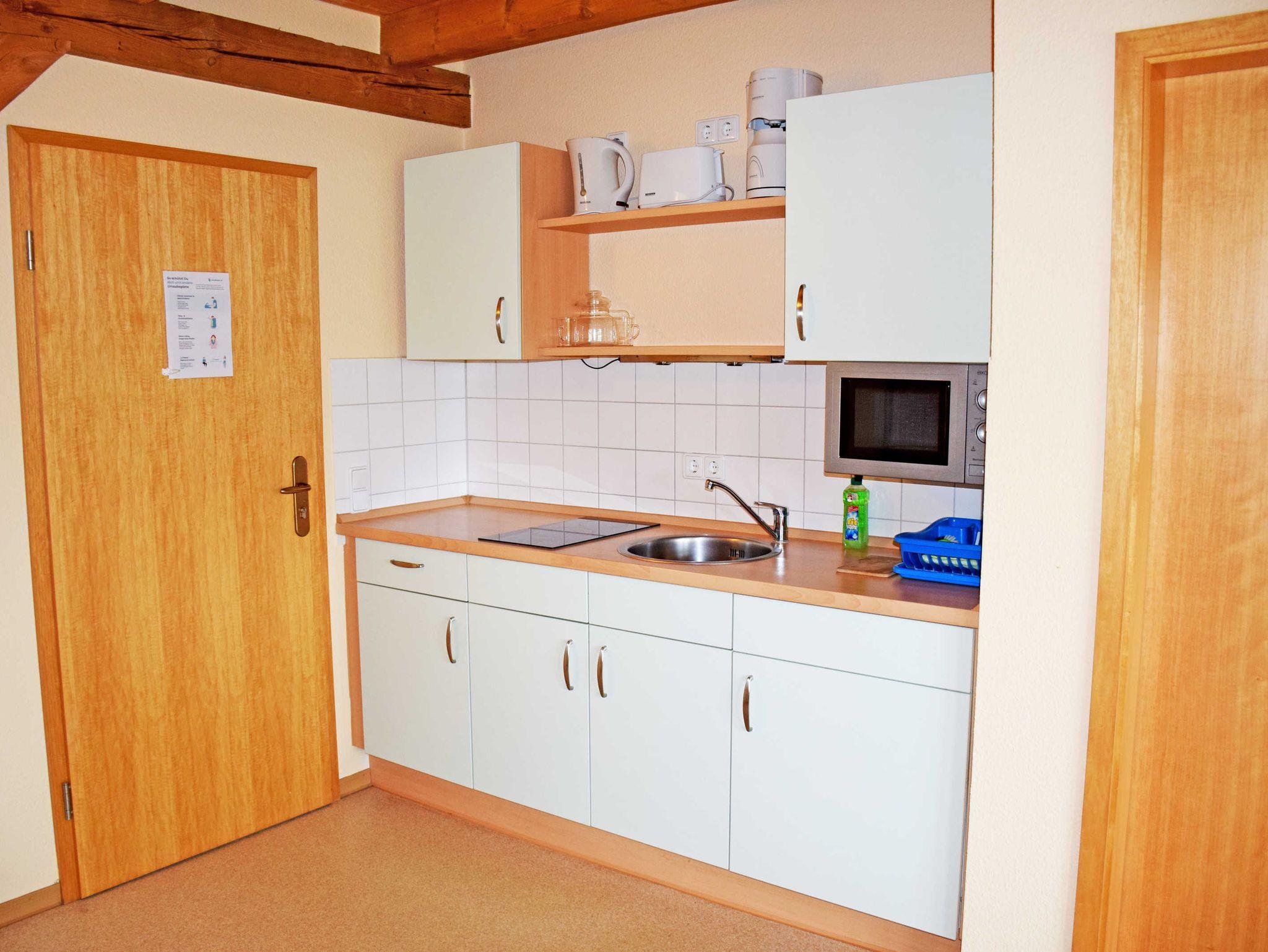 Im Wohn-/Schlafraum befinden sich eine Sitzgelegenheit mit Tisch und ein TV-Gerät sowie ein bequemes Doppelbett mit Nachttischen und Leselampen. Hier steht auch Esstisch mit Sitzgelegenheiten. Die moderne Küchenzeile ist mit einem Herd, Mikrowelle, Wasserkocher, Kaffeemaschine, Toaster und Kühlschrank komplett ausgestattet. In dieser Wohnung kann bei Bedarf ein Zustellbett für einen weiteren Gast bereit gestellt werden. Ein kleines Kinderreisebett und ein Hochstuhl können auf Wunsch ebenfalls kostenlos bereit gestellt werden. Bei Ihrer Anreise sind die Betten bereits mit Bettwäsche bezogen, Handtücher können gegen eine Gebühr zugebucht werden. Das Bad ist mit Dusche, Handtuchwärmer, WC und Waschtisch ausgestattet und verfügt über Tageslicht.