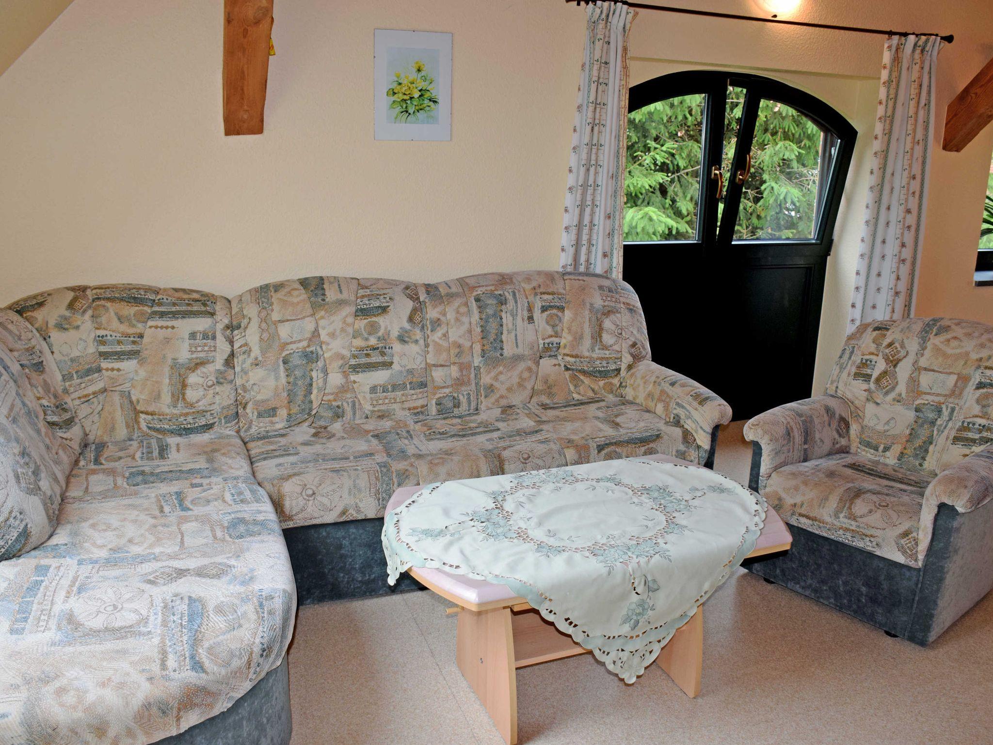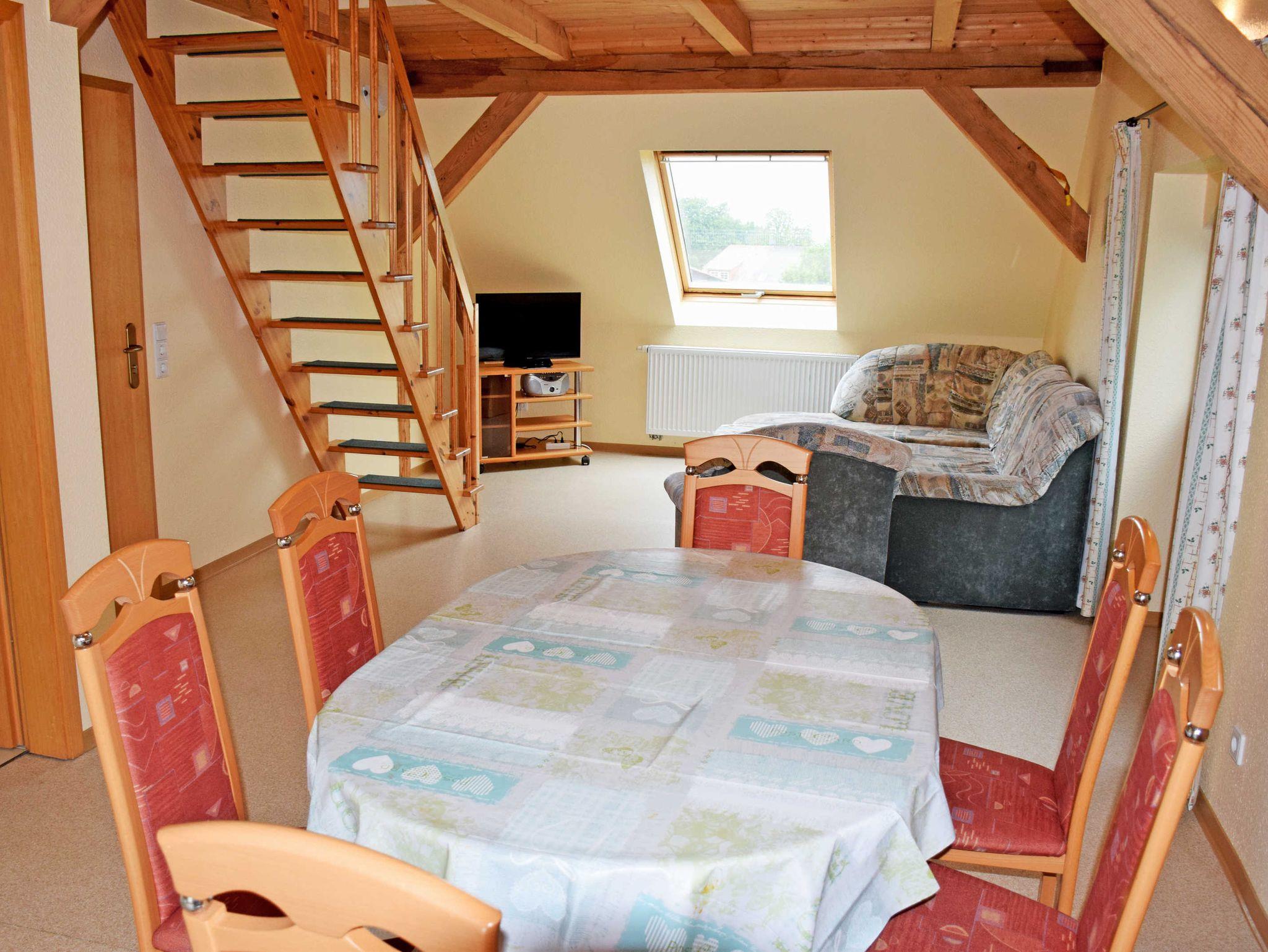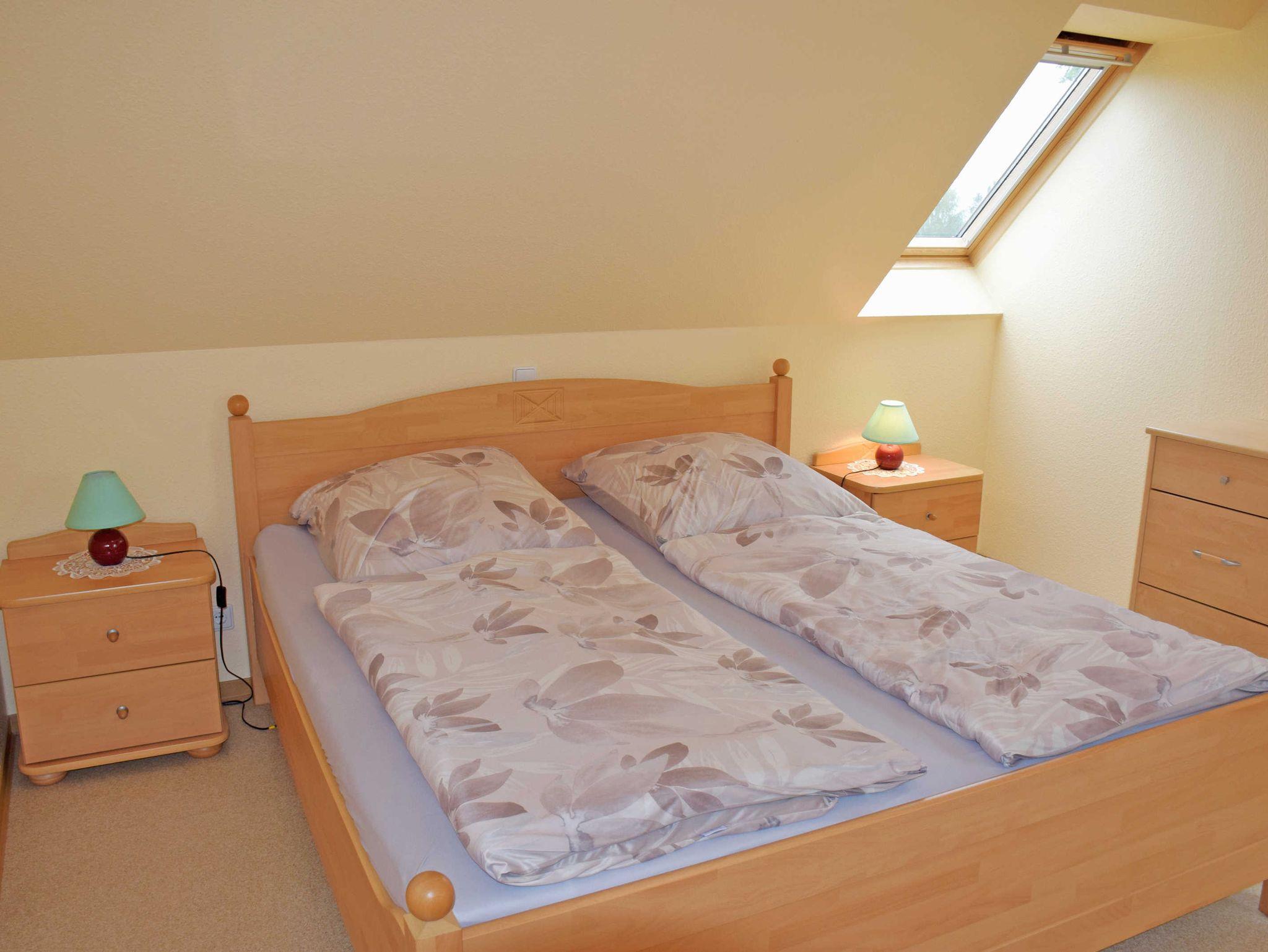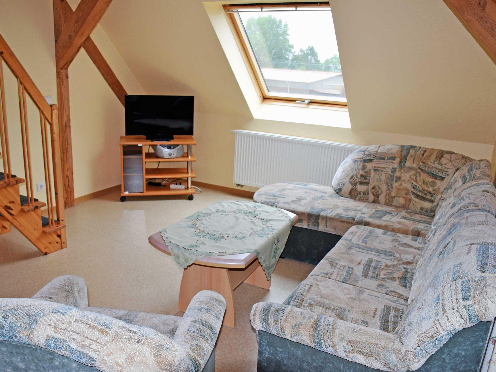 Im Wohnraum befinden sich eine Sitzcouch mit Tisch und ein TV-Gerät. Die Couch kann bei Bedarf für einen Gast aufgebettet werden. Im Wohnzimmer steht auch ein Esstisch mit Sitzgelegenheiten. Die moderne Küchenzeile ist mit einem Herd, Mikrowelle, Wasserkocher, Kaffeemaschine, Toaster und Kühlschrank komplett ausgestattet. Im ausgebauten Spitzboden befinden sich ein Schlafzimmer mit einem bequemen Doppelbett, Nachttischen und Leselampen sowie einen Kleiderschrank und im zweiten Schlafzimmer zwei Einzelbetten. Ein kleines Kinderreisebett und ein Hochstuhl können auf Wunsch kostenlos bereit gestellt werden.