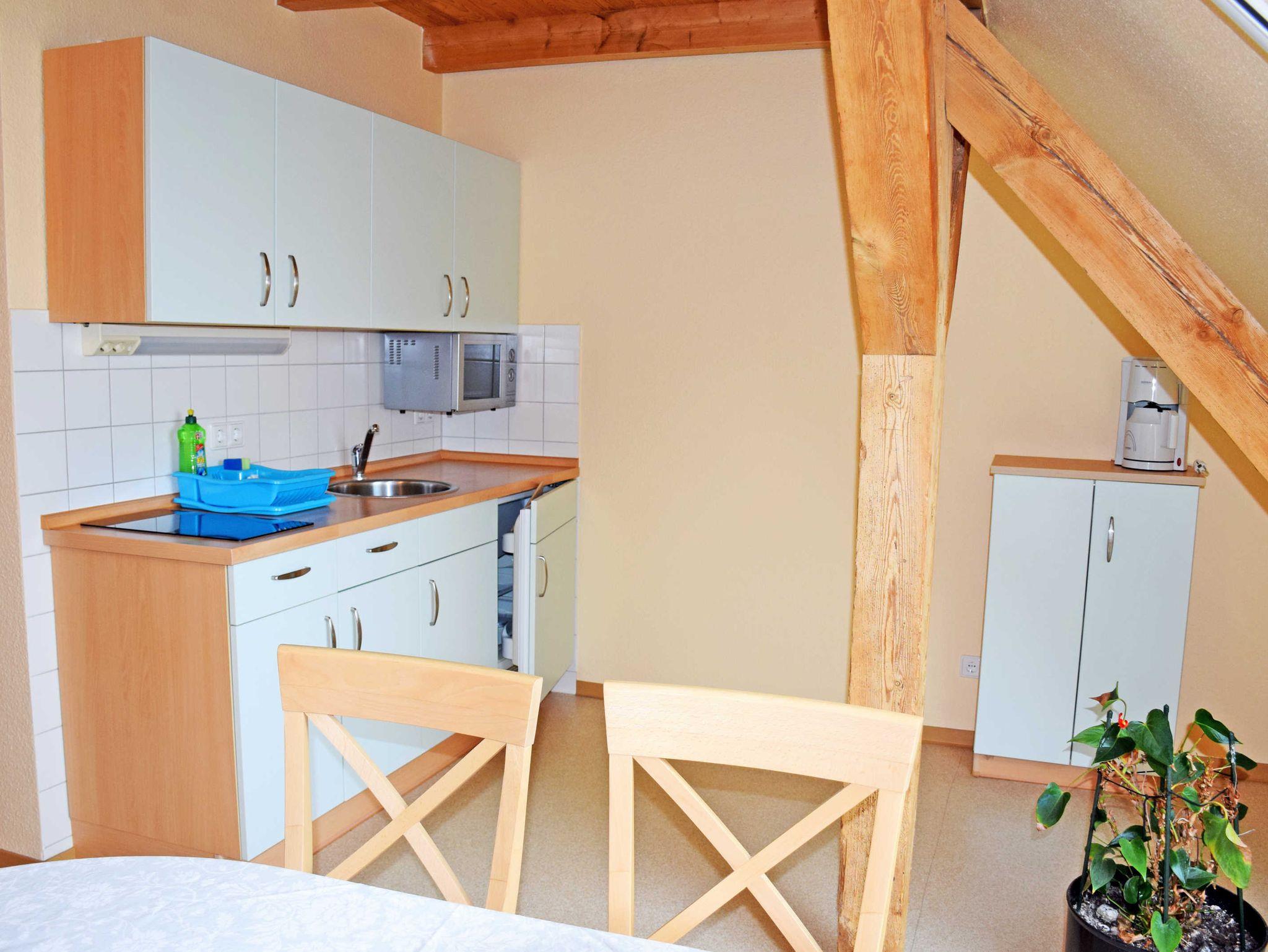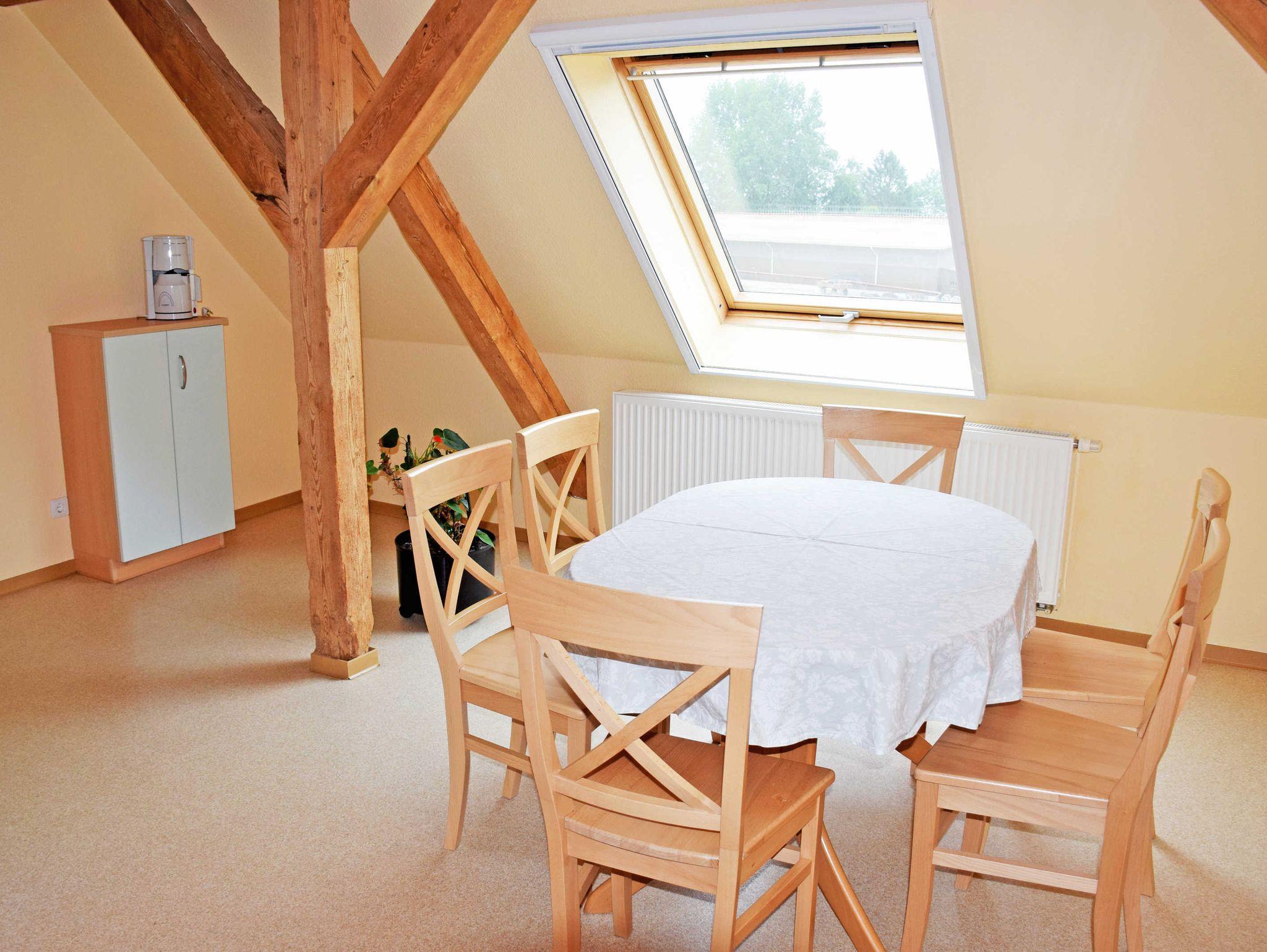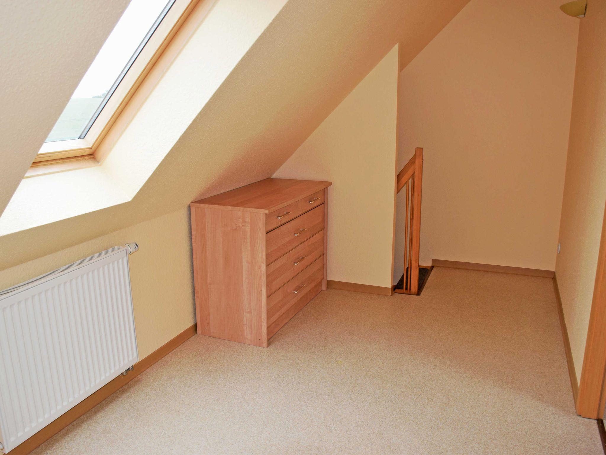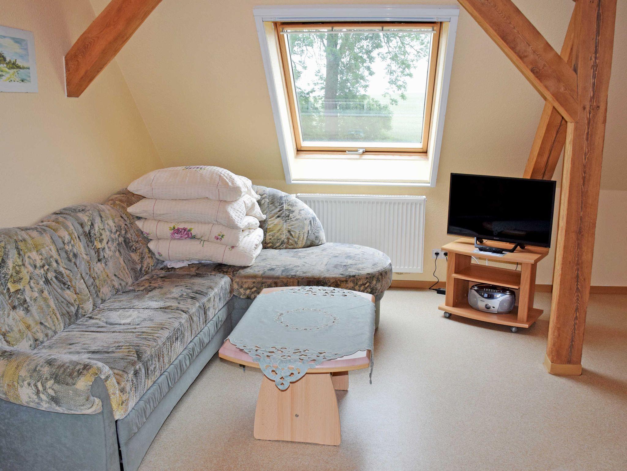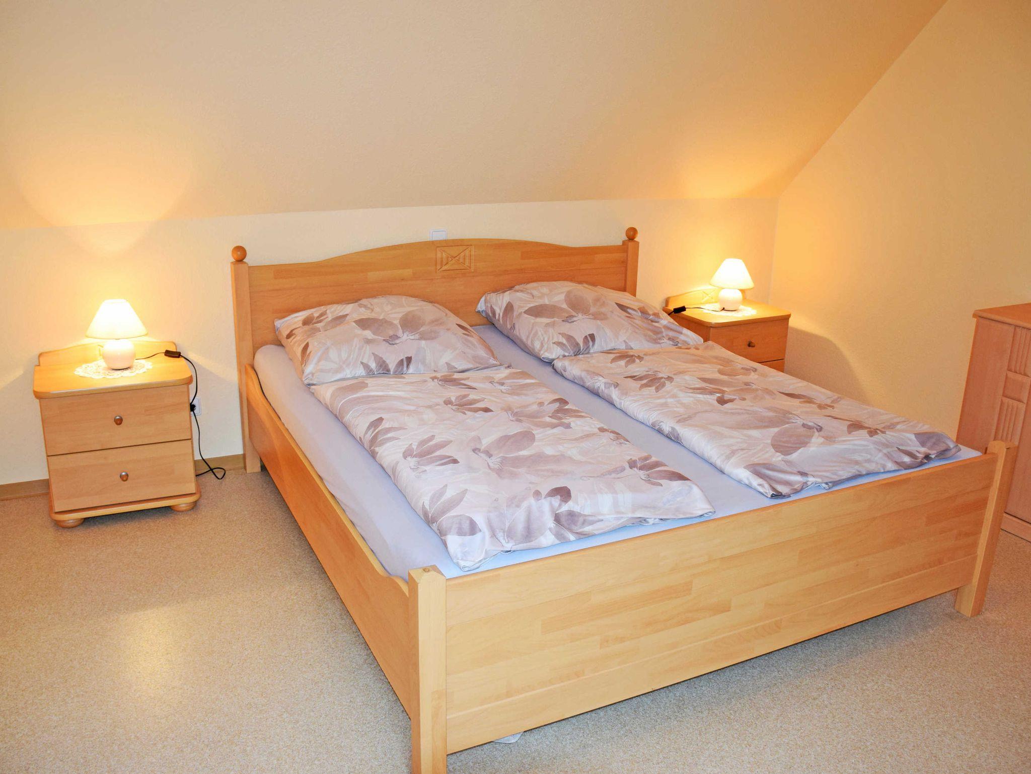 Im Wohnraum befinden sich eine Sitzcouch mit Tisch und ein TV-Gerät. Die Couch kann bei Bedarf für einen Gast aufgebettet werden. Im Wohnzimmer steht auch ein Esstisch mit Sitzgelegenheiten. Die moderne Küchenzeile ist mit einem Herd, Mikrowelle, Wasserkocher, Kaffeemaschine, Toaster und Kühlschrank komplett ausgestattet. Im ausgebauten Spitzboden befinden sich ein Schlafzimmer mit einem bequemen Doppelbett, Nachttischen und Leselampen sowie einen Kleiderschrank und im zweiten Schlafzimmer zwei Einzelbetten. Ein kleines Kinderreisebett und ein Hochstuhl können auf Wunsch kostenlos bereit gestellt werden.