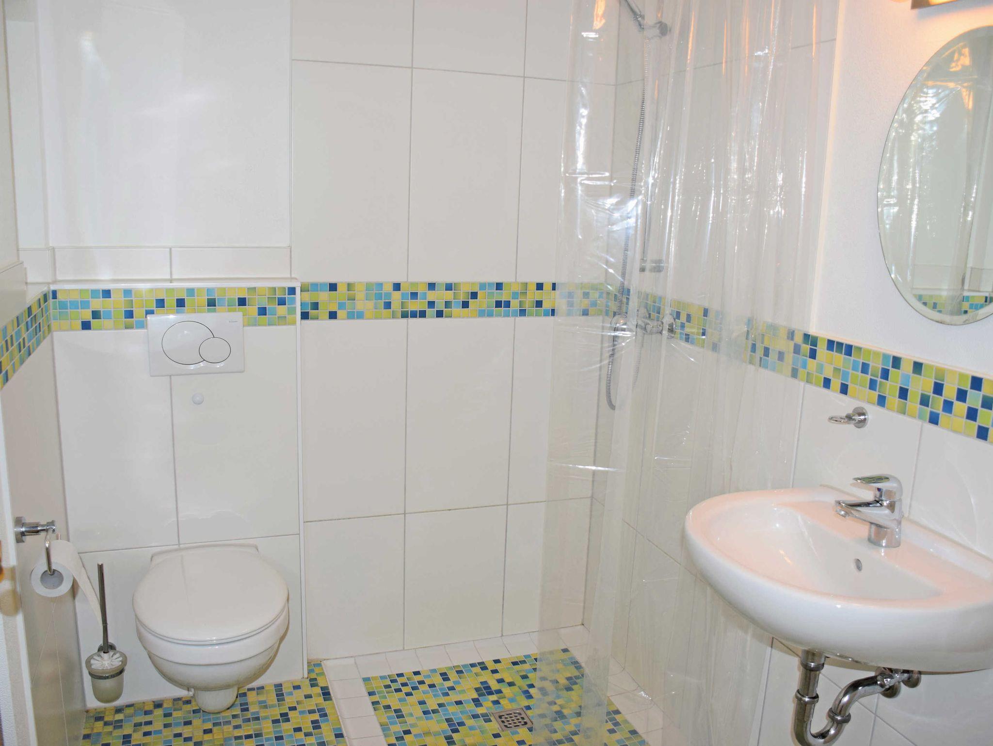 Das Bad ist mit Dusche, Handtuchwärmer, WC und Waschtisch ausgestattet und verfügt über Tageslicht. Zum dieser Ferienwohnung gehört eine Terrasse mit Gartenmöbeln und Grillmöglichkeit.