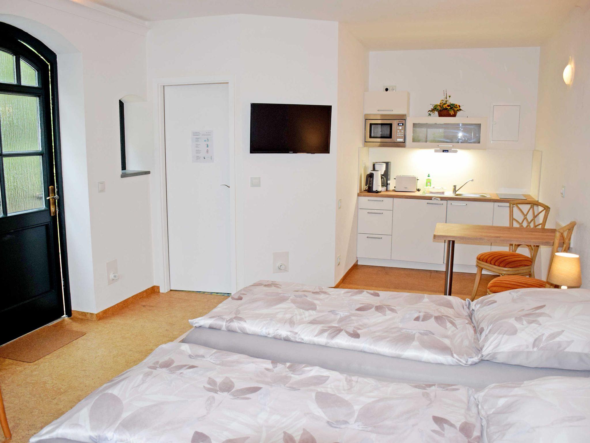 Im Wohn-/Schlafraum befinden sich eine Sitzgelegenheit mit Tisch und ein modernes Flachbild-TV-Gerät sowie ein bequemes Doppelbett mit Nachttischen und Leselampen. Hier steht auch Esstisch mit Sitzgelegenheiten. Die moderne Küchenzeile ist mit einem Herd, Mikrowelle, Wasserkocher, Kaffeemaschine, Toaster und Kühlschrank komplett ausgestattet. Bei Ihrer Anreise sind die Betten bereits mit Bettwäsche aufbezogen, Handtücher können gegen eine Gebühr zugebucht werden.