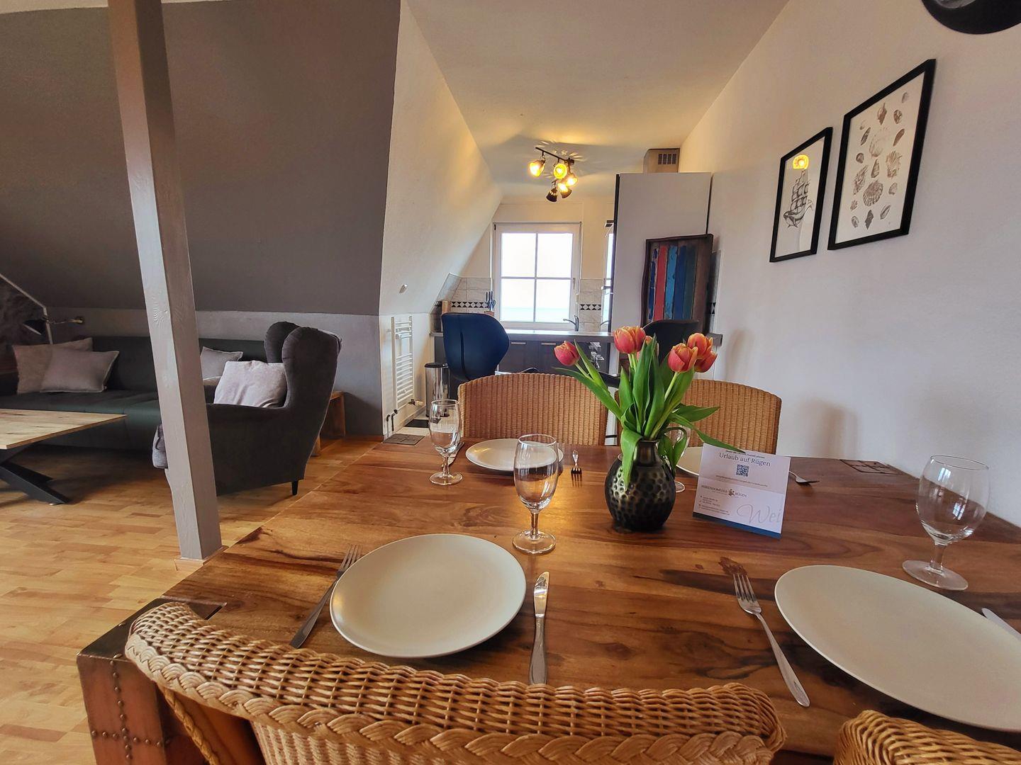 Nur ein paar Schritte vom Naturstrand entfernt öffnet die Ferienwohnung Blick auf Vilm den Blick auf Wasser, Weite und die stille Silhouette der Insel Vilm. Morgens fällt das erste Licht auf den Balkon, abends glüht der Horizont über der Bucht. Ein Kamin, zwei gemütliche Schlafzimmer und viel Raum zum Durchatmen machen diese Wohnung zu einem warmen Rückzugsort für Tage voller Küstenruhe.