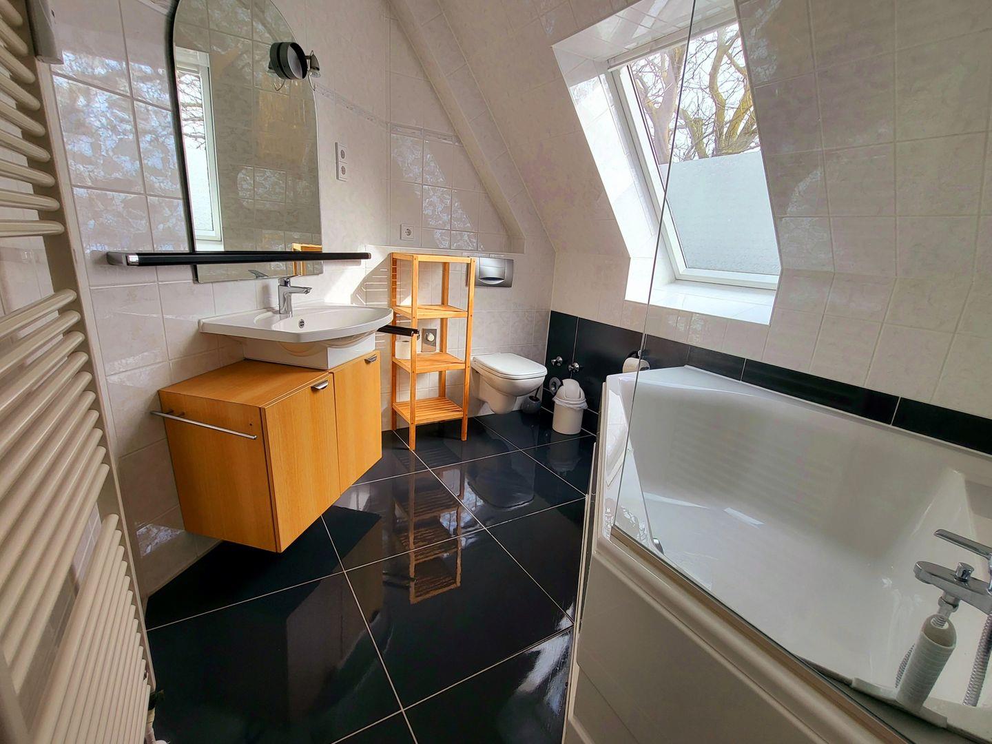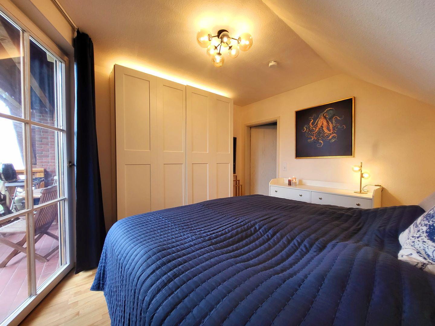 Auf dieser Ebene liegt auch ein komfortables Schlafzimmer mit Doppelbett und eigenem Balkonzugang. Das moderne Tageslichtbad mit Badewanne bietet zusätzlichen Komfort. Ein weiteres Schlafzimmer mit Doppelbett befindet sich im ausgebauten Spitzboden – gemütlich, ruhig und ideal für längere Aufenthalte.