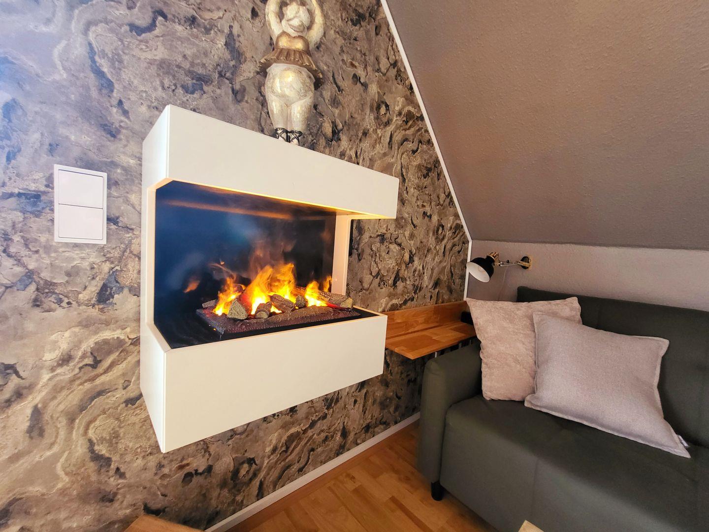 Das Herz des Hauses ist der stilvolle Wohn- und Essbereich, der mit seiner warmen Atmosphäre sofort ankommen lässt. Eine hochwertige Küchenzeile lädt zum gemeinsamen Kochen ein, während der Elektrokamin sanftes Licht und gemütliche Abende zaubert. Für entspannte Filmstunden sorgt ein großer 75-Zoll-TV.
