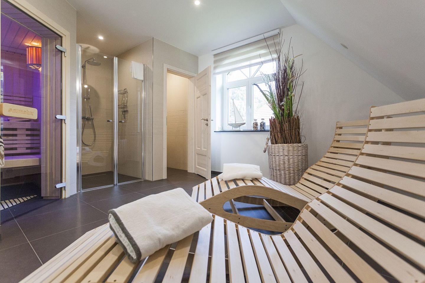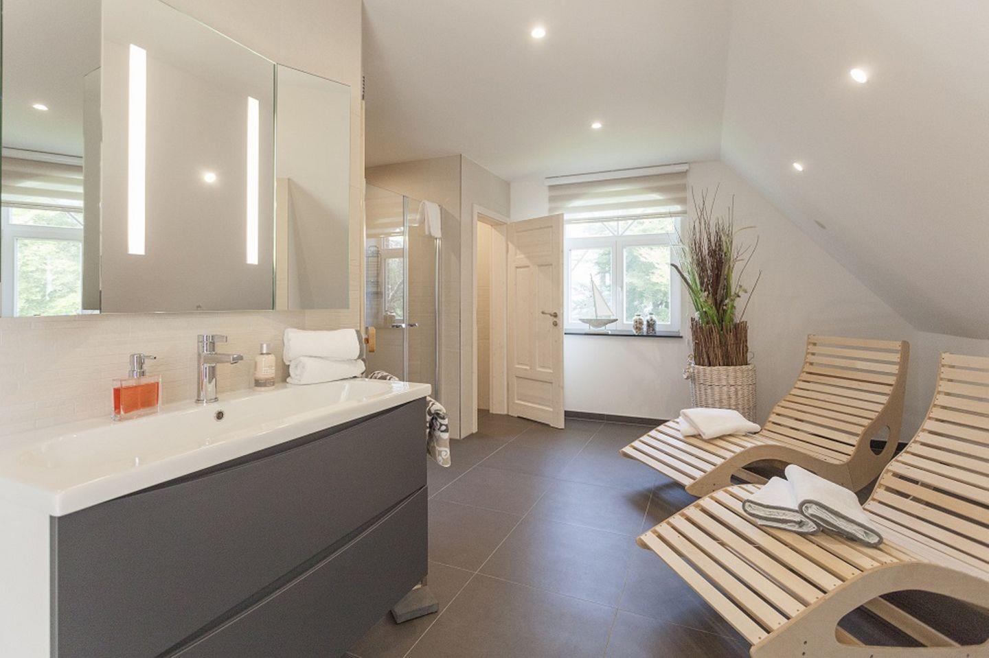 BAD // großes Tageslichtbad im EG mit Dusche, WC und Badewanne, Tageslichtbad im OG mit Dusche, Sauna, Relax-Liegen und WC ++