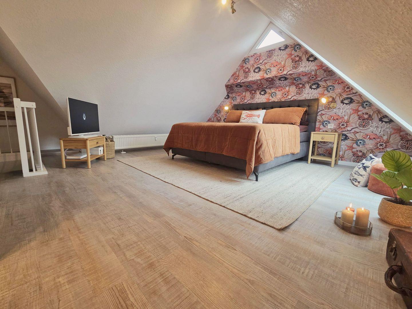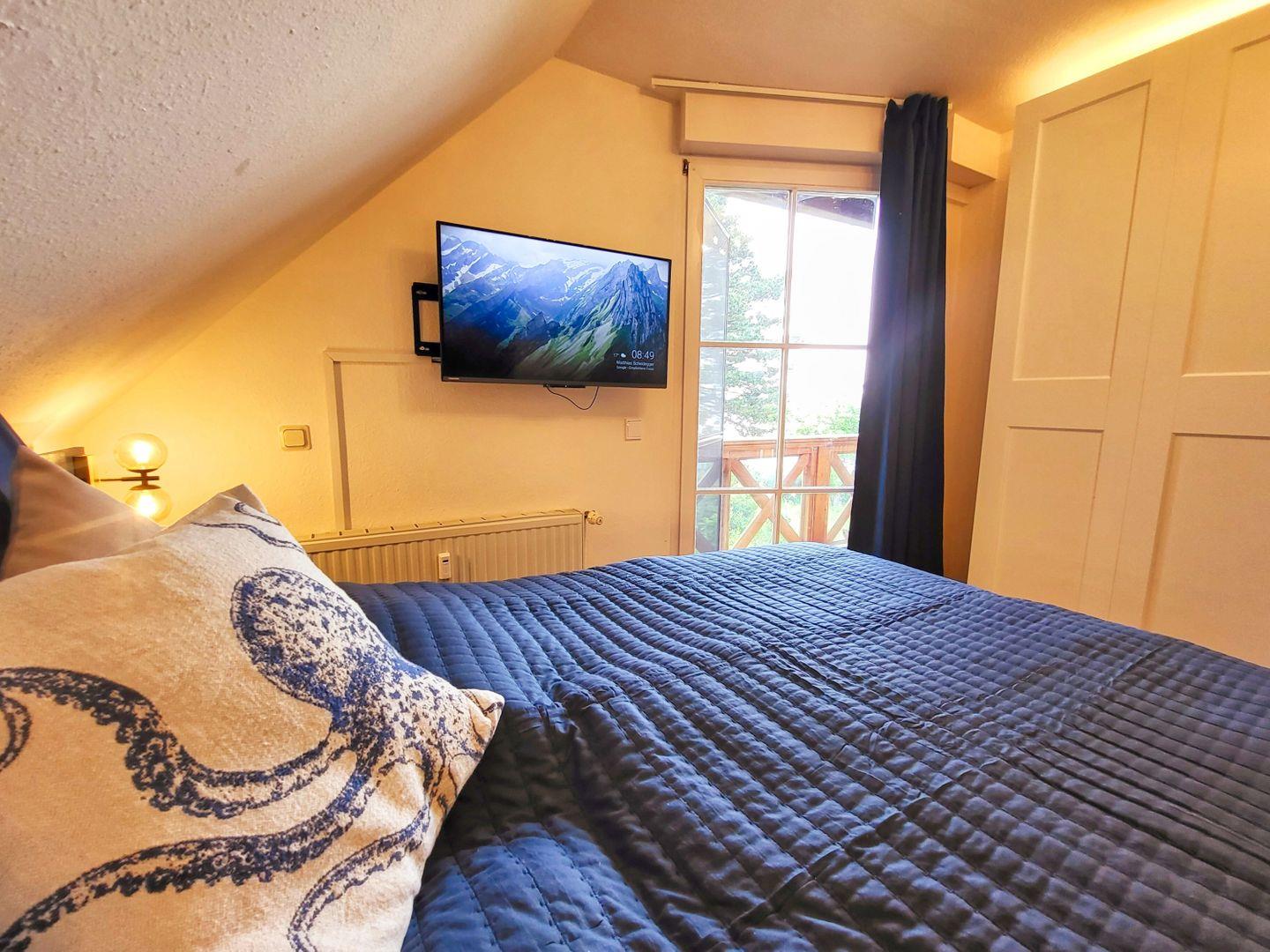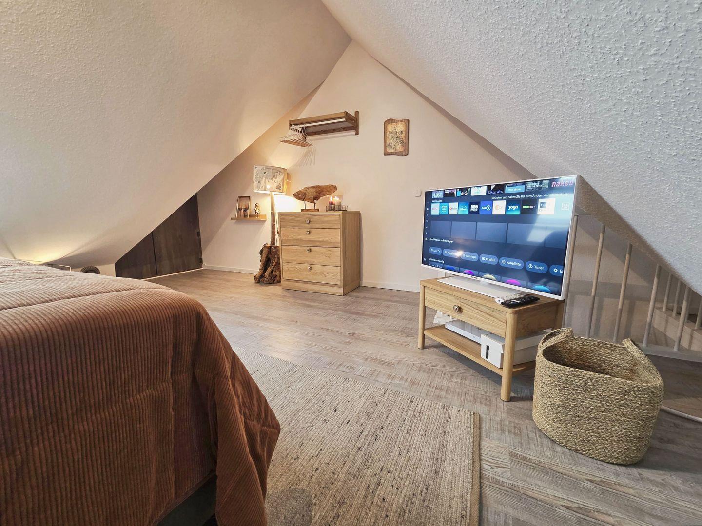 SCHLAFEN // ein Schlafzimmer mit bequemem Doppelbett, SMART-TV im Obergeschoss, ein Schlafzimmer mit bequemem Doppelbett und SMART-TV im DG, Schlafcouch im Wohnzimmer ++