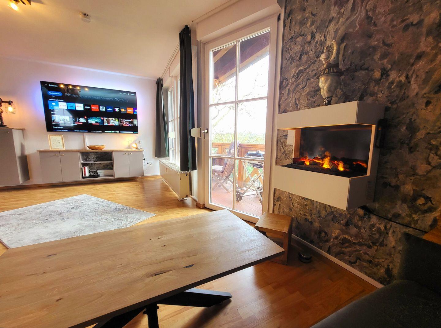 WOHNEN // Wohnraum mit Essbereich, Sitzgarnitur mit bequemer Couch (mit Schlaffunktion), Sessel, Elektrokamin, SMART-TV, Balkon mit Meerblick ++