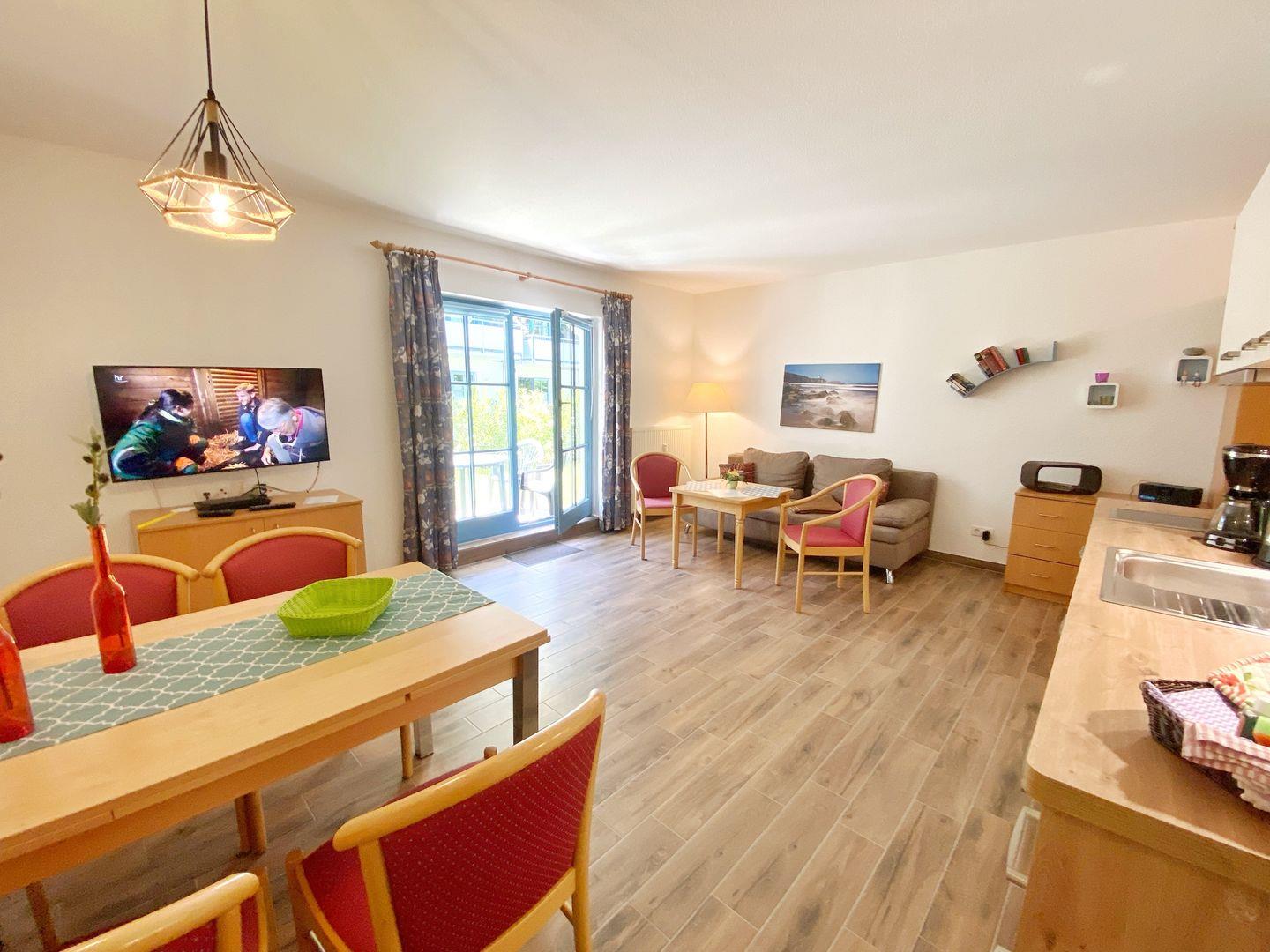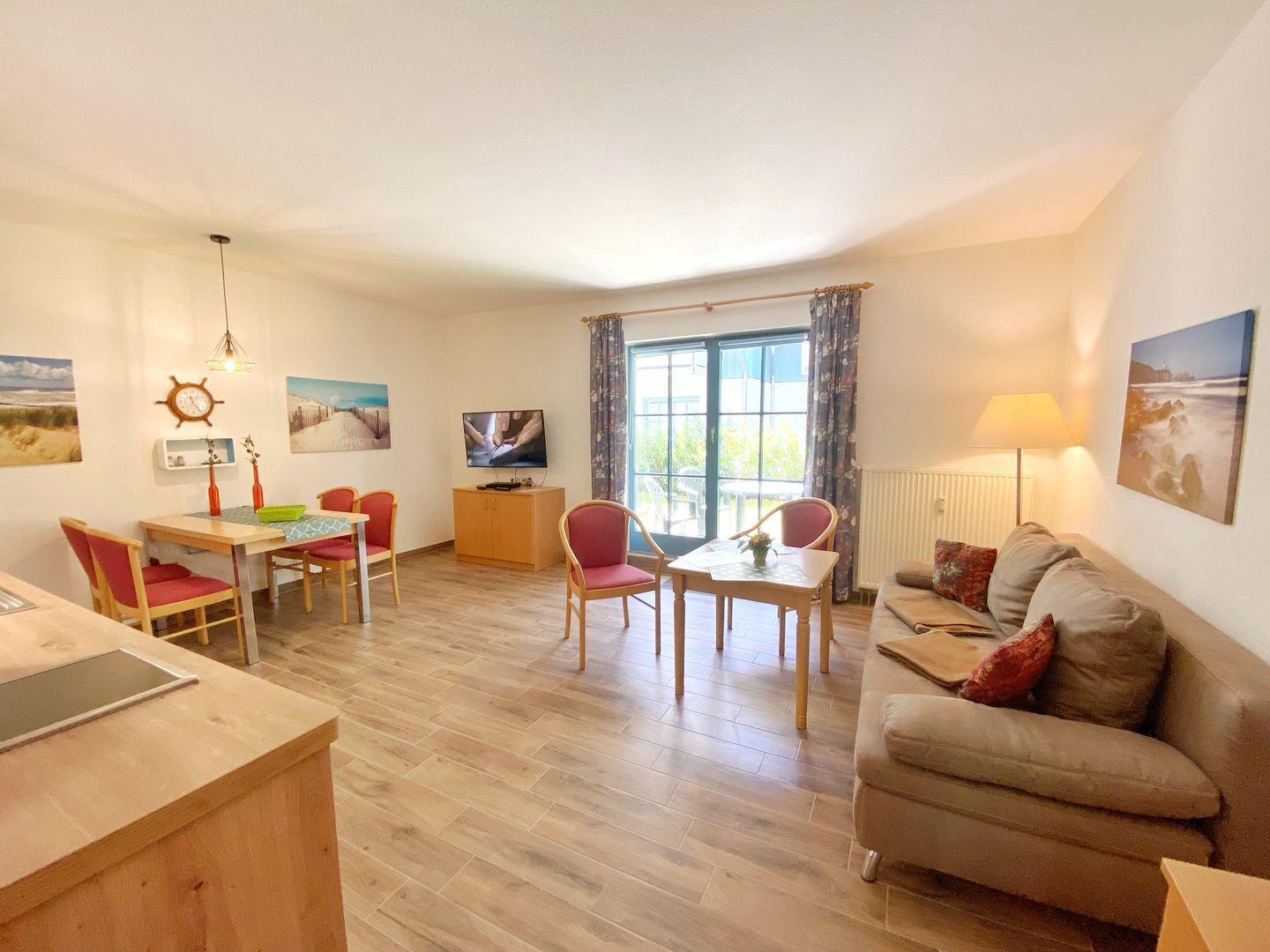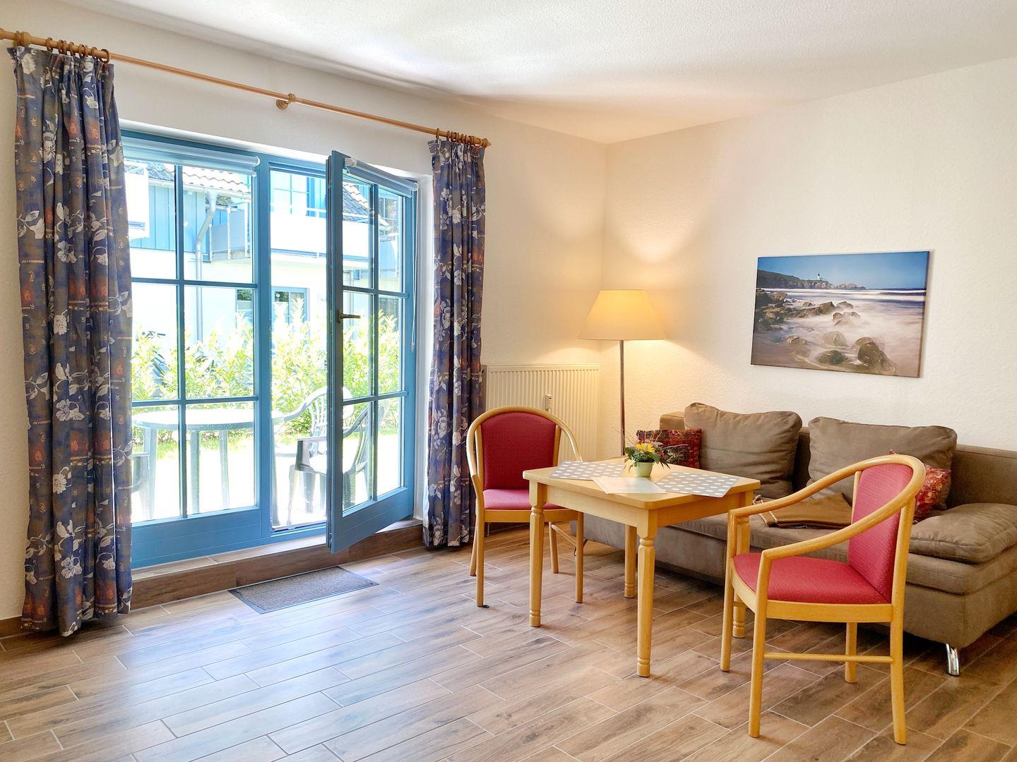 Die 2-Raum-Wohnung Nr. 03 in der Ferienanlage Kap Arkona mit Terrasse ist ausgestattet für 1 bis 4 Personen und hat eine Wohnfläche von ca. 46 m². Die Wohnung ist unterteilt in ein Schlafzimmer mit Doppelbett (1,80m x 2,00 m), ein Wohnzimmer mit integrierter Küchenzeile (Herd, Geschirrspüler), ein Bad mit Dusche sowie eine Diele. Im Wohnzimmer gibt es eine gemütliche Couch mit Bettfunktion für 1-2 Personen, + PKW-Stellplatz direkt am Haus (inklusive) Insgesamt sind die Ferienwohnungen eine kleine Oase der Gemütlichkeit. In der Anlage gibt es mehrere Wohnungen ähnlicher Größe, so dass auch befreundete Personen oder größere Familien hier schön zusammen ihren Urlaub verbringen können.