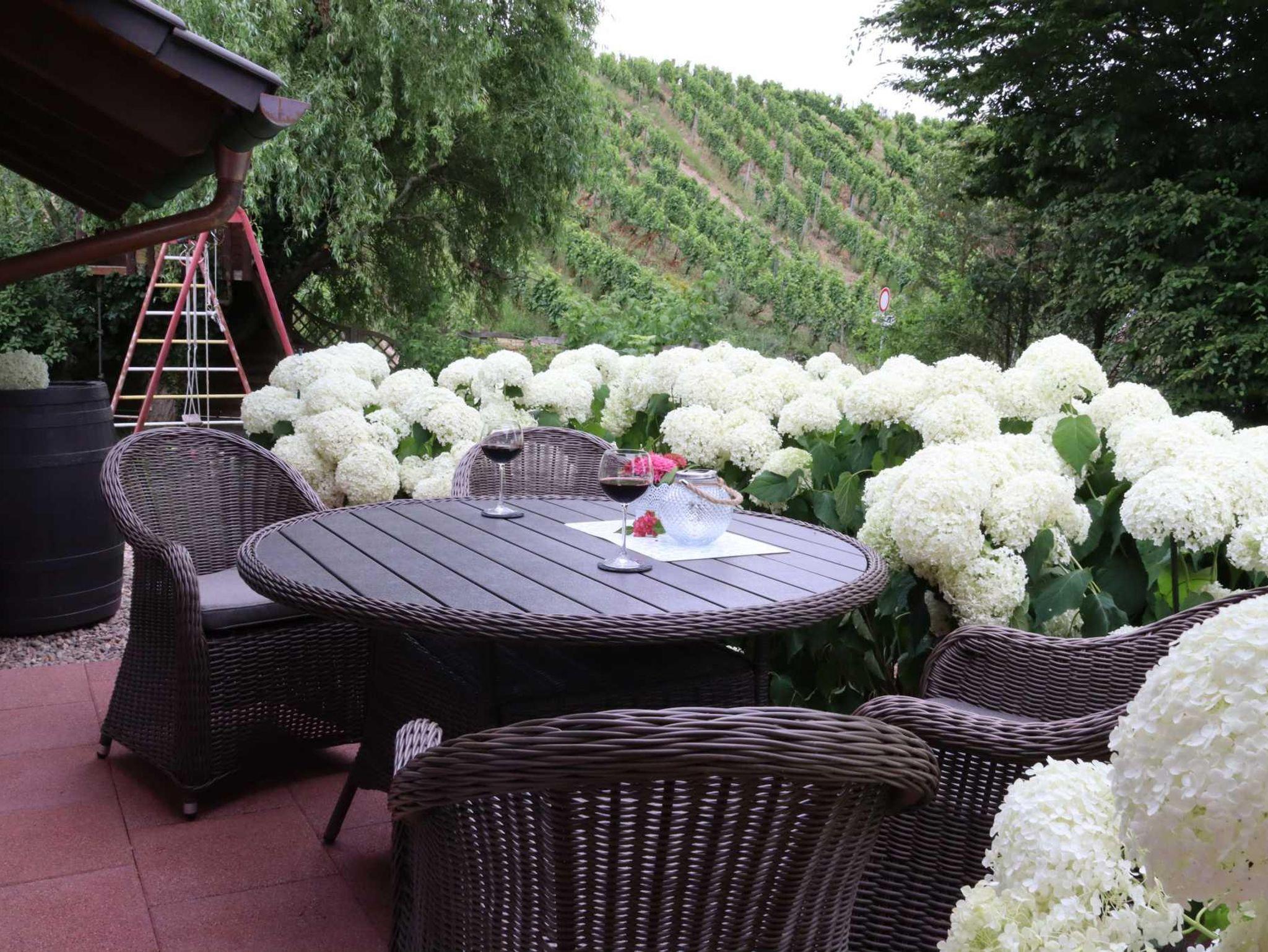 Die Terrasse ist ebenerdig begehbar und bietet einen schönen Ausblick auf die Weinberge und unsere Burg. Im Sommer umrahmen weiße Hortensien den schönen Sitzplatz. Ein Sonnenschirm sorgt an heißen Tagen für Schatten.