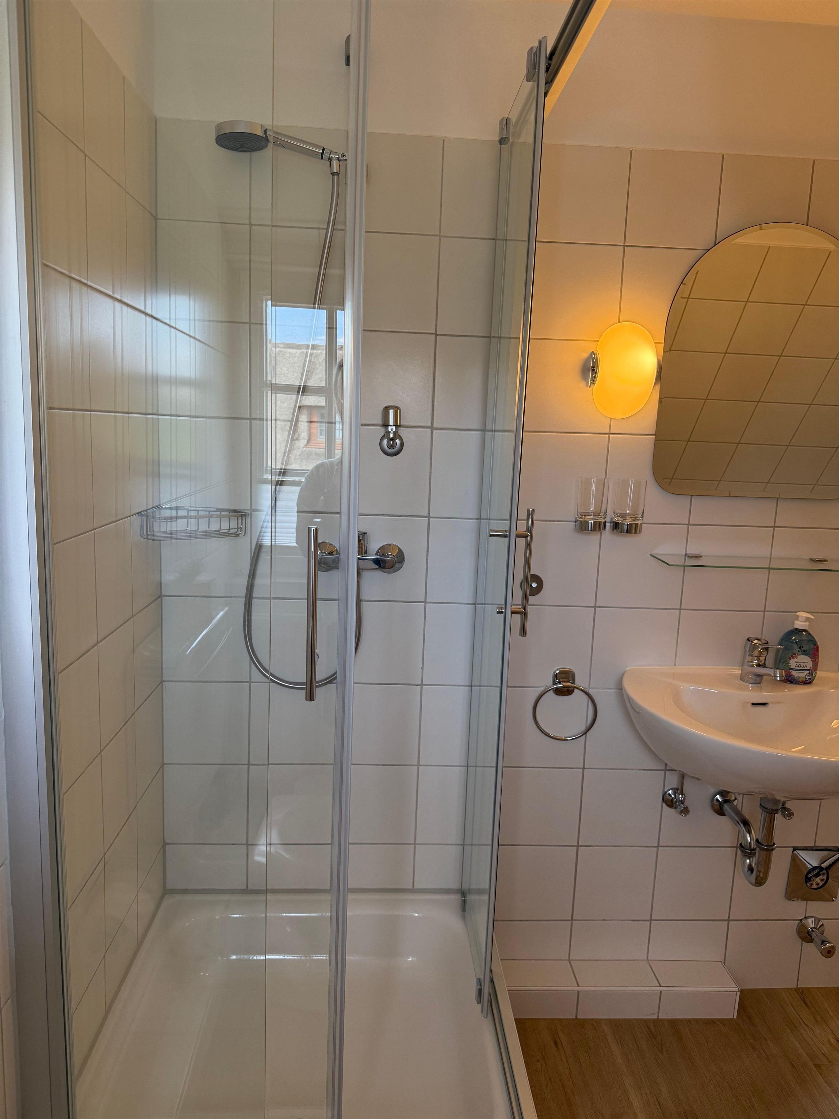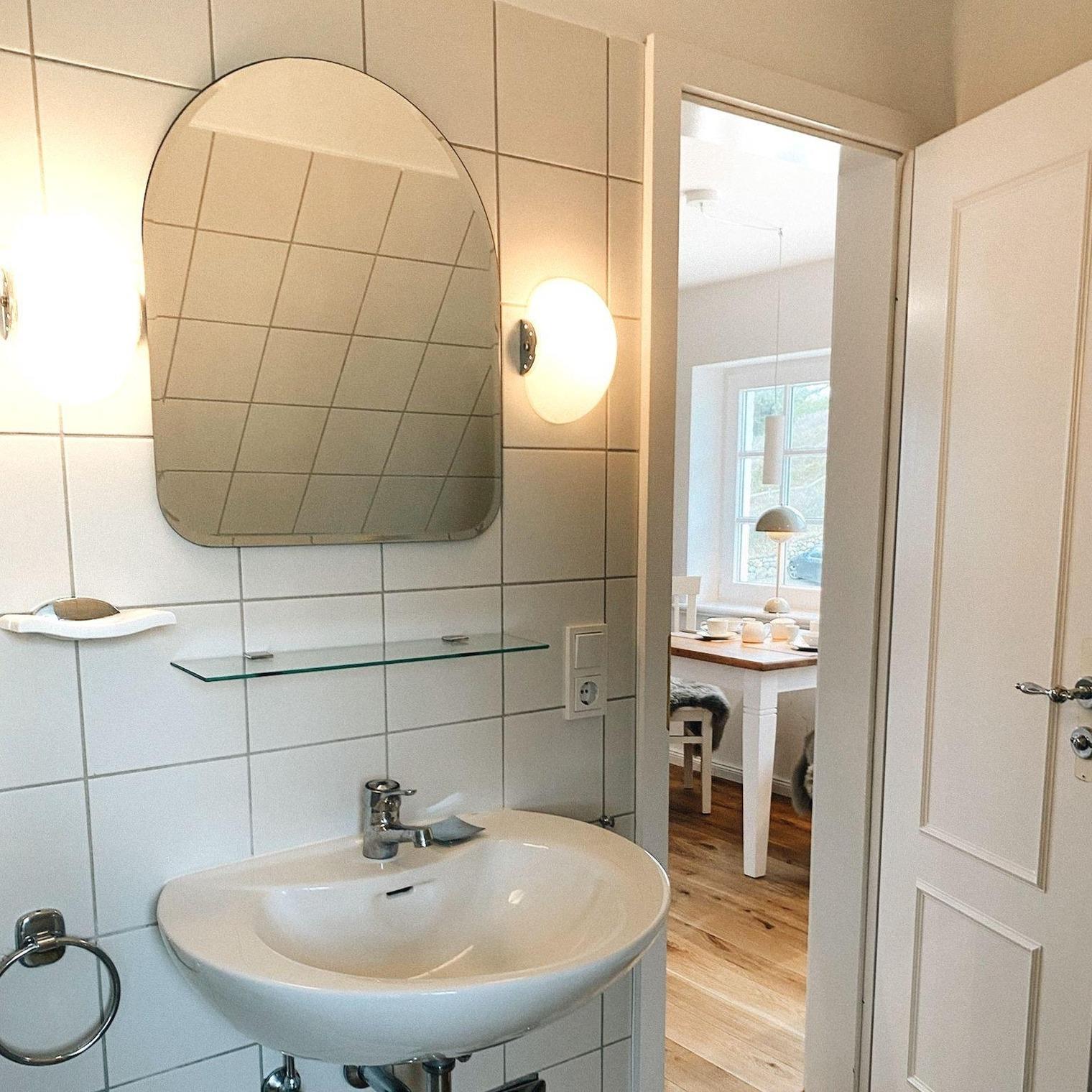 Bad mit Dusche, WC, Föhn und Sprossenfenster mit Blick aufs Meer (Wattseite)