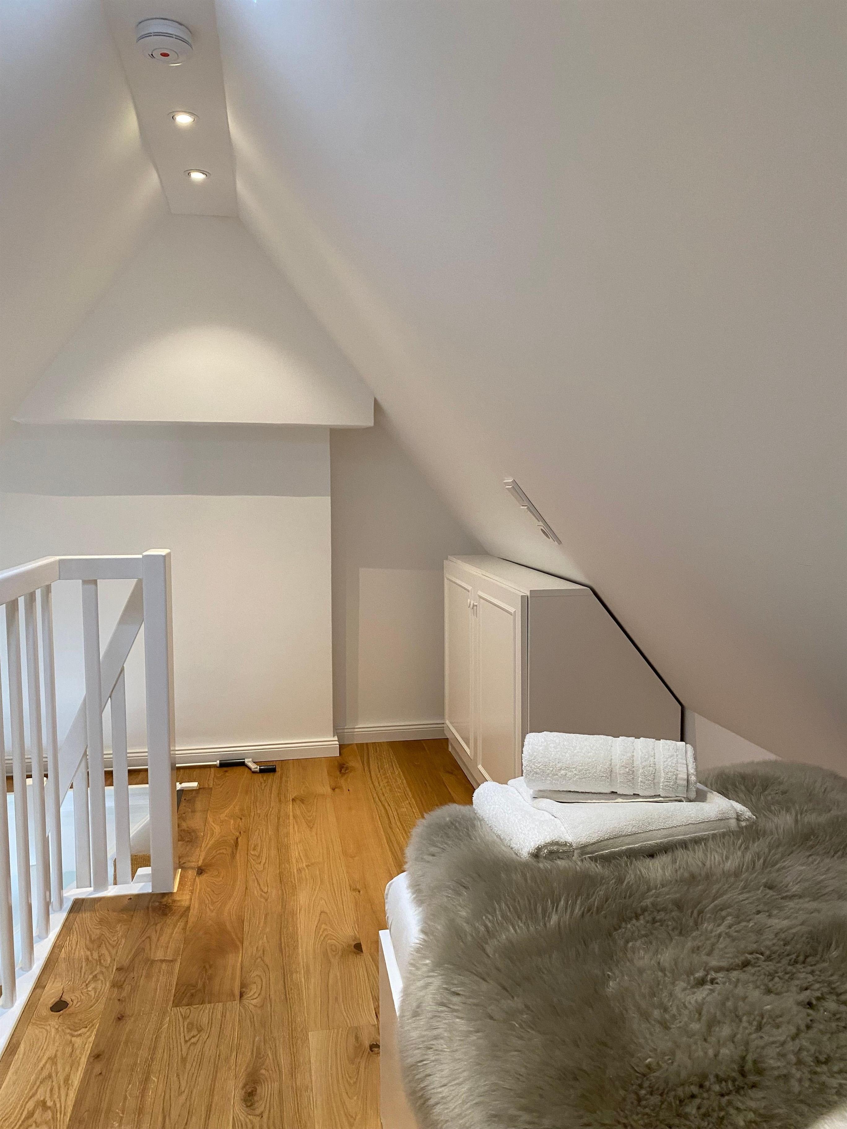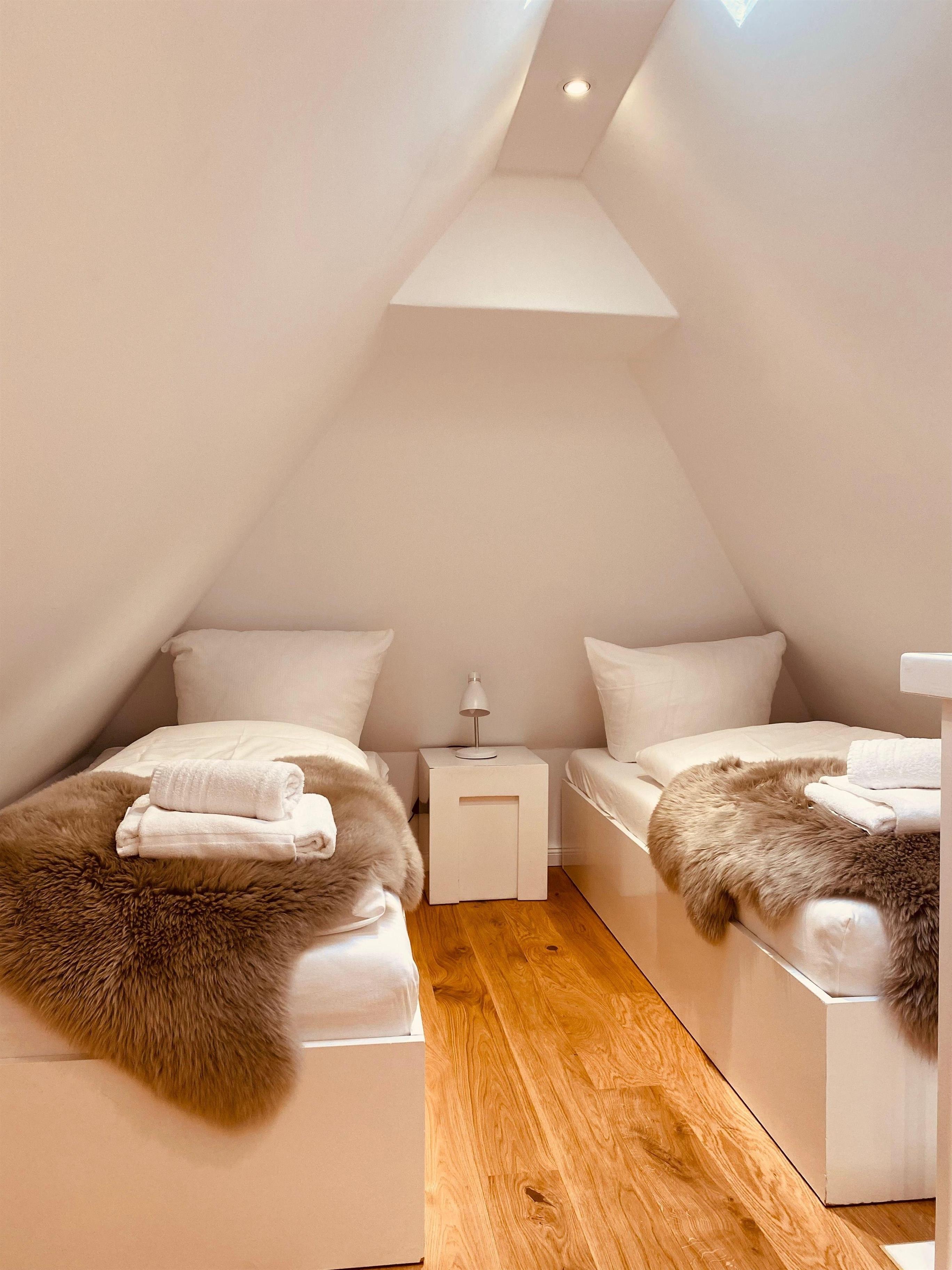 Spitzboden mit kleiner Dachluke und zwei einzelnen Betten mit hochwertigen 90 x 200 m Matratzen.