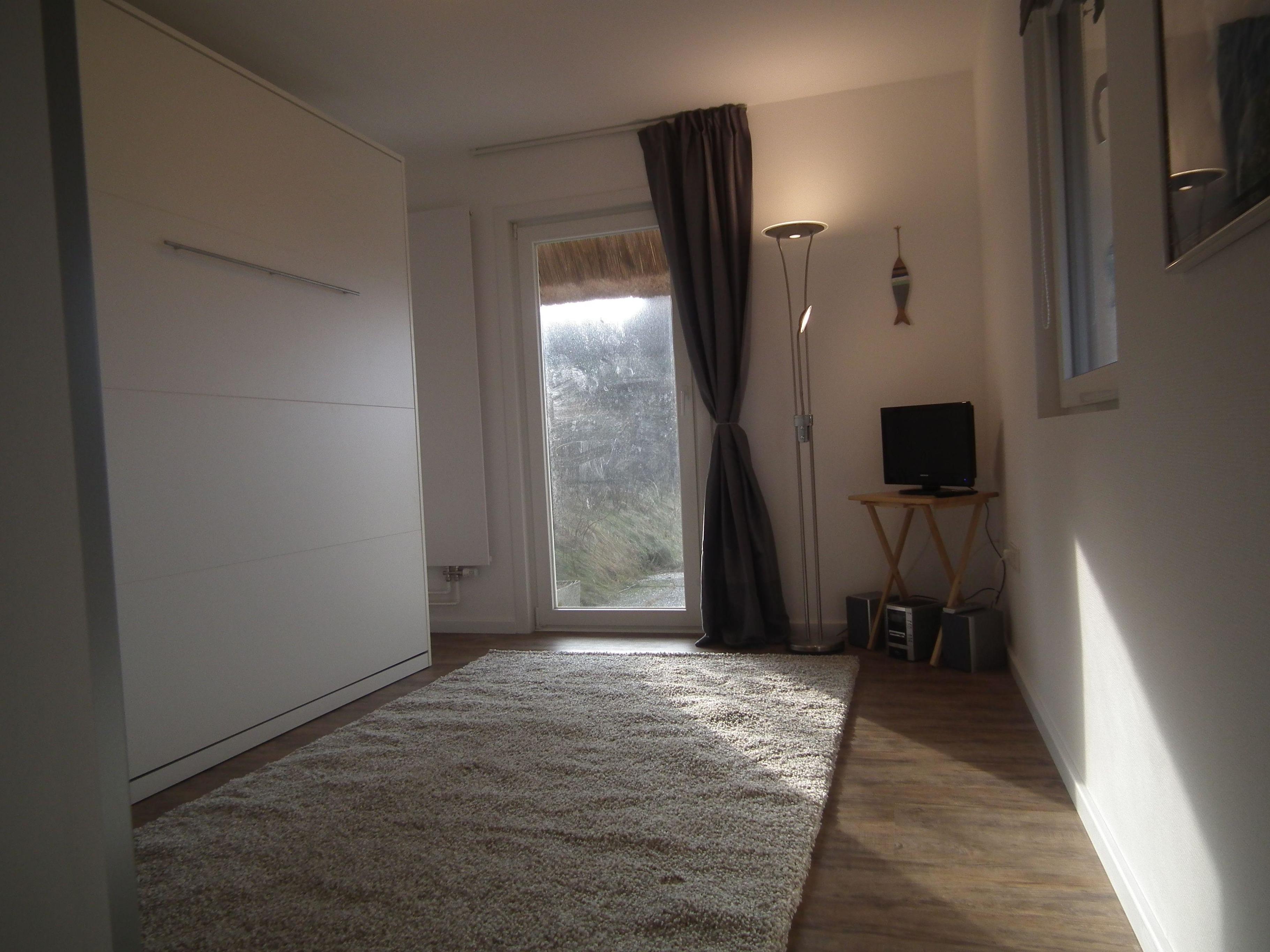 Wenn es einmal etwas stürmischer zugehen sollte, lauschen Sie dem Heulen des Windes in Ihrem gemütlichen Schlafzimmer mit direktem Zugang zum Süd-Garten. Für Ihr(e) Kind(er) oder Besuch(er) steht im Wohn- und Esszimmer mit Mini-Stereoanlage auf Voranmeldung ein Beistellbett zur Verfügung, in der kleinen offenen Küche können Sie sich wunderbar selbst verpflegen.
