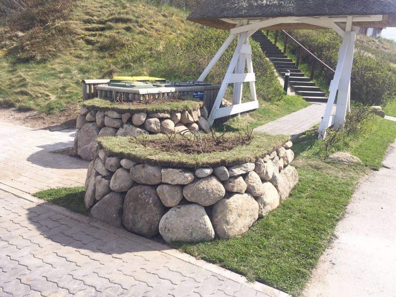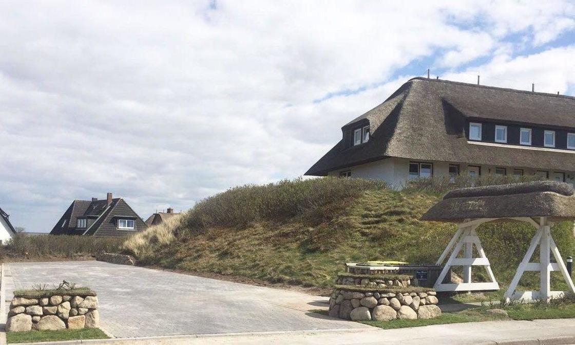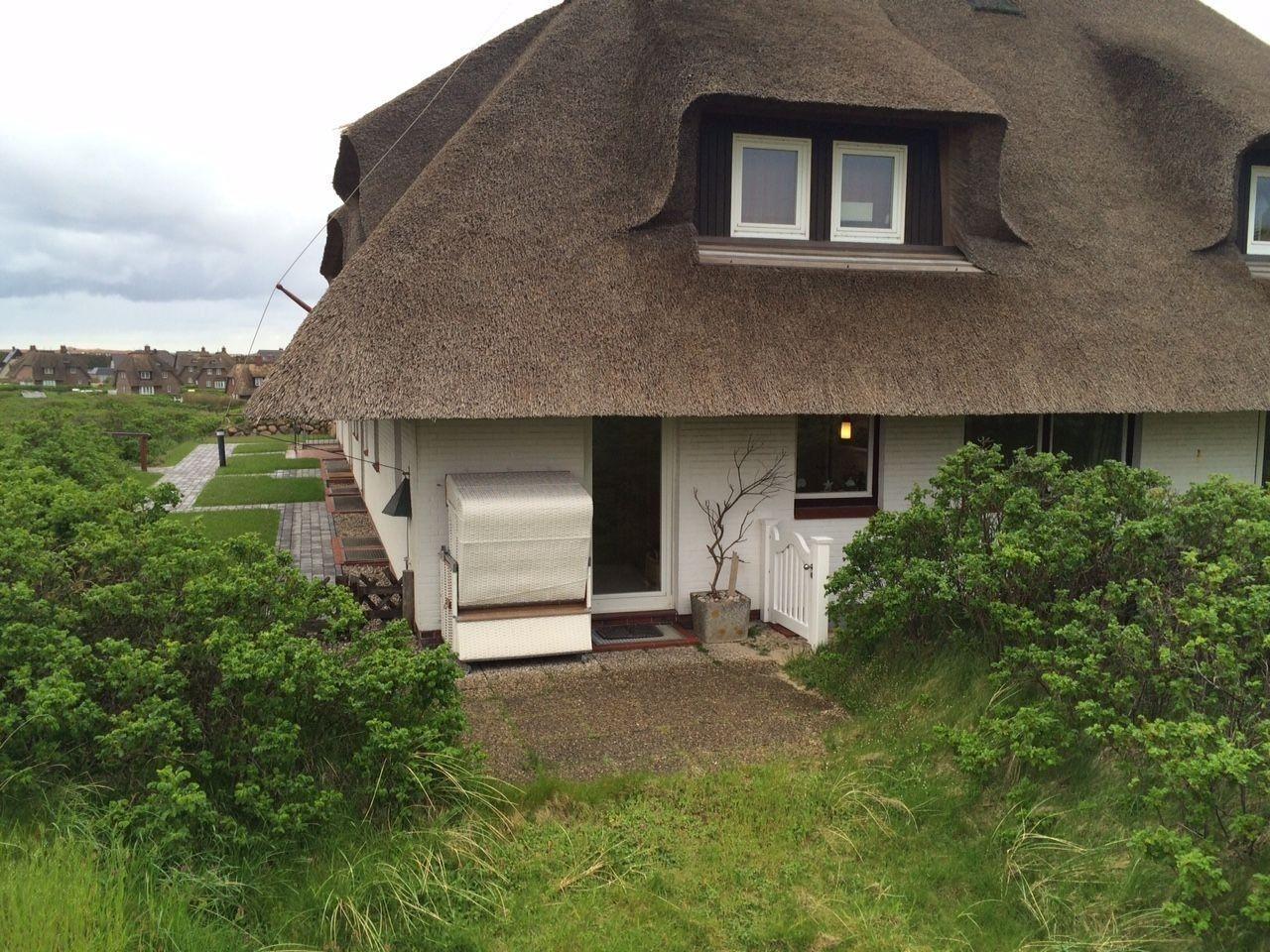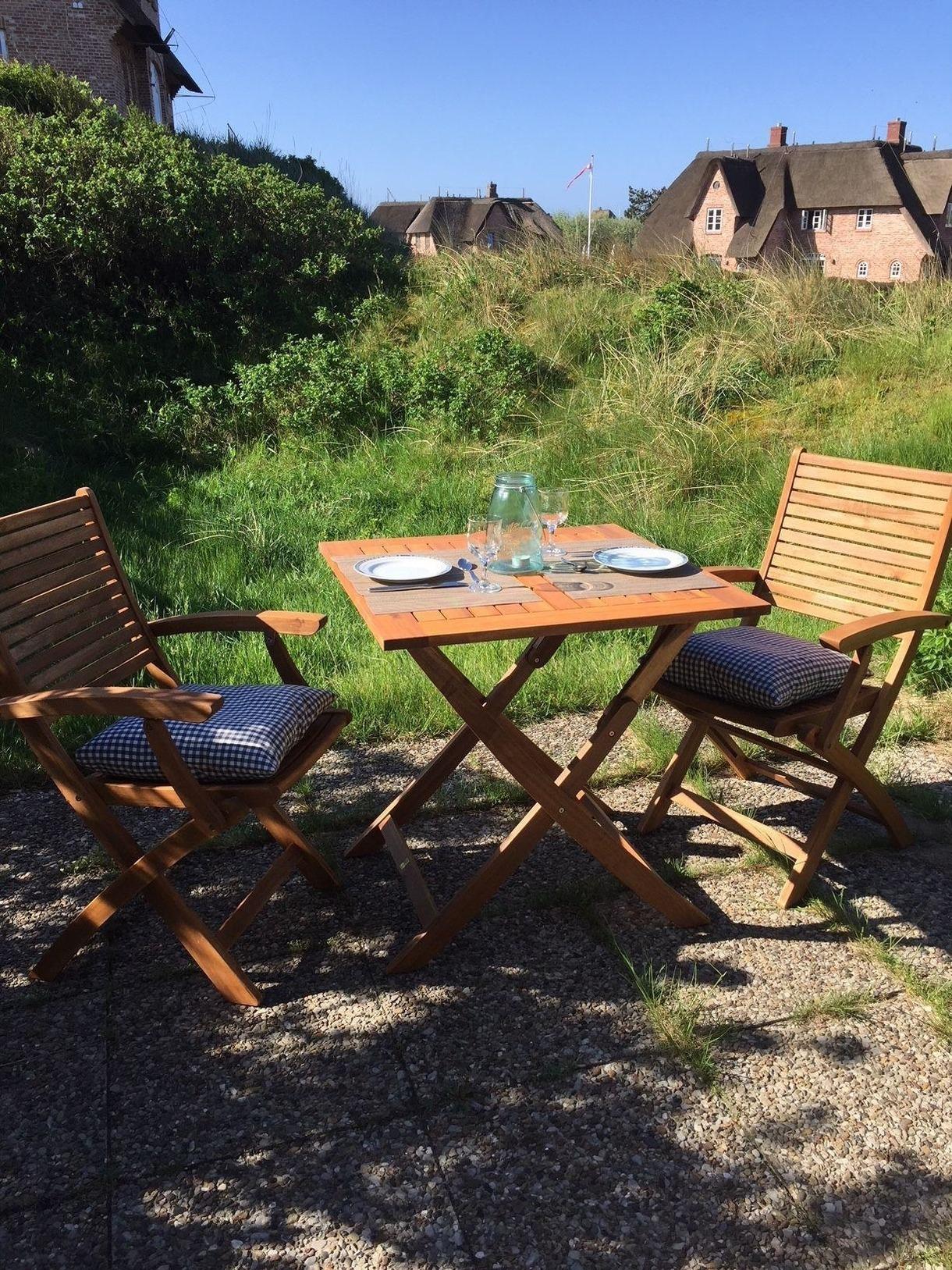 Geniessen Sie Ihr Fruehstueck im Freien bei schoenem Wetter in Ihrer eigenen Sonnenkuhle mit Strandkorb und Sitzmoebeln und Blick auf die charakteristische Reetdach- und Duenenlandschaft. Der Garten liegt den ganzen Tag in der Sonne.
