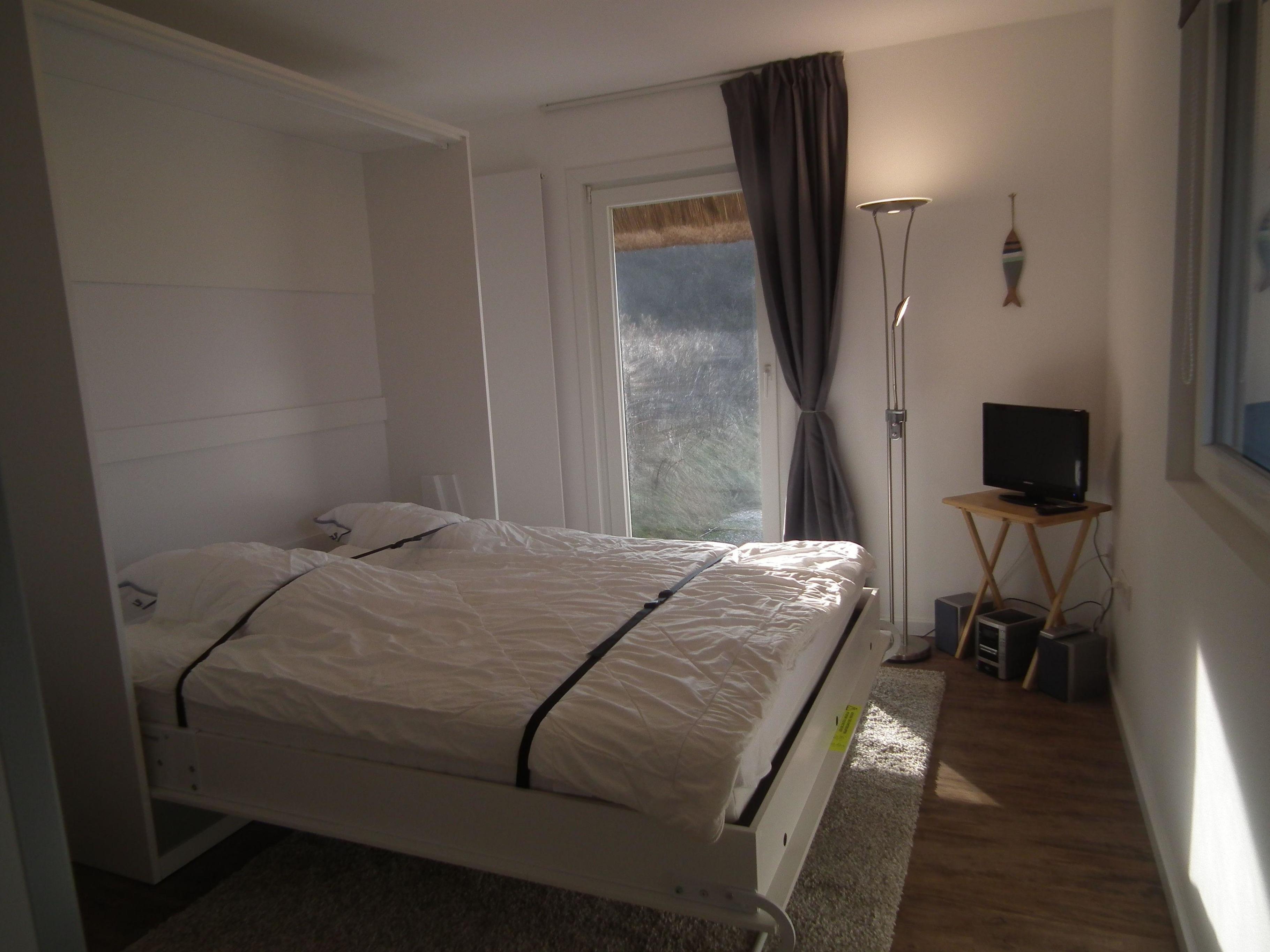 Das Doppel-Bett im Schlafzimmer ist ein Schrankbett, bestehend aus einer großen Federkernmatratze (1.60m x 2.00m), das Sie tagsüber ganz einfach und bequem zurück klappen können.