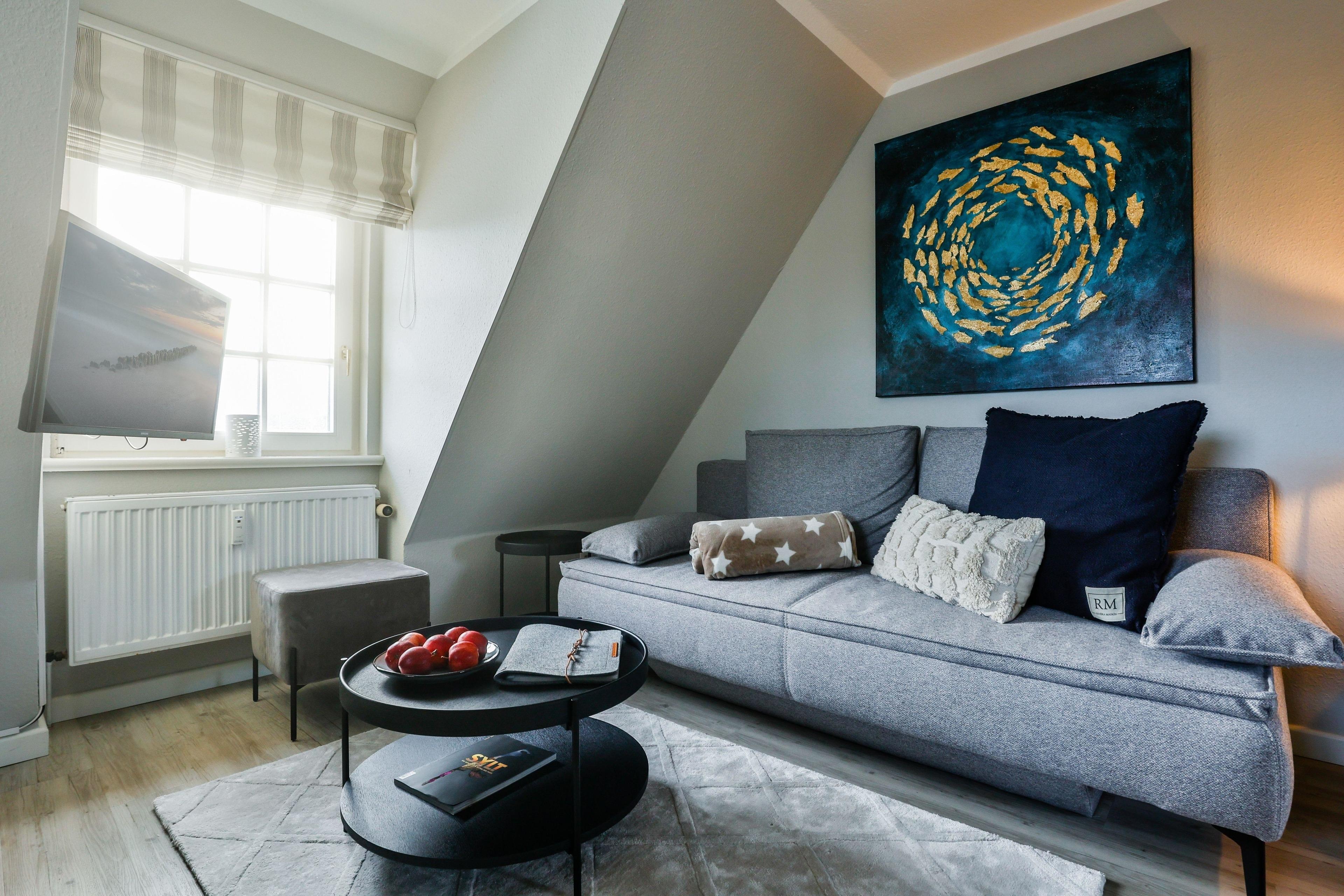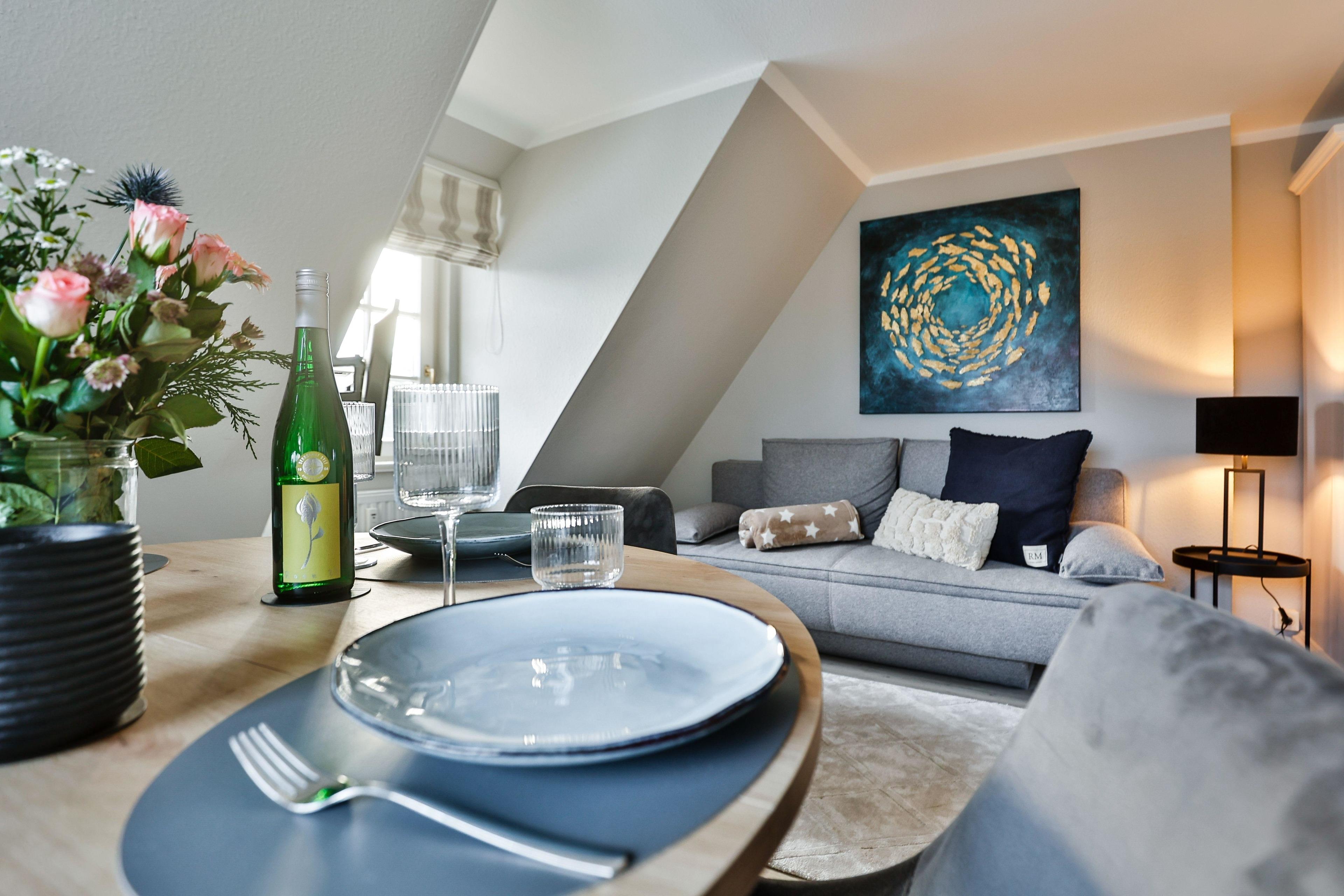 Das exklusive 2-Raum-Appartement im 1. Obergeschoss mit gehobener Ausstattung bietet Platz für 2 Personen, ist hell gestaltet und zum Wohlfühlen. Die Schlafcouch im Wohnzimmer kann im Bedarfsfall auch als Schlafplatz genutzt werden.