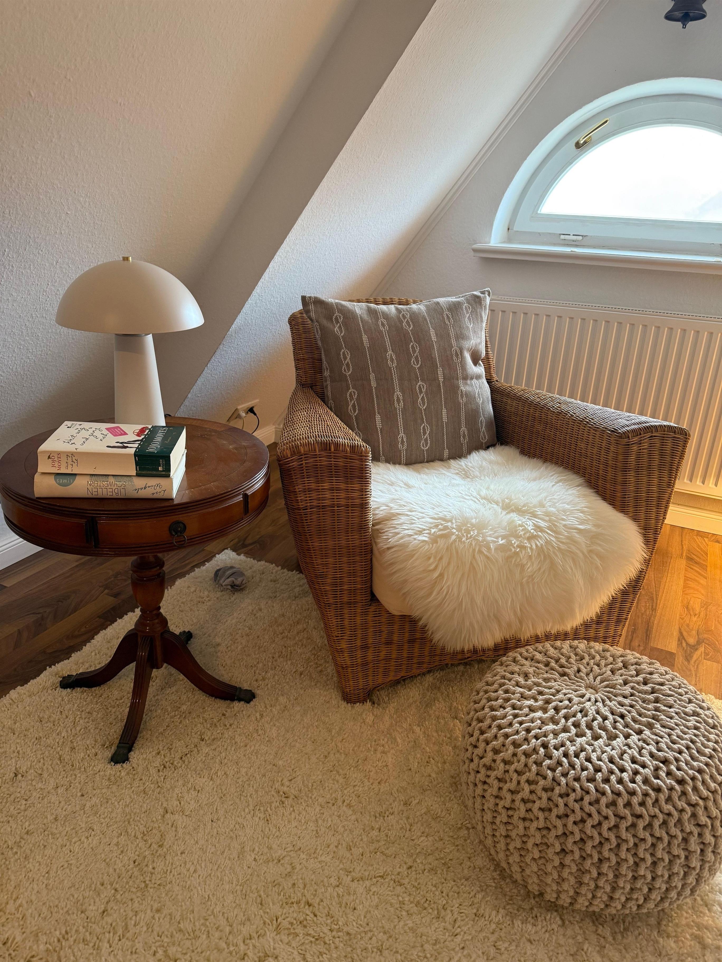im 1. Obergeschoss eines Reetdachhauses. Über zwei Ebenen befindet sich die Wohn/Küche im unteren Bereich; der Schlafbereich ist über eine Treppe zum Dachgeschoss erreichbar. Eine kleine Leseecke lädt zum Entspannen ein. Die Küche ist komplett ausgestattet mit Nespresso-Maschine, Wasserkocher, Toaster, Mikrowelle/Ofen.