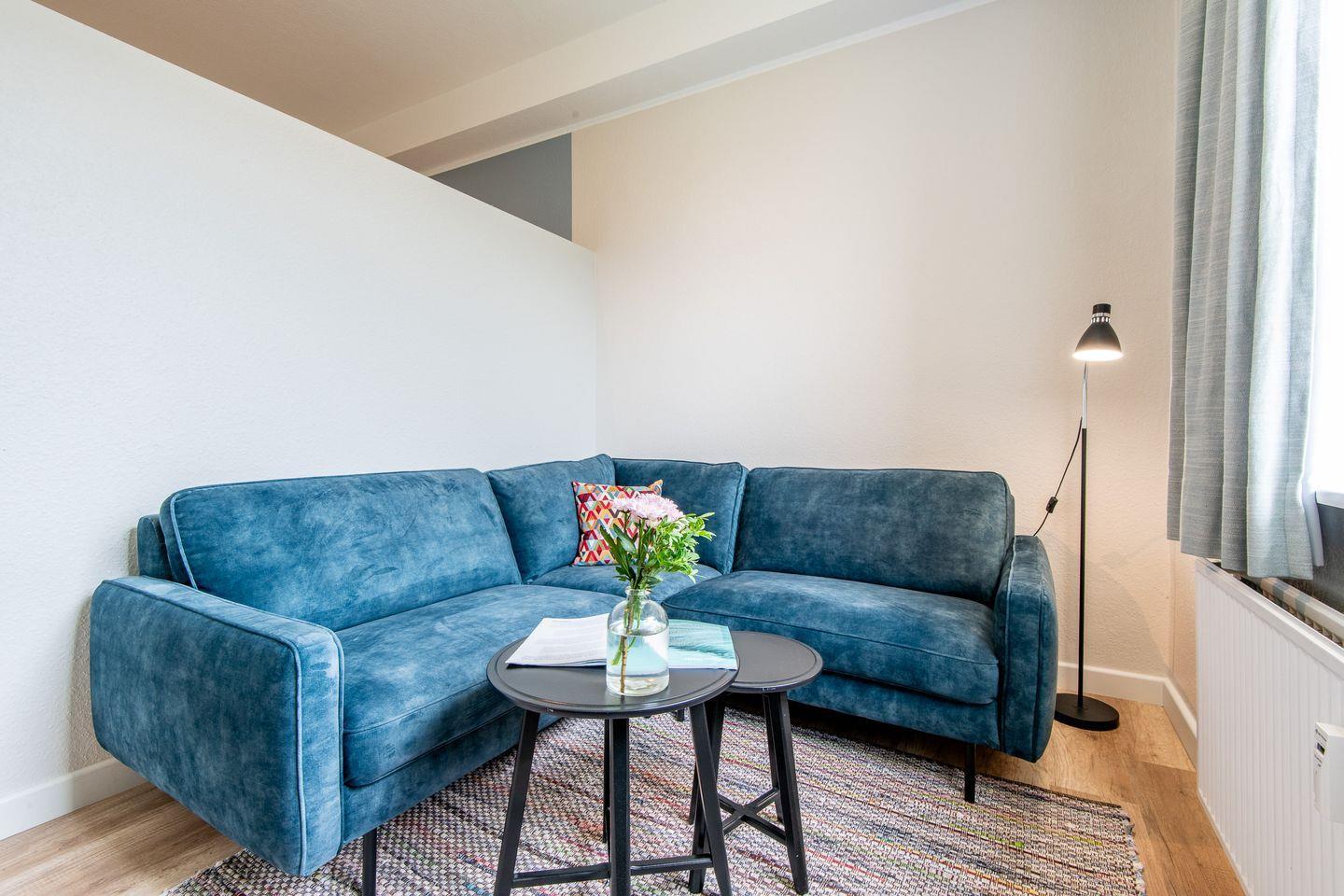 Der Wohn-Schlafbereich ist mit einer gemütlichen Sofaecke sowie einem TV-Gerät ausgestattet. Der Schlafbereich ist durch eine Wand vom Wohnbereich getrennt und mit einem bequemen Doppelbett und einem Kleiderschrank möbliert.