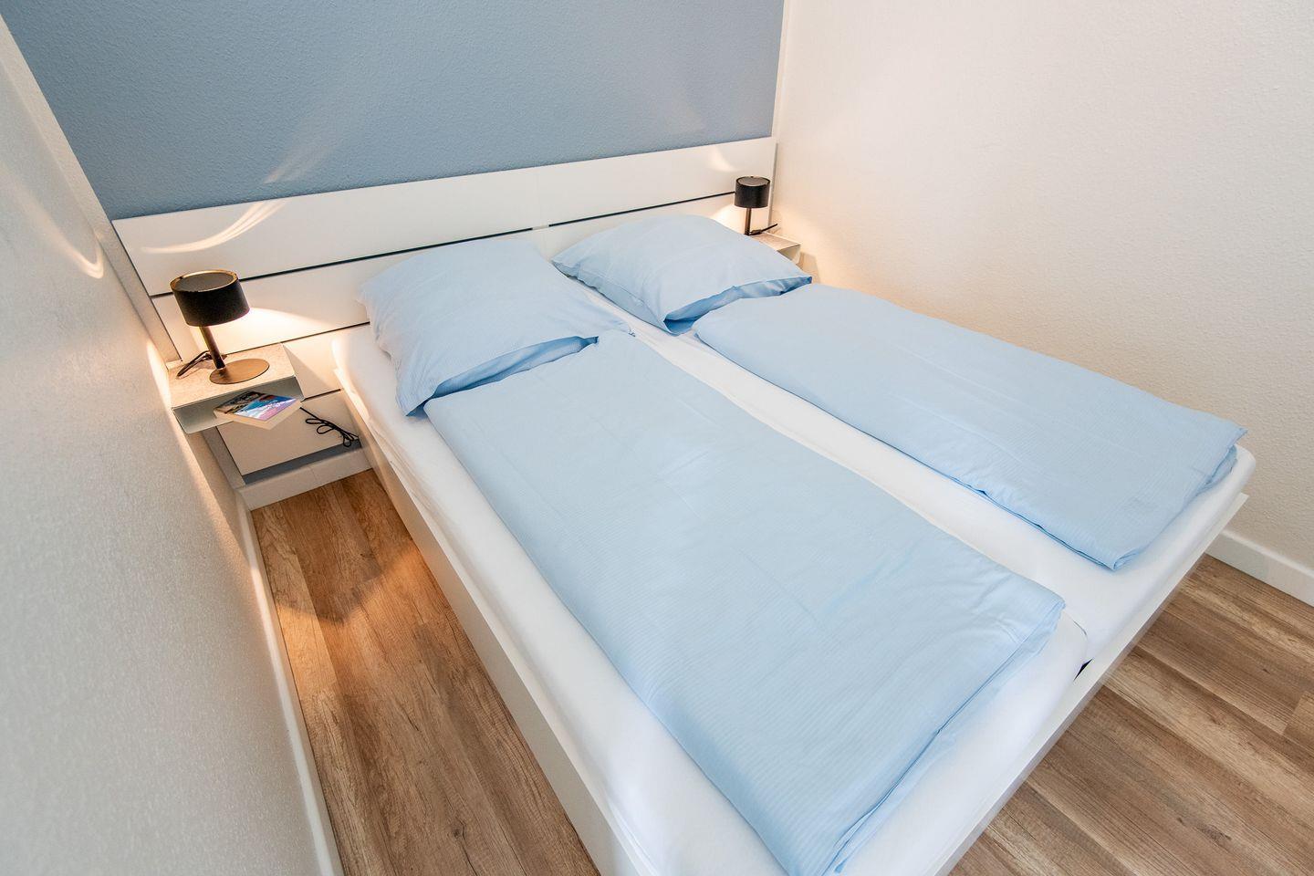 Der Wohn-Schlafbereich ist mit einer gemütlichen Sofaecke sowie einem TV-Gerät ausgestattet. Der Schlafbereich ist durch eine Wand vom Wohnbereich getrennt und mit einem bequemen Doppelbett und einem Kleiderschrank möbliert.