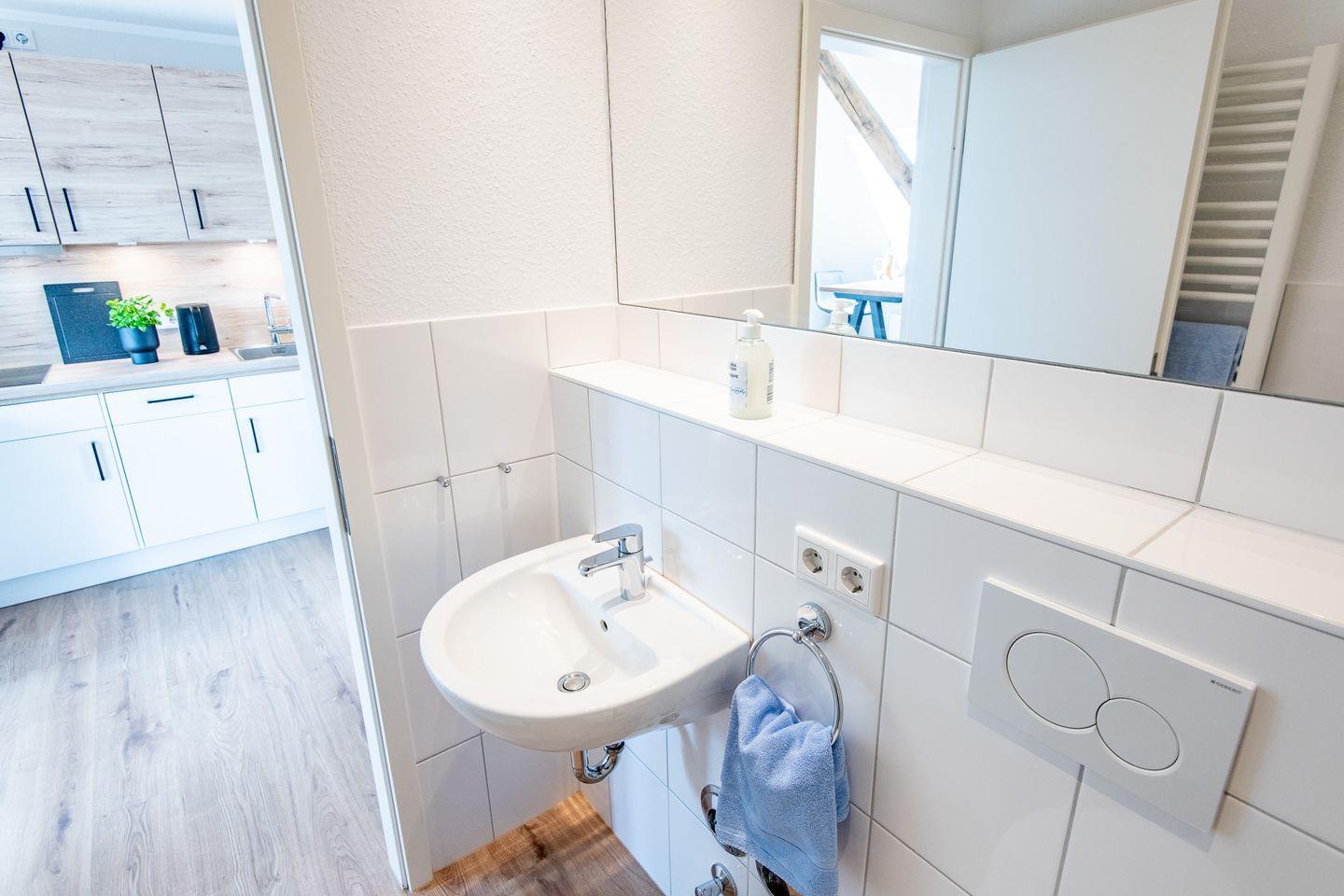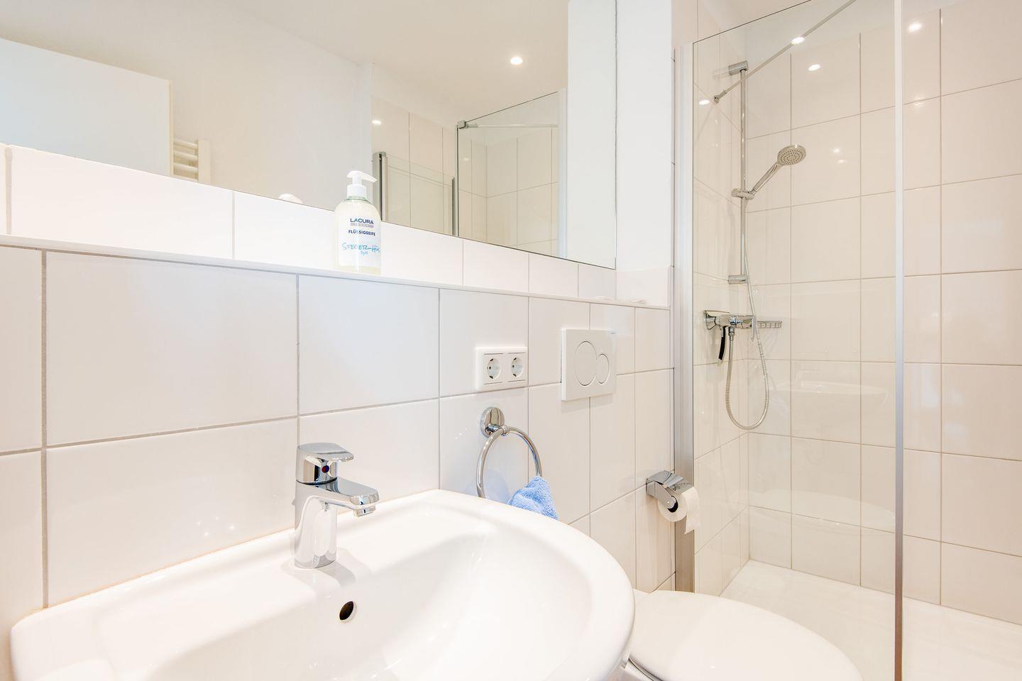 Die Wohnung verfügt über ein Badezimmer, welches mit einer Dusche, einem WC, einem Waschbecken und einer Handtuchheizung ausgestattet ist.