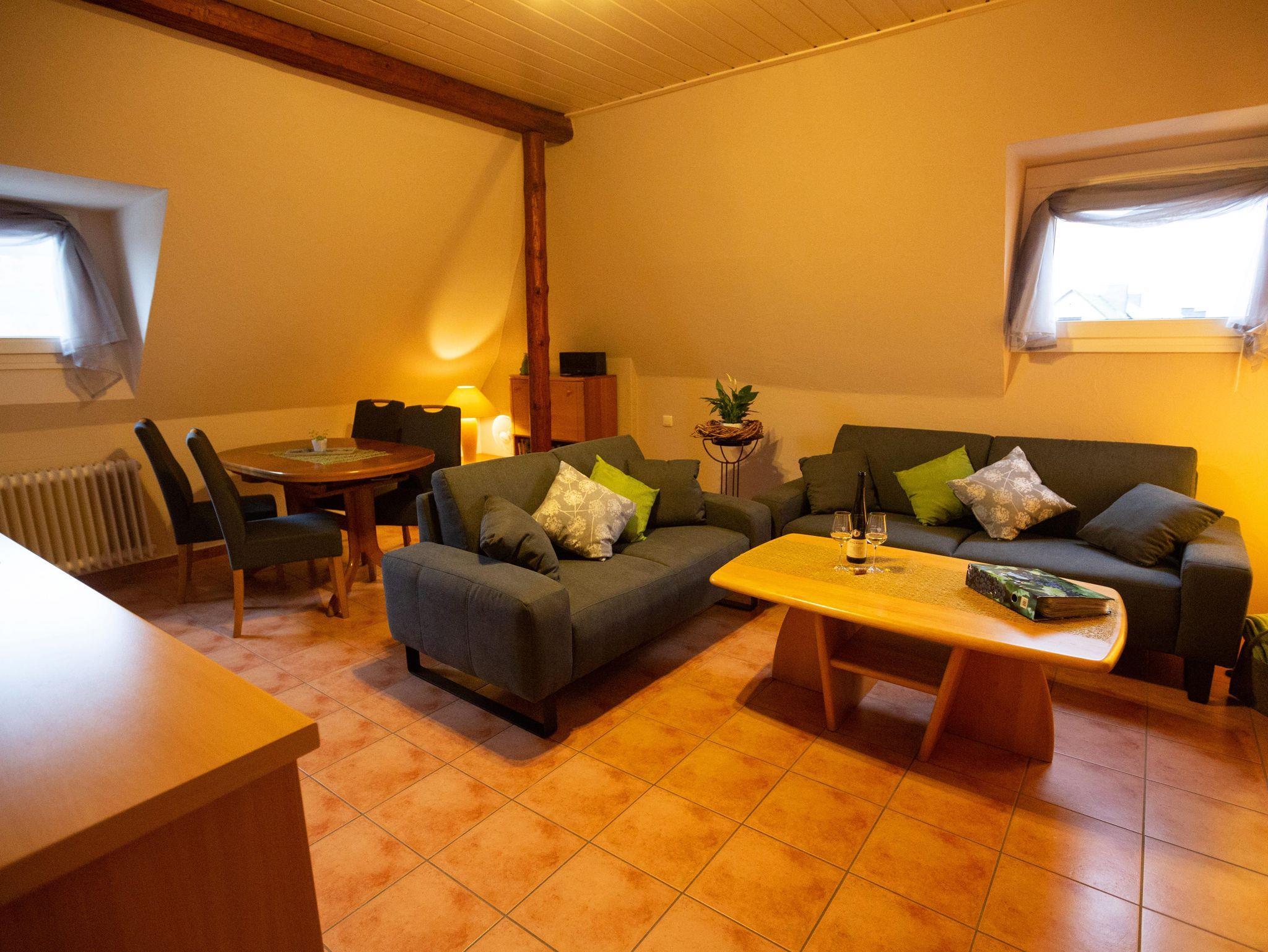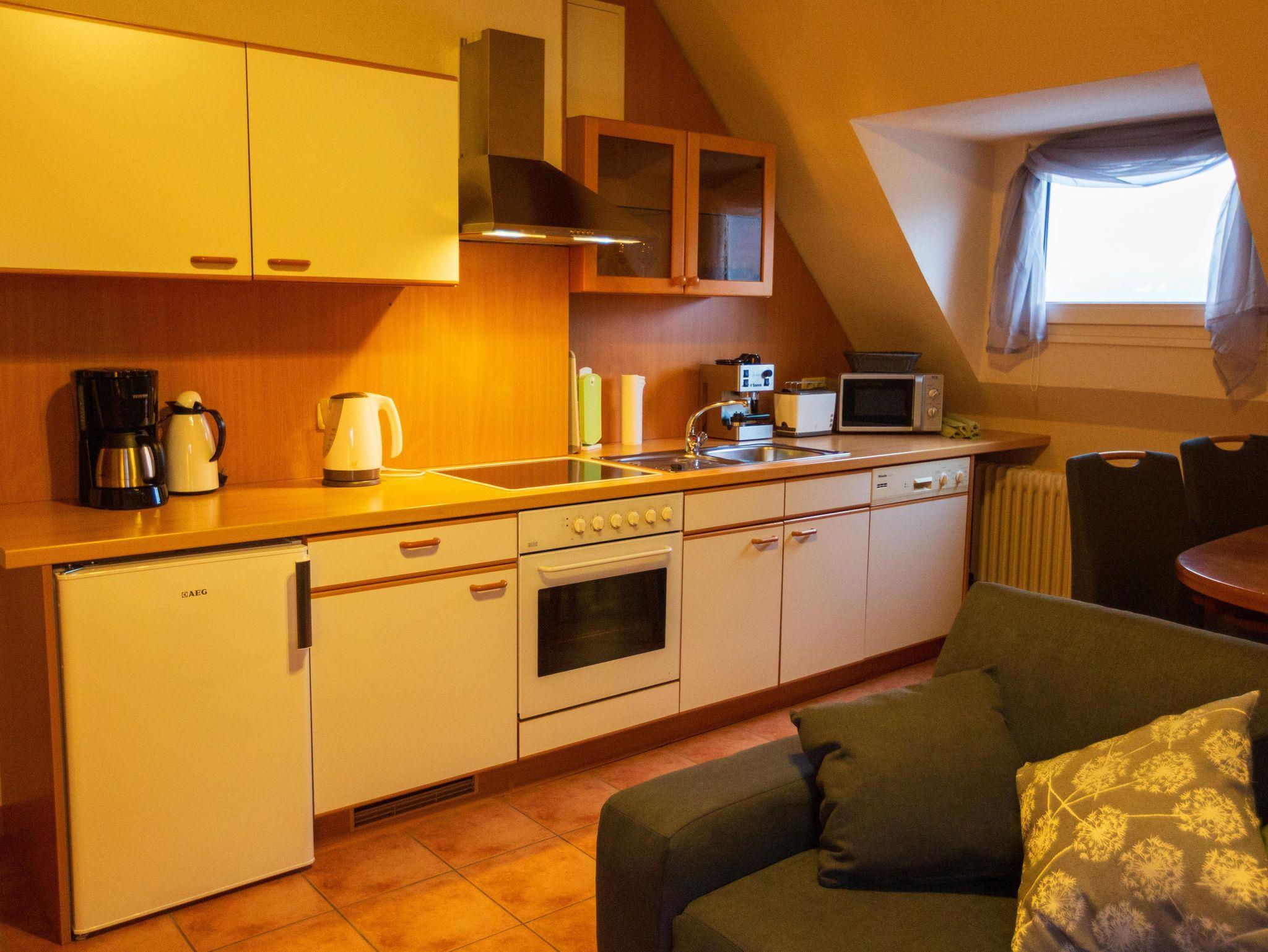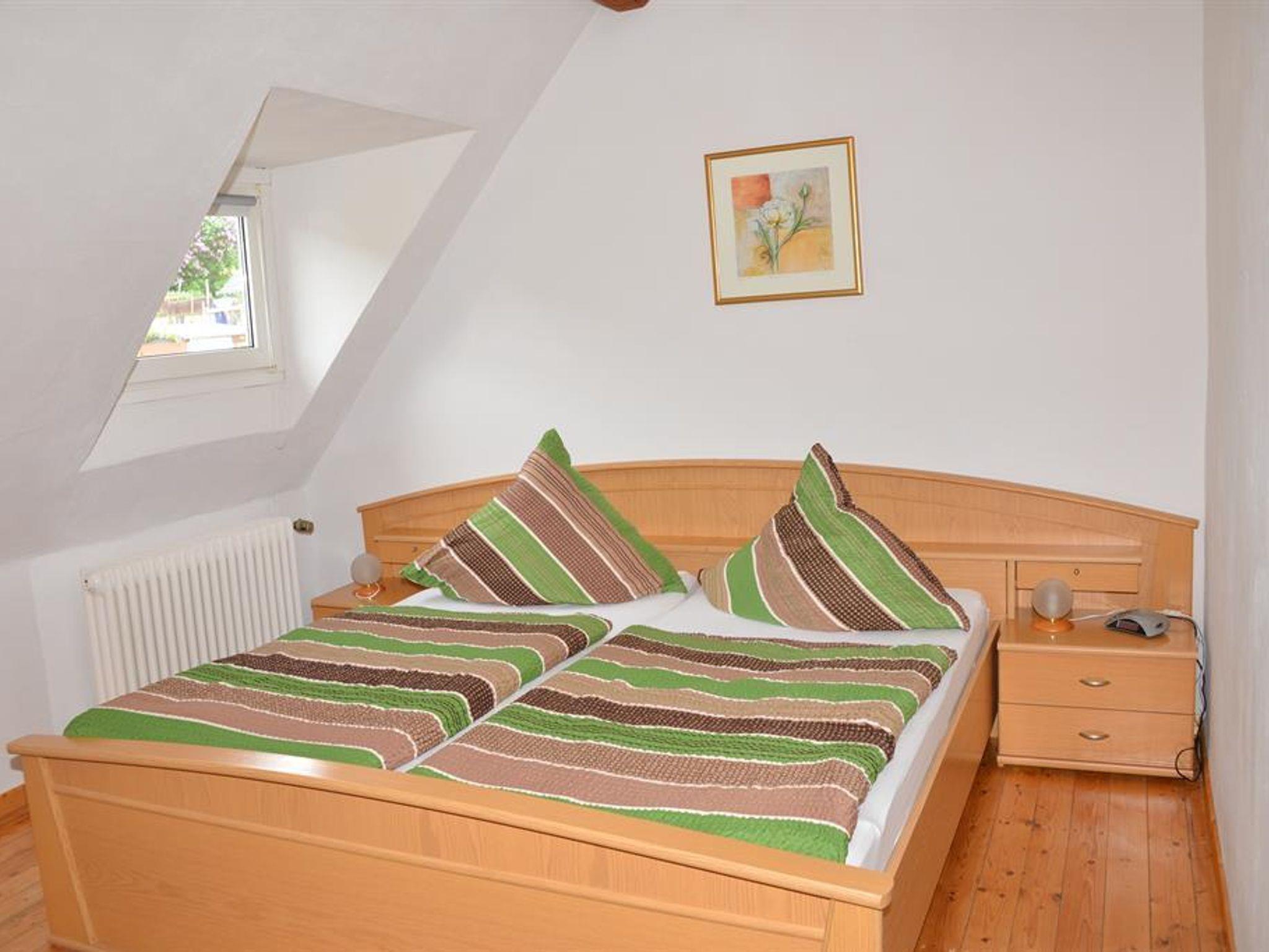 Die Ferienwohnung Auf Mullay befindet sich im Obergeschoss. Sie besteht aus zwei Doppelschlafzimmern, Wohn-Küchenraum (die Küche ist komplett mit Spülmaschine), Diele und Bad mit Dusche und Badewanne.Die Gästeterrasse mit herrlicher Aussicht befindet sich eine Etage tiefer.