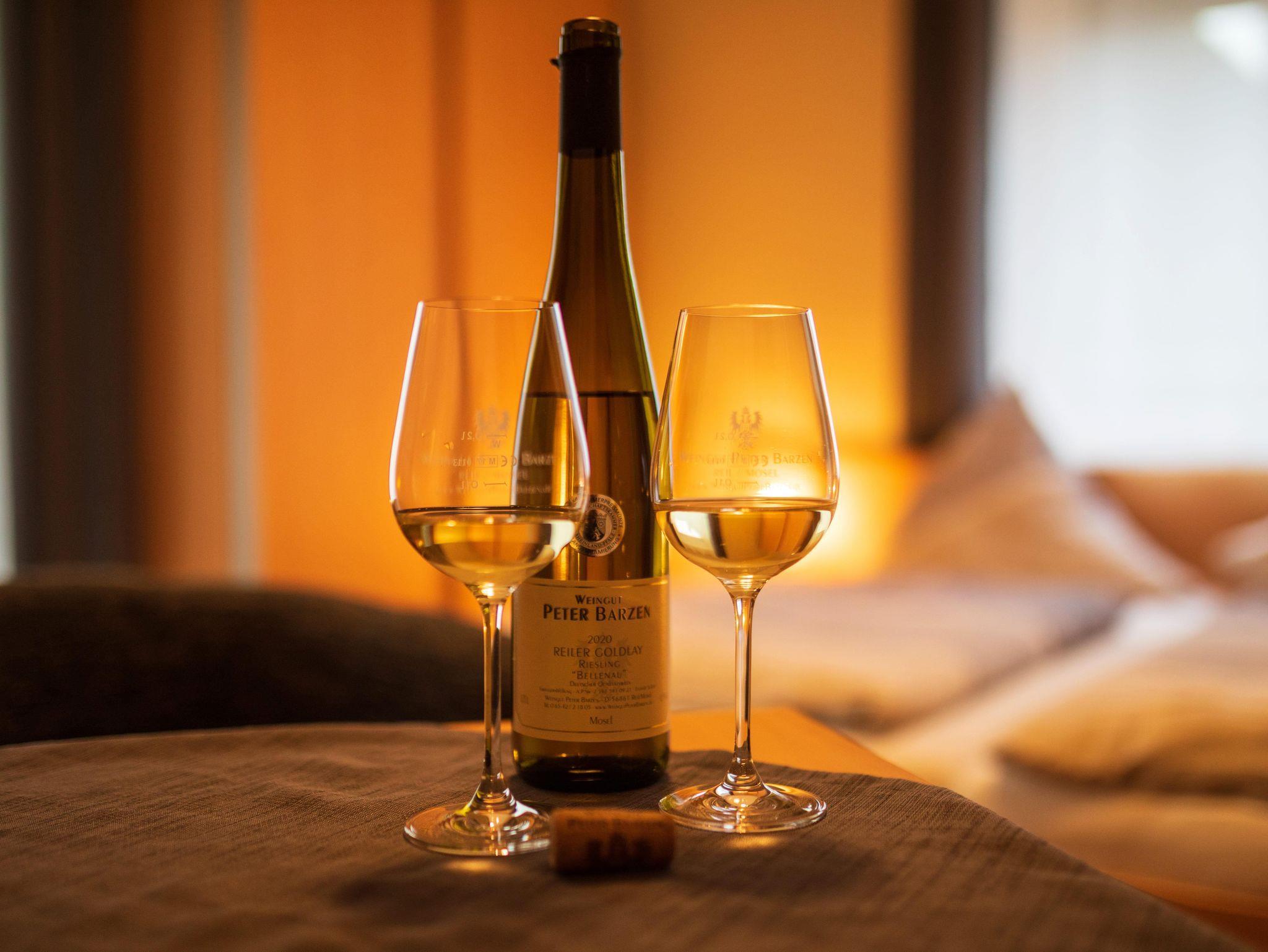 Bei uns werden Sie den Alltag vergessen! Es laden gemütliche Gästezimmer sowie eine Ferienwohnung ein. Für Fahrräder gibt es eine abschließbare Fahrradgarage, für Autos einen Parkplatz. Genießen Sie die Aussicht über die Mosel und ihre Weinberge von der großen Gästeterrasse. Für Gäste in den Gästezimmern stehen zusätzlich noch eine Küche sowie der Aufenthaltsraum zur Verfügung.