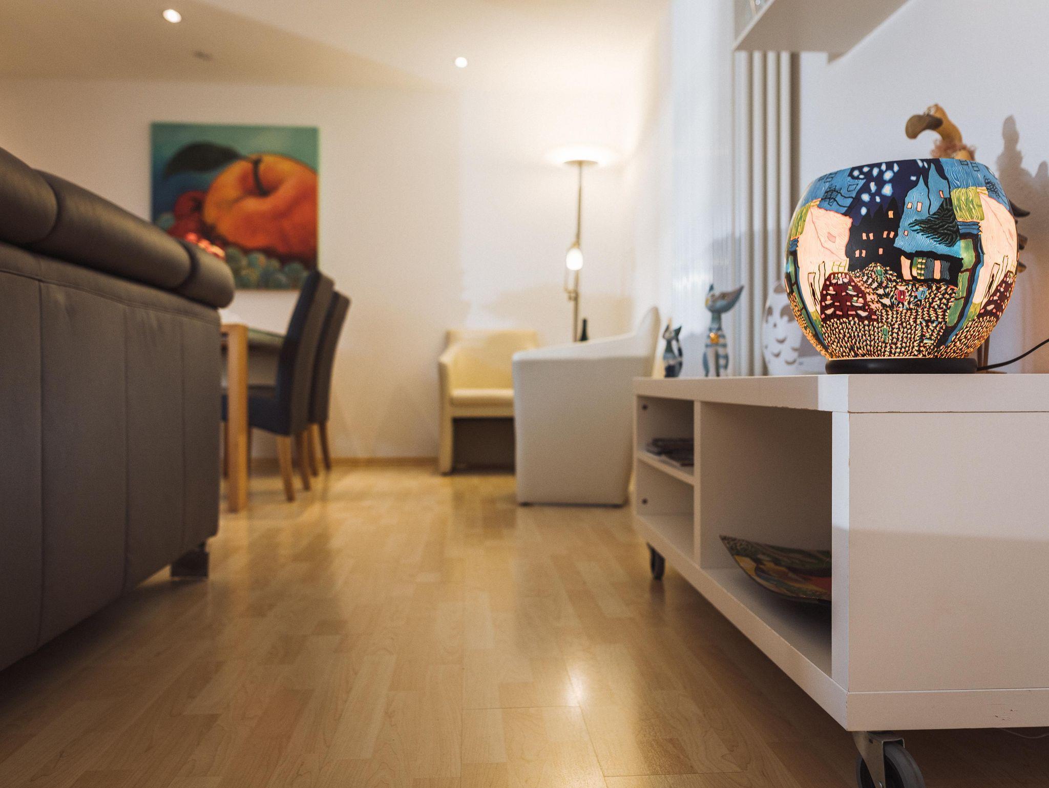 Sie verfügt über zwei Schlafzimmer mit jeweils 1,80 m x 2,00 m großen Doppelbetten mit getrennten Matratzen, zwei Nachtschränken und einem Kleiderschrank. Ein modernes Badezimmer bestehend aus Dusche, Waschbecken und WC ist direkt von einem Schlafzimmer aus betretbar. Das große Hauptbad verfügt über eine geräumige, ebenerdige Dusche, zwei Waschbecken, einem WC, einem Bidet und einem Handtuchwärmer. Ein großes Wohnzimmer mit gemütlicher Couch lädt zum Verweilen ein. Ein großer Smart-TV mit Internetzugang runden das Angebot ab. Die vollausgestattete Küche inklusive Essbereich mit ausziehbarem Esstisch befinden sich ebenfalls in diesem Raum.
