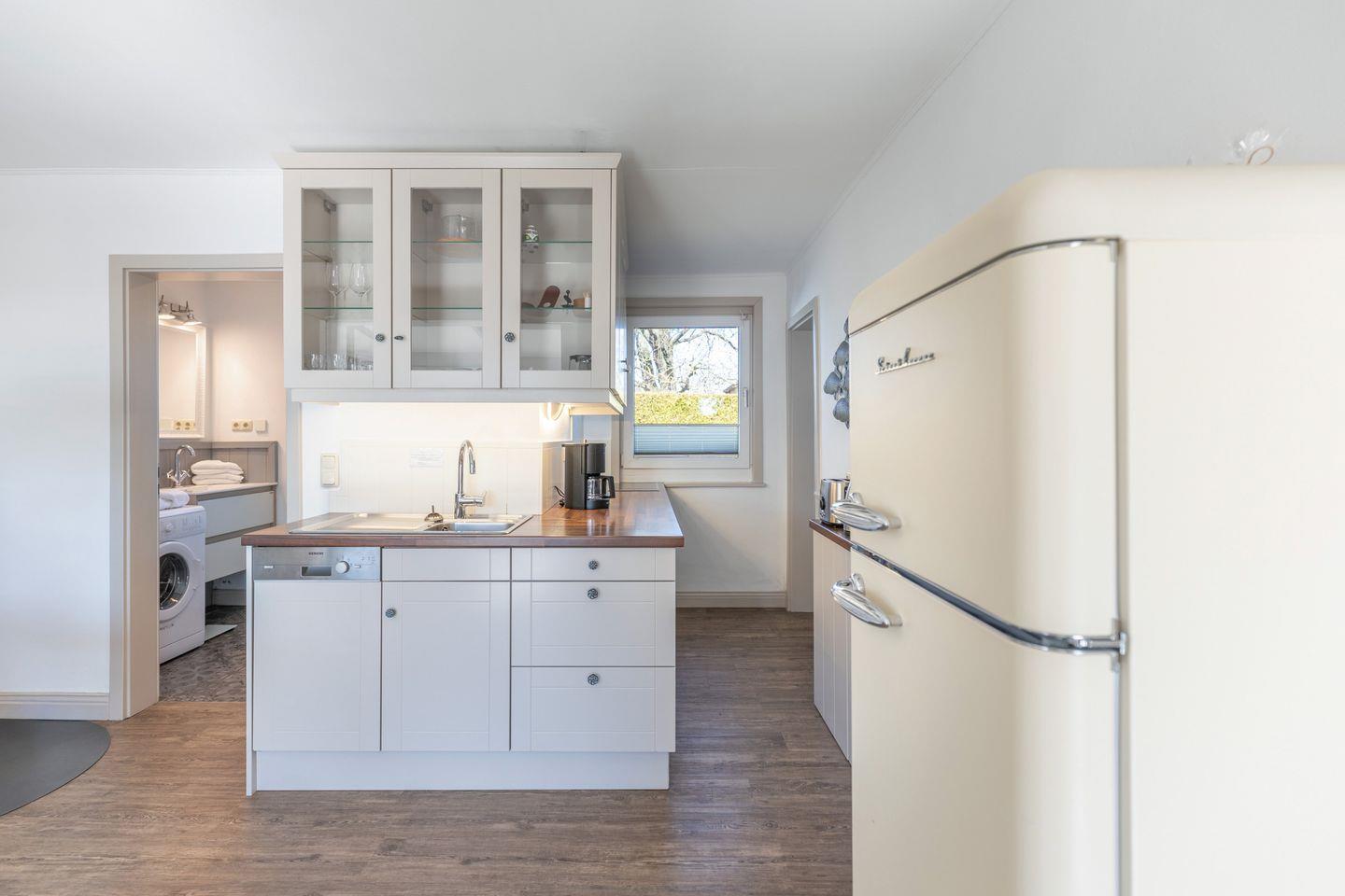 Das Ferienhaus mit ca. 50 qm Wohnfläche wurde aufwendig saniert. Es verfügt über ein Schlafzimmer mit einem Doppelbett 160 x 200 und einem weiteren Schlafzimmer mit einem Eck-Etagenbett. Die komfortable Küche ist mit Geschirrspüler, Backofen, Ceranfeld mit 4 Herdplatten, Kühlschrank mit einem großen Gefrierfach, Filterkaffeemaschine (Filtergröße 4), Wasserkocher und Toaster eingerichtet. Ein üppiger Esstisch direkt am Kaminofen verführt zu langen Gesprächen und Essen in heimeliger Atmosphäre.