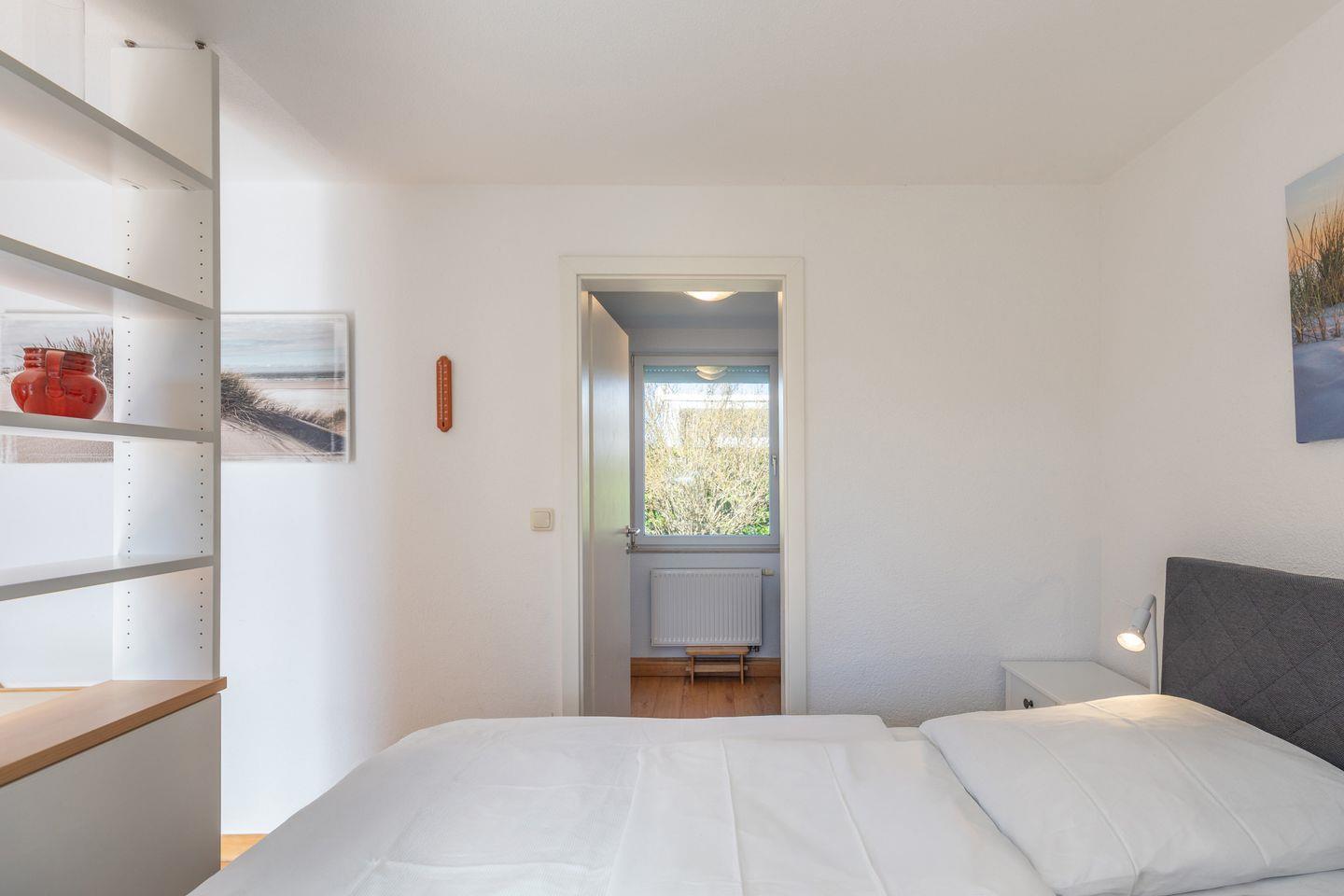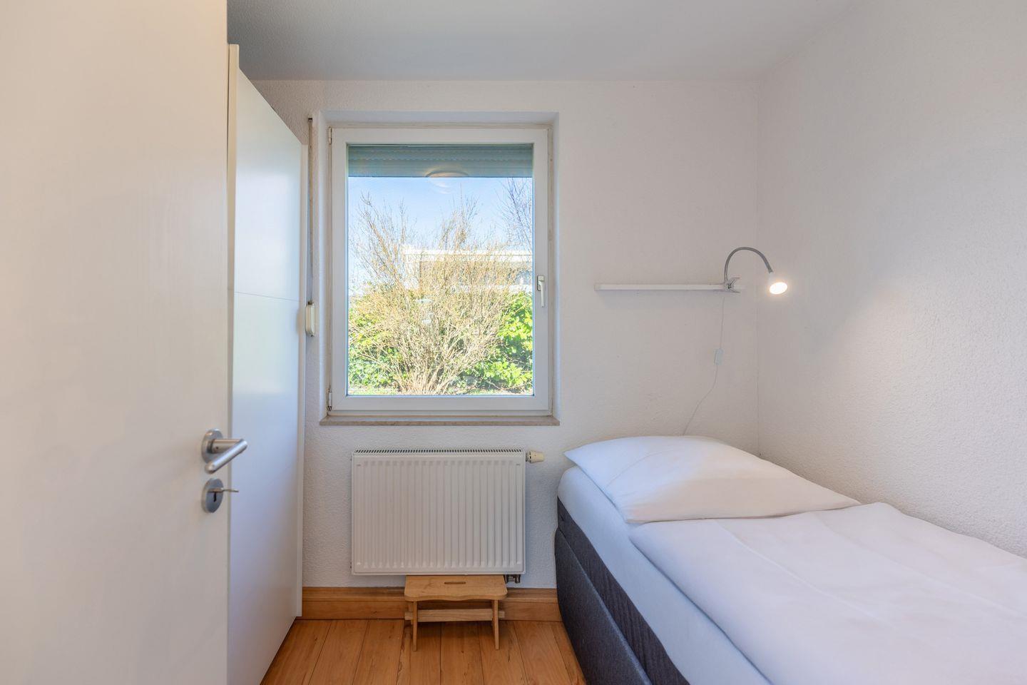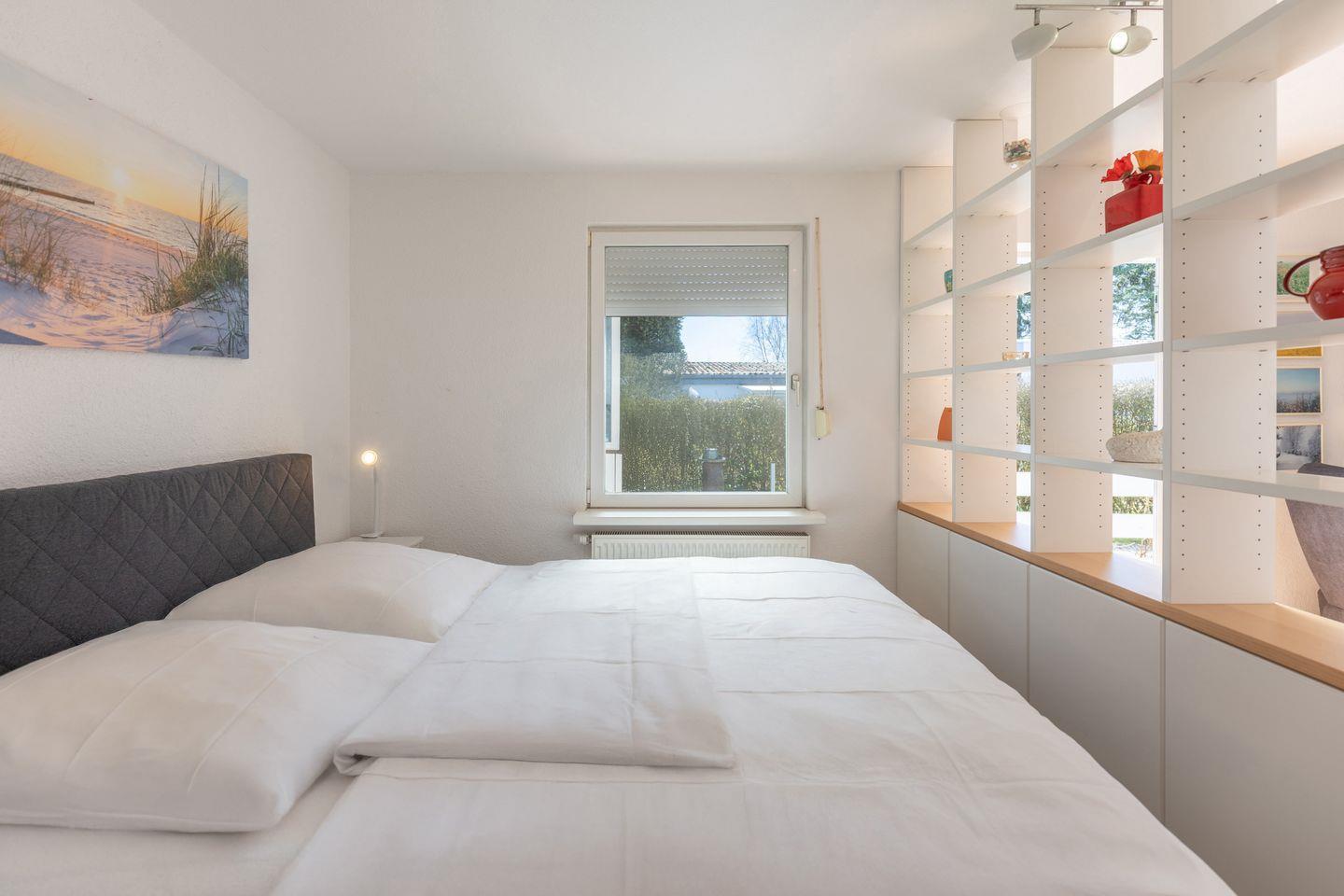 Durch ein raumhohes Regal ist der Schlafbereich mit einem bequemen Boxspringbett (180 x 200) ausgestattet. Ein separates Schlafzimmer bietet Ihnen ein Boxspringbett für eine Person.