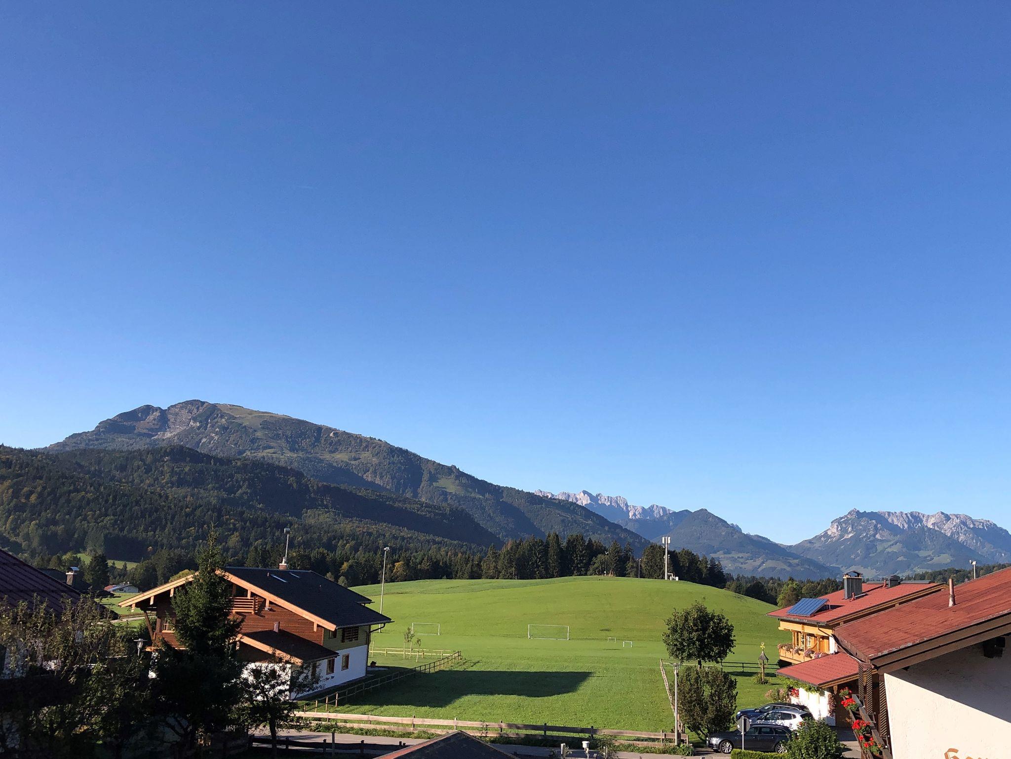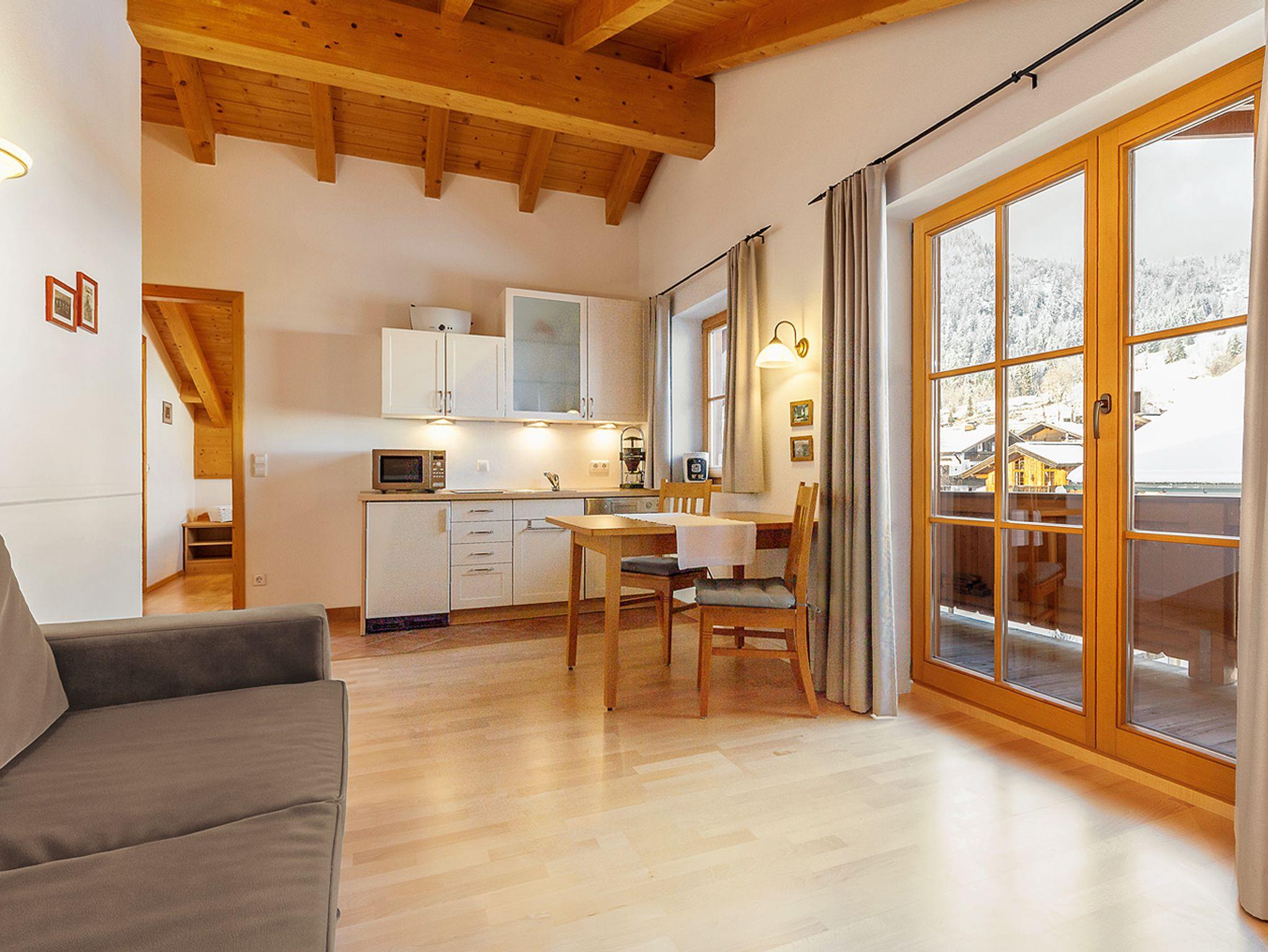 Der große, umlaufende Balkon nach Süden und Westen bietet freien Blick ins Kaisergebirge. Das großzügige 2-Zimmer-Appartement Unterberg im 1. OG, hat eine Größe von ca. 47 m². An der gemütlichen Essecke im Wohnraum können Sie die selbst zubereiteten Mahlzeiten genießen. Die Küchenzeile ist mit Geschirrspüler und Mikrowelle ausgestattet. Allergikergerecht wurde in der gesamten Wohnung hochwertiges Echtholz-Parkett verlegt. Im Wohnraum lässt sich das Sofa ausklappen und bietet Platz für eine Person. Bettwäsche und Handtücher sind ausreichend vorhanden und werden nach Ihren Wünschen gewechselt. Für den Fernsehabend steht Ihnen ein DVD-Player sowie je ein Fernsehgerät in Wohn- und Schlafzimmer zur Verfügung. Die CD-Radio-Anlage komplettiert die Ausstattung. In unseren Badezimmern bekommen Sie keine kalten Füße! Dafür sorgt die ganzjährig beheizte Fußbodenheizung.