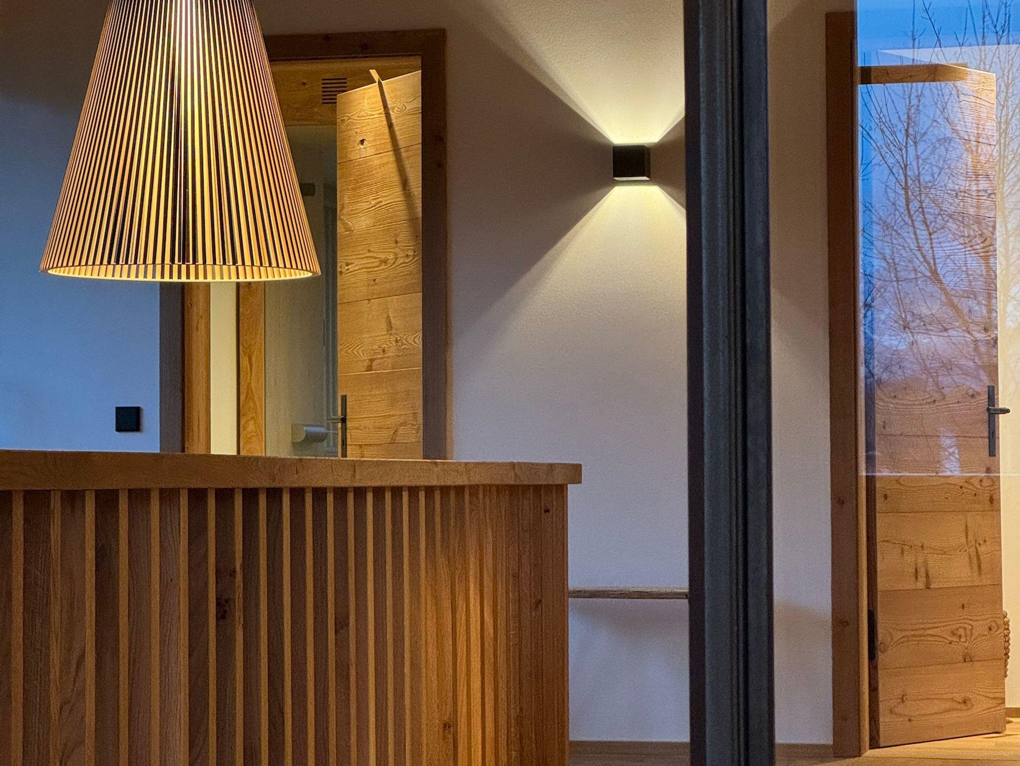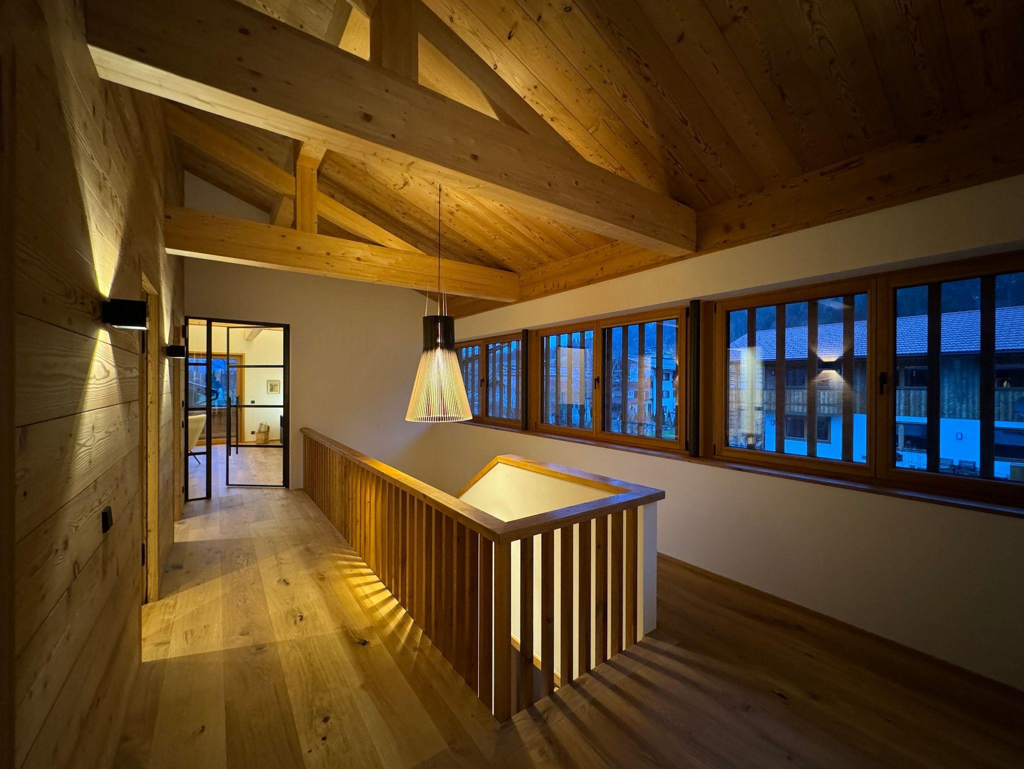 Großzügige 240 qm Wohnfläche bieten viel Platz und Komfort für bis zu acht Gäste. Die luxuriöse, offene Küche mit Theke und großem Esstisch befindet sich im Erdgeschoss. Über große Schiebetüren gelangt man auf die sonnige Terrasse und in den Garten. Das weitläufige Wohnzimmer im Obergeschoss, ebenfalls mit großen Schiebetüren zum umlaufenden Balkon, bietet viele gemütliche Sitzmöglichkeiten, einen großen Kamin mit Kaminbank und besticht durch die enorme Raumhöhe in das offene Gebälk des Dachstuhls. Vier Schlafzimmer, drei Badezimmer und ein Gäste-WC verteilen sich auf die beiden Etagen des Ferien-Chalets. Komplettiert wird die grosszügige und luxuriöse Ausstattung durch eine große finnische Sauna im Obergeschoss, die Doppelgarage mit Wallbox und die über das lokale Naturwärmewerk gespeiste Fußbodenheizung.