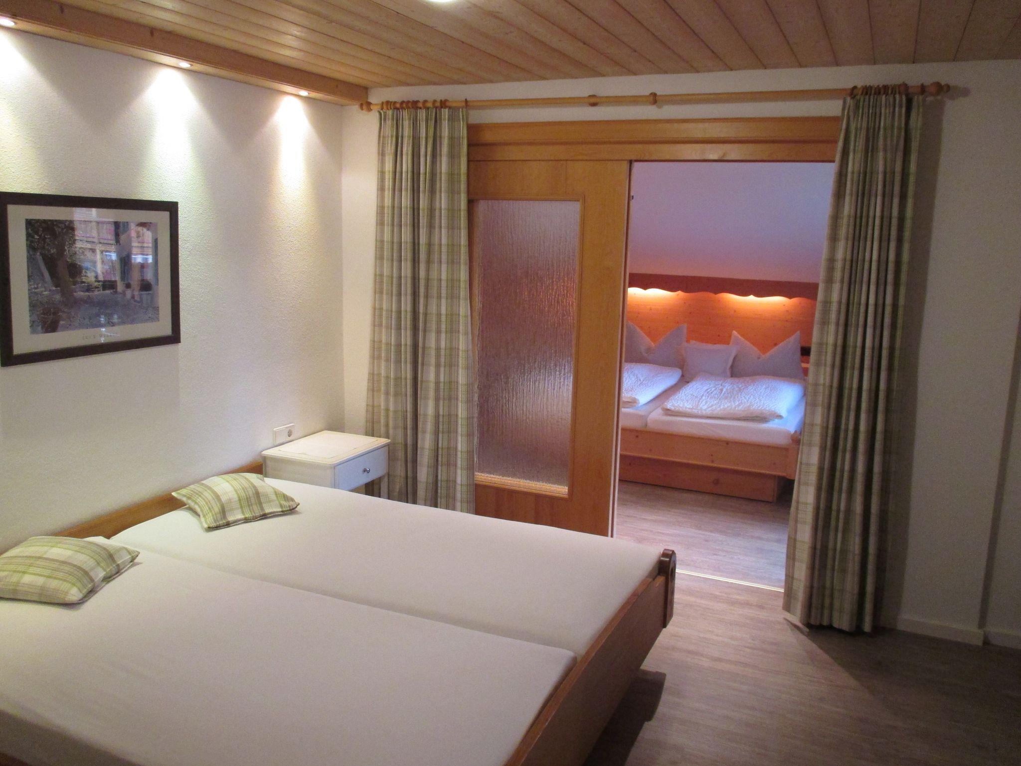 Eine große geräumige Ferienwohnung, ca. 55 qm auf zwei Etagen. Der Wohnraum und die komplett eingerichtete Küche befinden sich auf Parterre. Im ersten Stock befinden sich zwei Schlafräume mit fest eingebauten Doppelbetten. Auf der Terrasse sowie auf dem nach Süden ausgerichteten Balkon können Sie die Morgensonne genießen. Sie haben einen herrlichen Blick auf den Ort Reit im Winkl und das Fellhorn. Die Wohnung ist für 2 bis 4 Personen geeignet. Im Schlafraum befindet sich ein separater Fernseher.