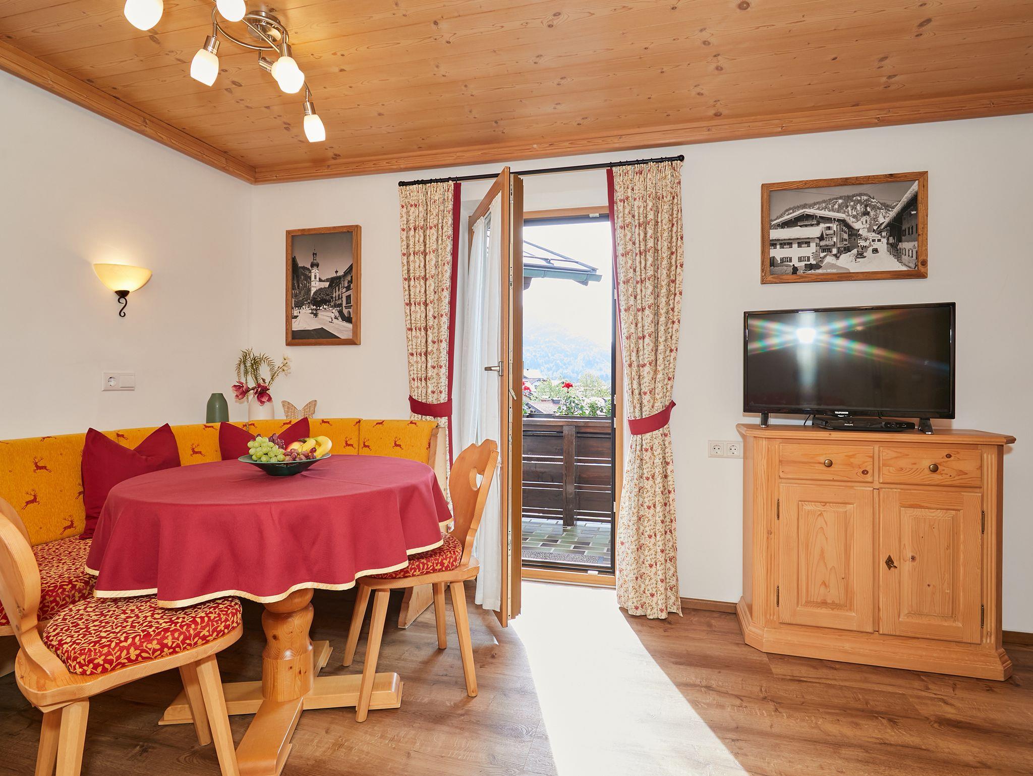 Genießen Sie den traumhaften Blick auf den wilden und den zahmen Kaiser sowie auf Reit im Winkl von Ihrem großen Süd- und Südost-Balkon. Die gemütliche Sitzecke im Wohn-/Essbereich lädt zum Verweilen oder genießen Ihrer Mahlzeiten ein. Hier befindet sich ein Flachbildschirm mit DVD-Player sowie eine Stereoanlage. Die separate kleine Küche ist komplett ausgestattet (Mikrowelle, Kühlschrank mit Gefrierfach, Toaster, Wasserkocher). Das Schlafzimmer ist mit einem Doppelbett (verstellbaren Lattenroste und Bandscheibenmatratzen) und zusätzlich mit 2 gemütlichen Polstersesseln und einem zweiten Fernseher eingerichtet. Bettwäsche und Handtücher werden gestellt. Die Wohnung ist liebevoll eingerichtet und jahreszeitlich dekoriert.