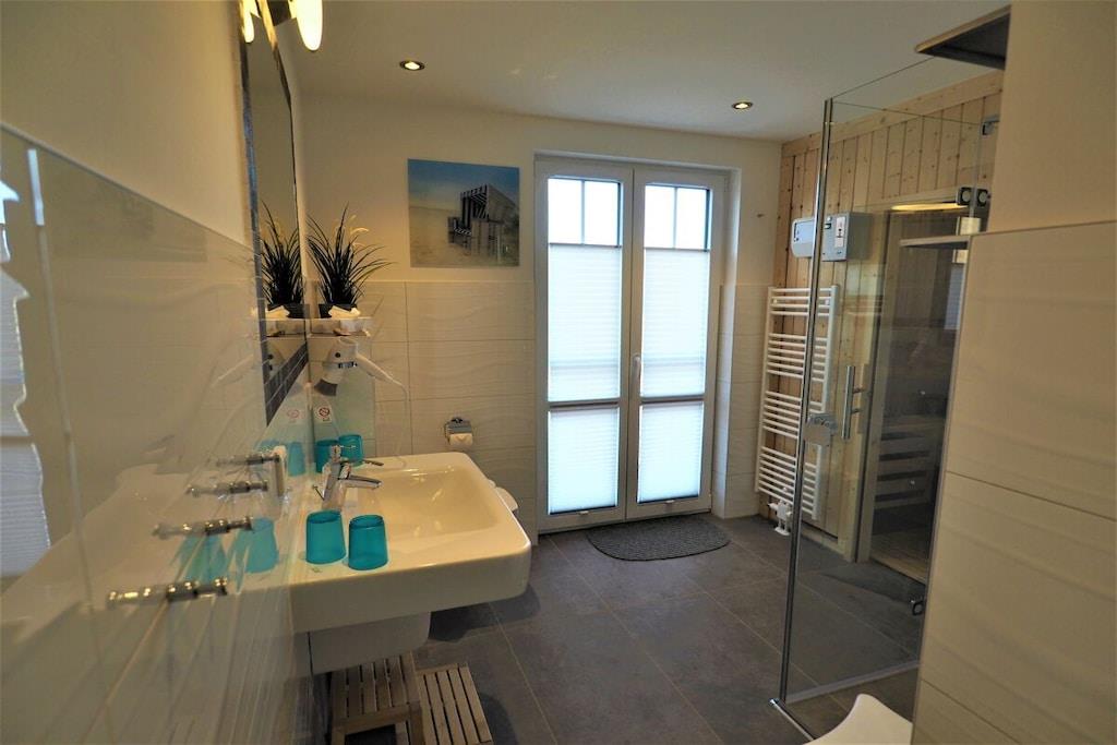 Ground floor: (hallway(Mirror, Wardrobe Coatrack, heating), Kitchen(Egg Cooker, Mixer, Spices, Tea Towels, Kitchenette, radio, CD player, stereo unit, hob, electric kettle, toaster, cooker, coffee machine, oven, grill, grill, microwave, dishwasher, fridge, freezer, heating, high chair, insect screens), Living/diningroom(Sofa, TV, dining table, fireplace, DVD player, Blu-ray player, heating, high chair, insect screens), bathroom(Mirror, toilet, toilet, shower, shower, washbasin, heating, hairdryer, insect screens), relaxation area(sauna)) On the 1st floor: (hallway(Wardrobe Coatrack, heating), bedroom(Bed Linen, Wardrobe, Wardrobe Coatrack, double bed, TV, heating, children's bed, insect screens), bedroom(Bed Linen, Wardrobe, Wardrobe Coatrack, double bed, TV, heating, insect screens), bedroom(Bed Linen, Wardrobe, Wardrobe Coatrack, single bed, single bed, TV, heating, insect screens), bathroom(Make Up Mirror, Mirror, toilet, toilet, bath tub, shower, shower, washbasin, heating, hairdryer, insect screens)) Attic: (bedroom(Bed Linen, Desk, Wardrobe, single bed, single bed, TV, radio, CD player, heating, insect screens)) Fire Alarm, Hot Water, Safe, Vacuum Cleaner, storage(grill, drying cabinet, Garden shed), Internet access, First Aid, washing machine, heating, terrace(Sun Umbrella, garden furniture, sun loungers), parking, stair gate, ironing board, iron, drying cabinet, Charging post for electric cars