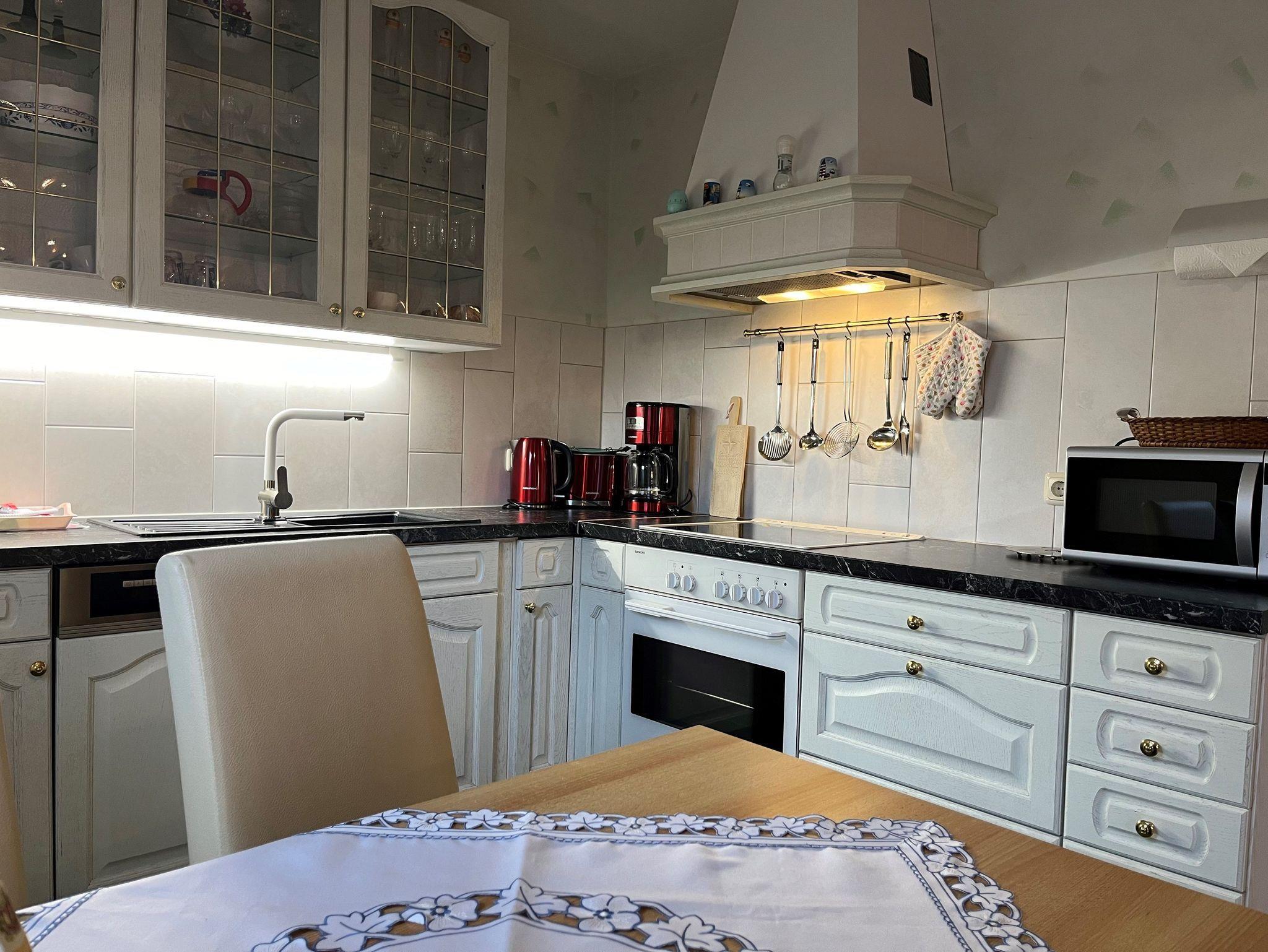 offene Küche, 4 Platten-Ceran-Herd mit Backofen, Kühlschrank mit Gefrierfach, Mikrowelle, Spülmaschine, Wasserkocher, Kaffeemaschine, Toaster