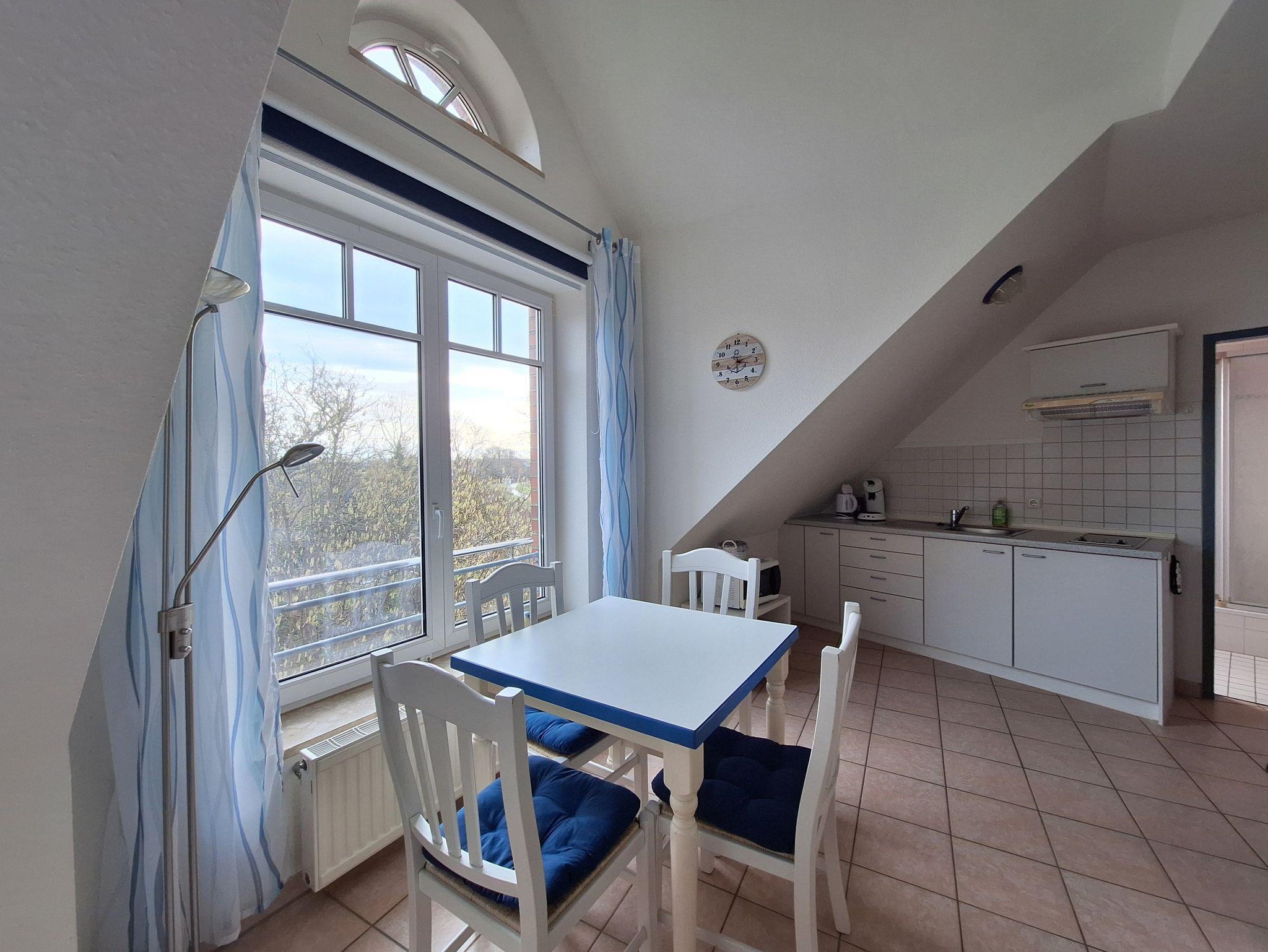 Das Wohnzimmer ist ausgestattet mit einer Schlafcouch, Sat-TV und integriertem Essbereich. Angrenzend ist eine Küchenzeile mit Kühlschrank und Gefrierfach, 2-Platten-Herd, Mikrowelle, Senseo- und Filter- Kaffemaschine, Wasserkocher u. Toaster.