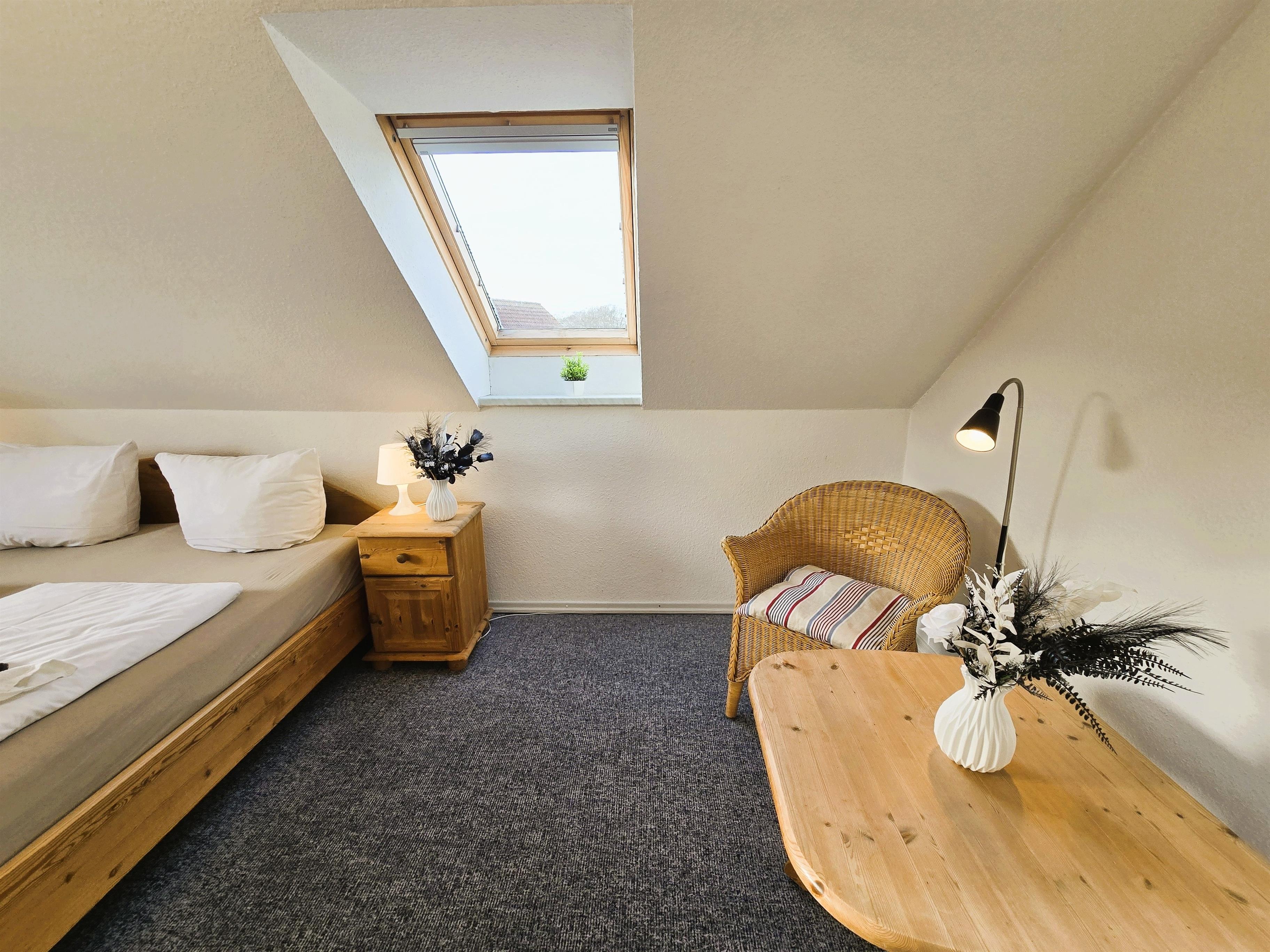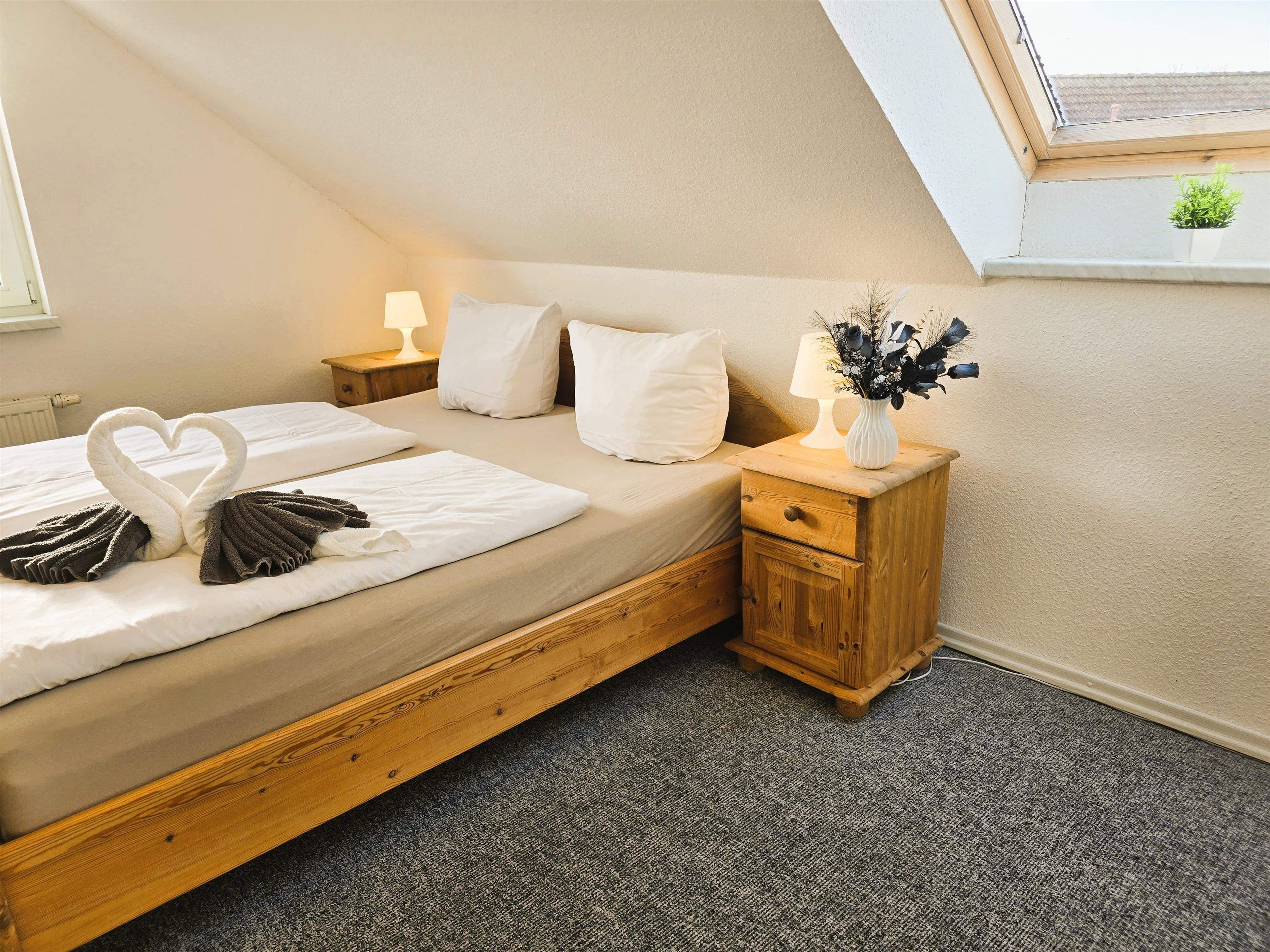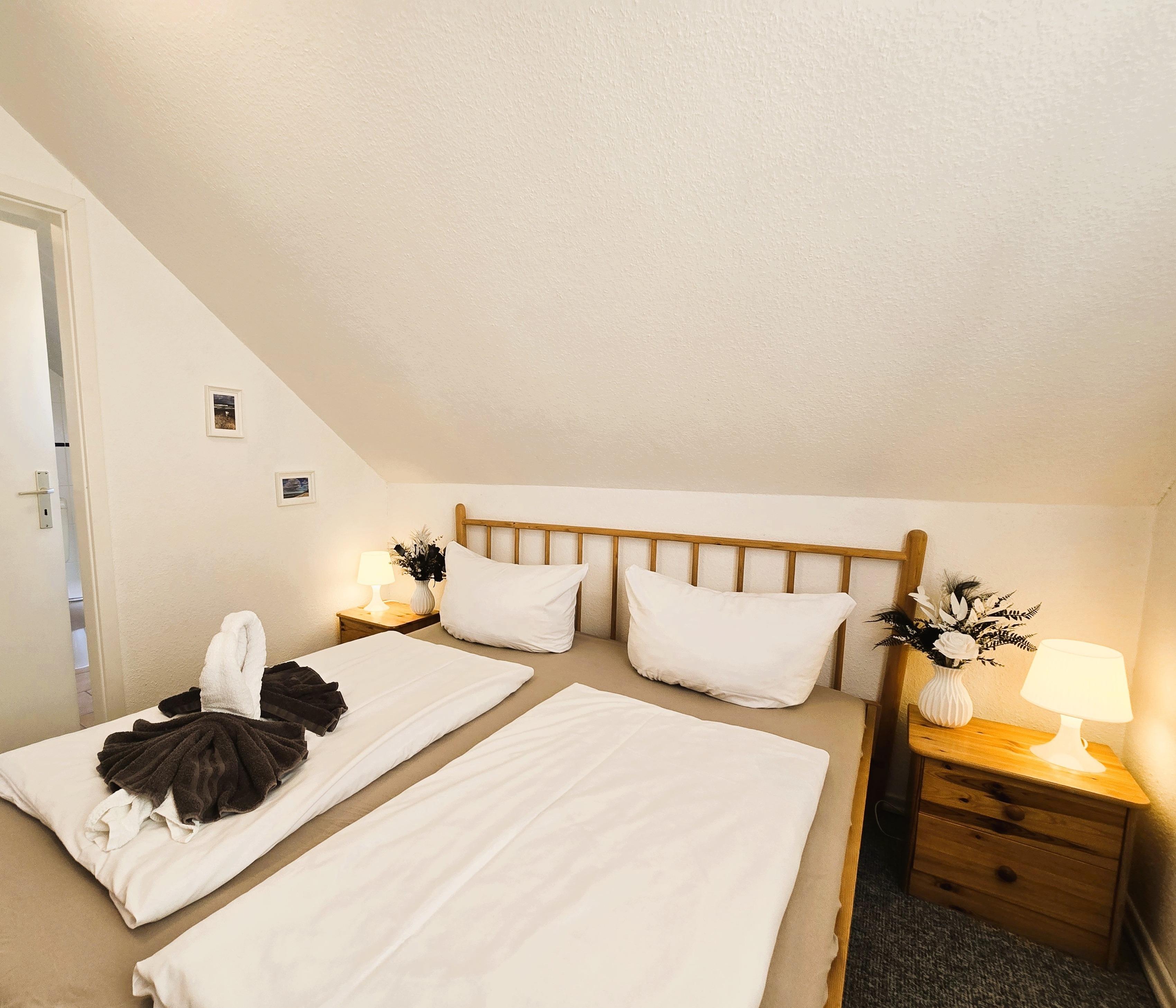 In der Oberen Etage befinden sich die beiden Schlafzimmer, das eine Schlafzimmer ist mit einem 180cm breiten Doppelbett ausgestattet, das andere mit einem 160cm breitem Doppelbett und ein eigenes Bad mit Dusche. In diesem Zimmer befindet sich auch der Zugang zum Spitzboden wo sich noch ein zusätzlicher Schlafplatz mit einem 140cm breitem Bett befindet , der gerne von Kindern genutzt wird.