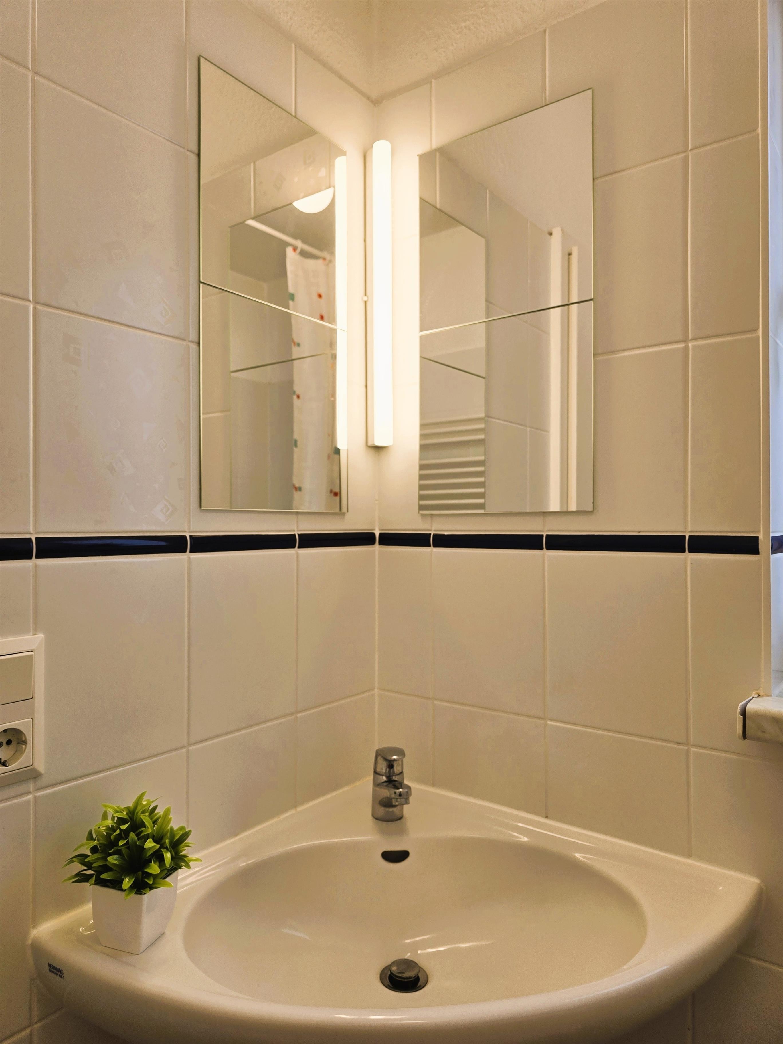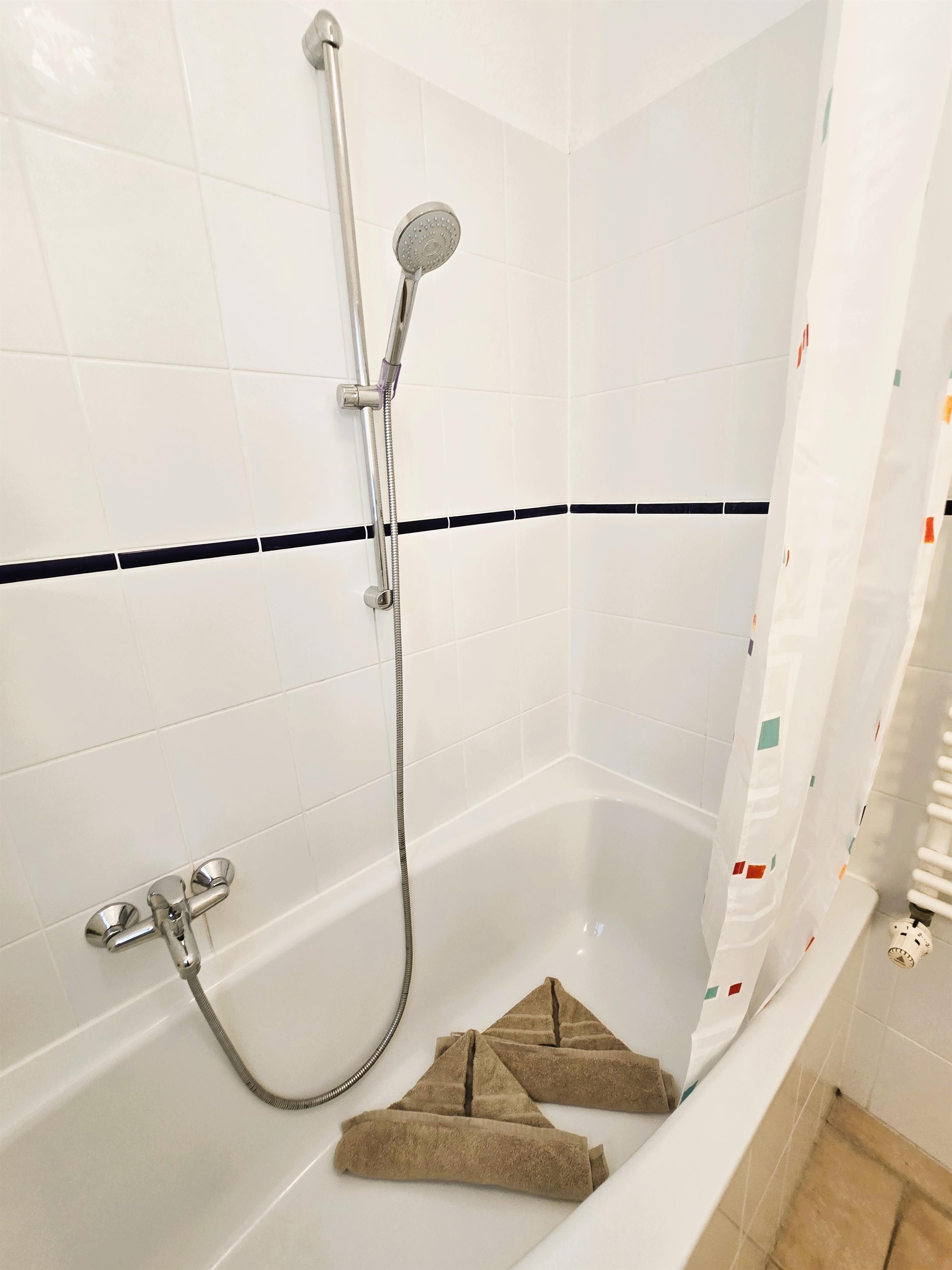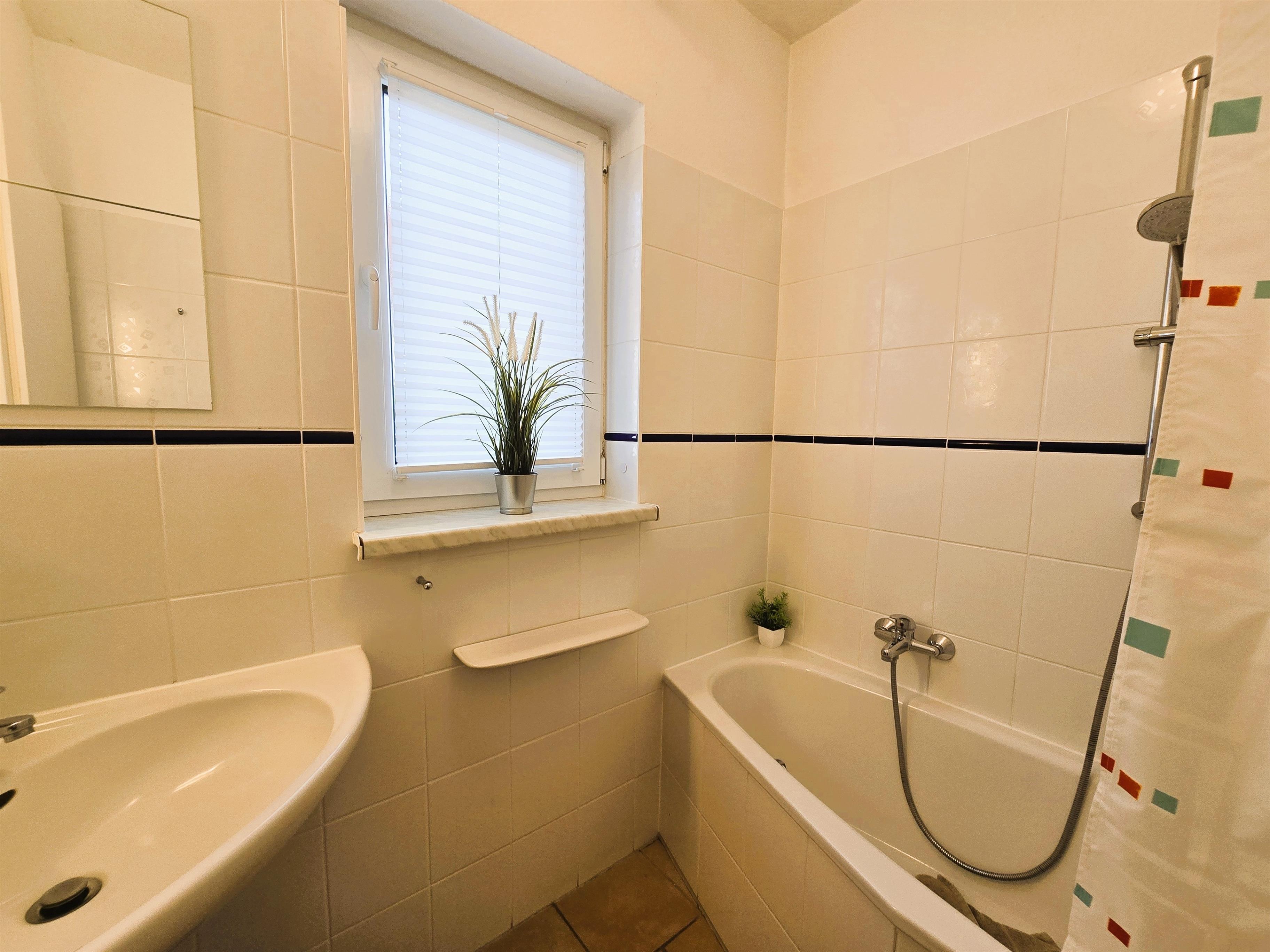 • Ein Badezimmer mit Badewanne und ein separates Gäste-WC