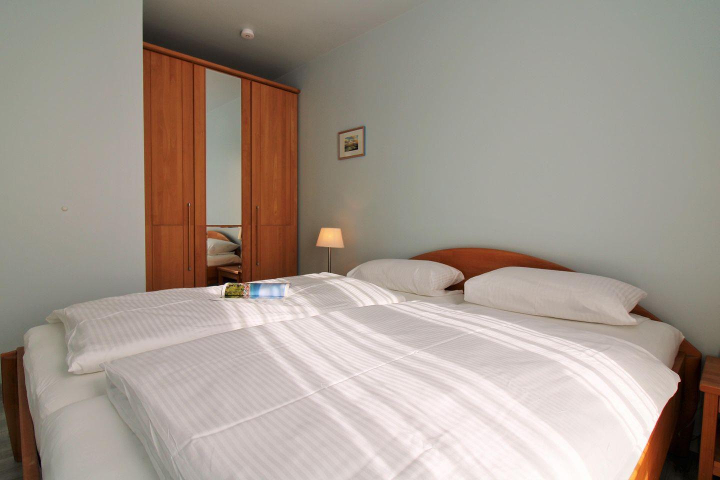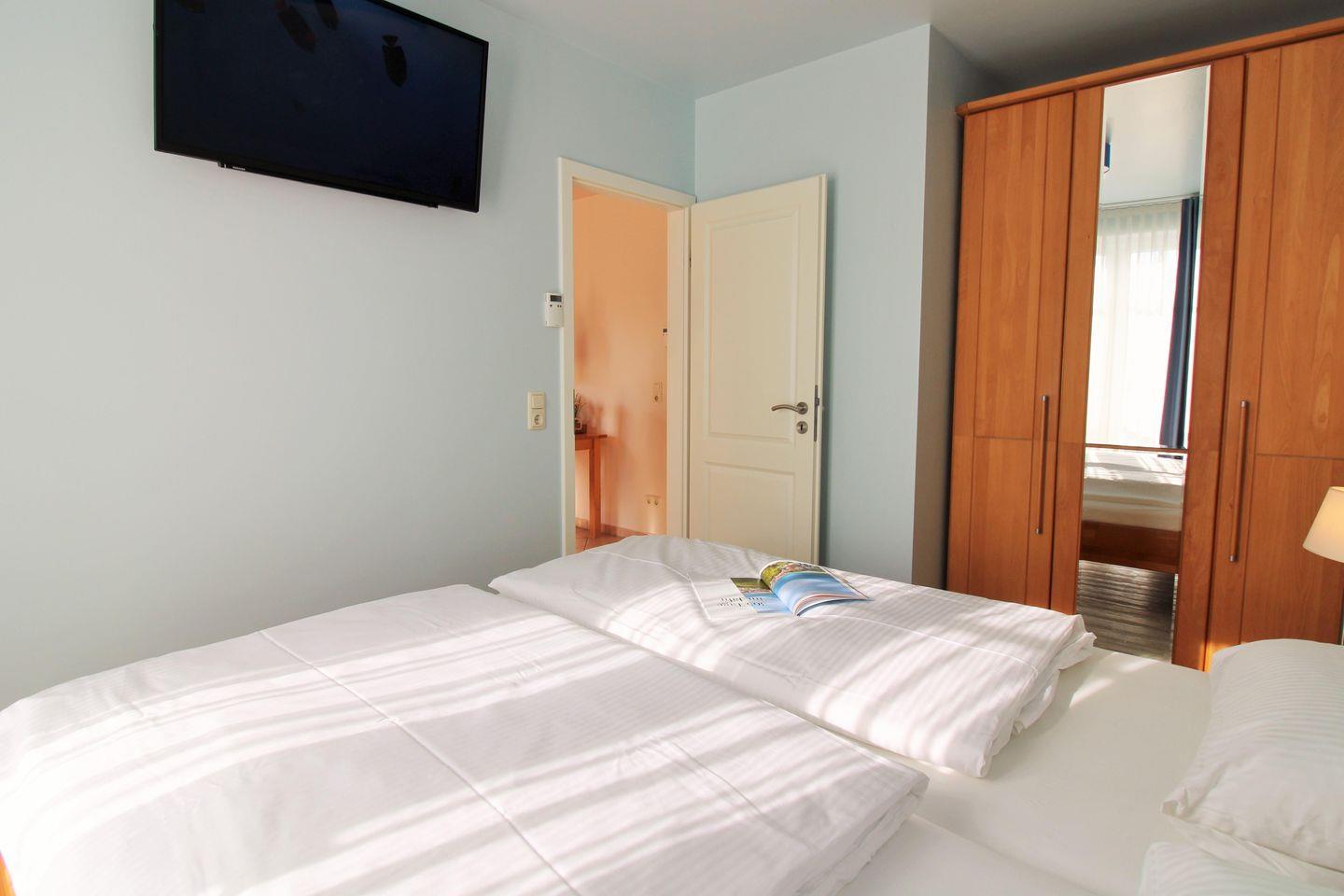 Das helle und freundliche Schlafzimmer ist mit einem bequemen Doppelbett, Nachttischen sowie einem geräumigen Kleiderschrank eingerichtet. Hier steht Ihnen ein weiteres zusätzliches Flachbild-TV-Gerät zur Verfügung. Vom Schlafzimmer aus haben Sie ebenfalls direkten Zugang zum Balkon.