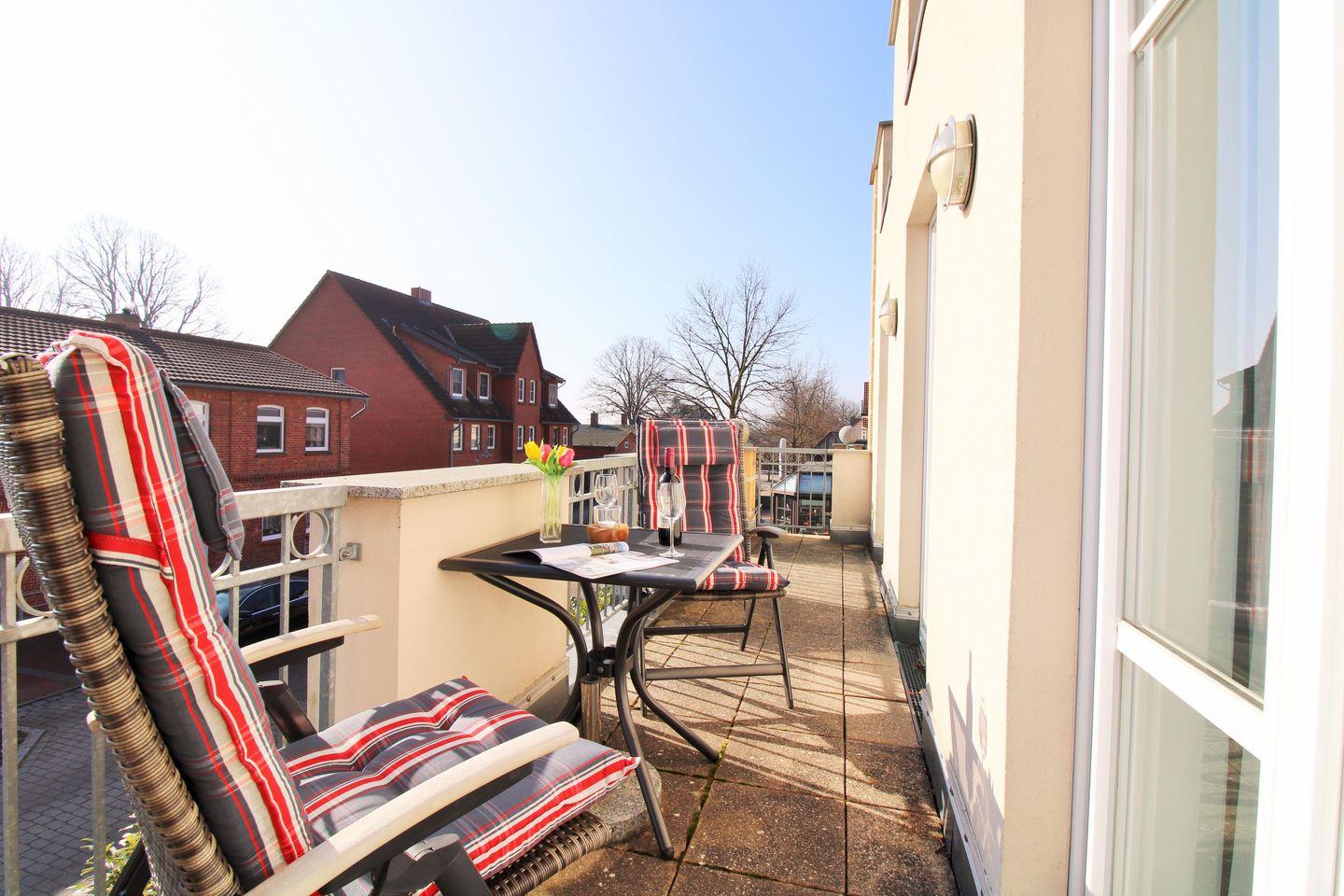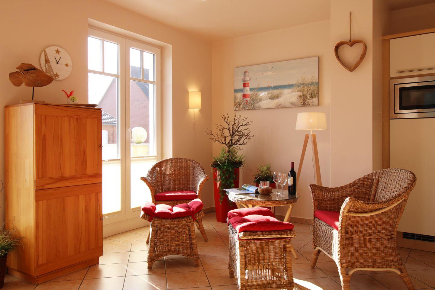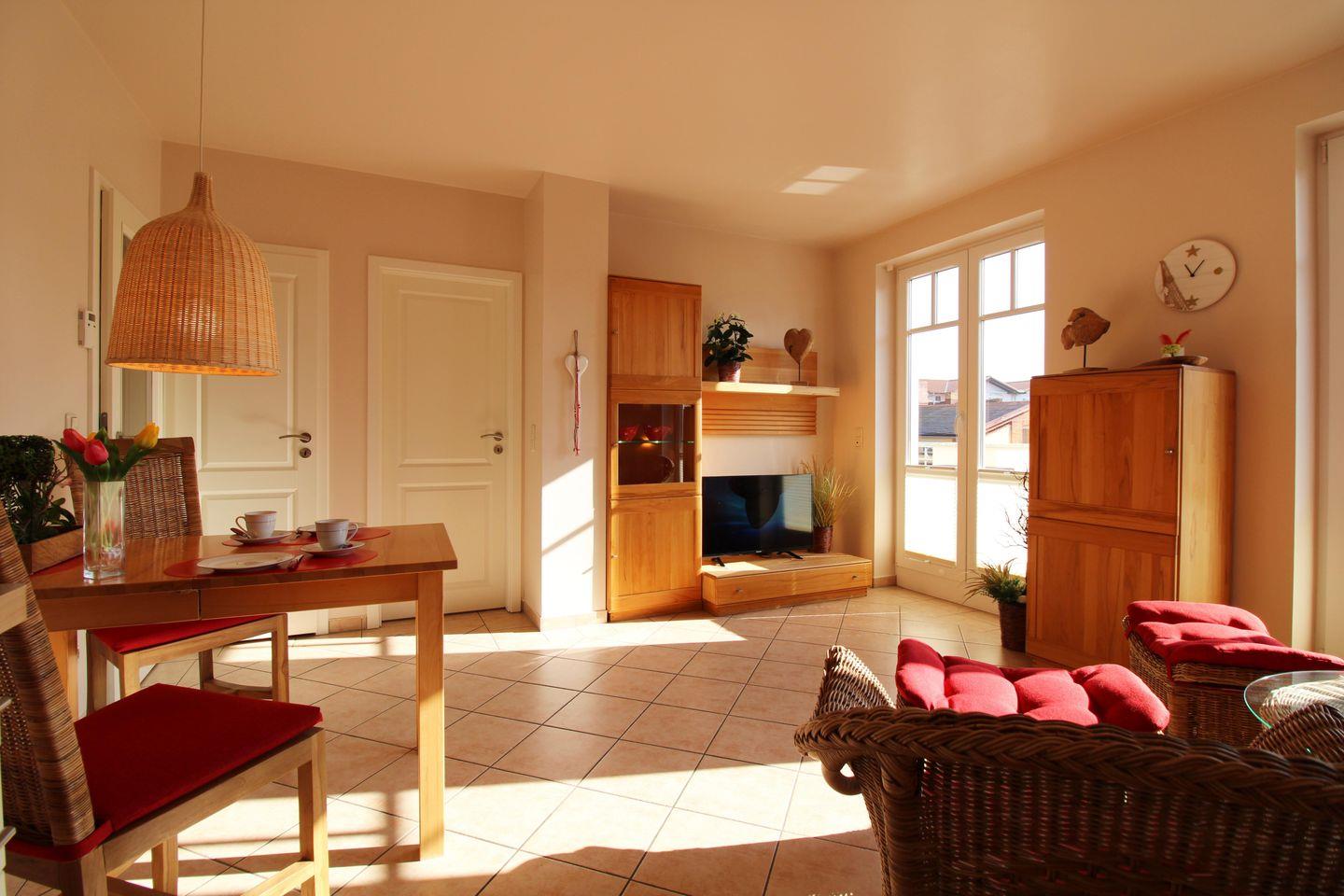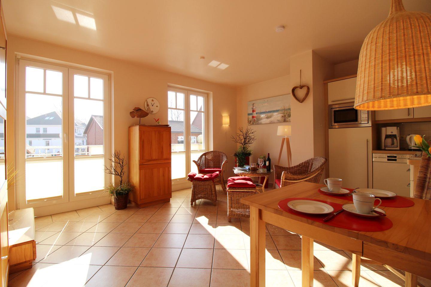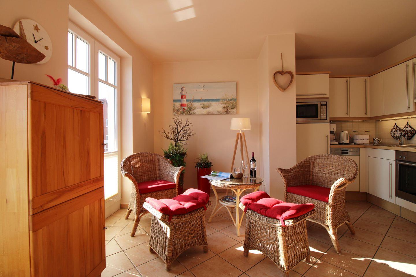 Das helle und hochwertig eingerichtete Wohn-/Esszimmer verfügt über 2 bequeme Sessel sowie 2 Hocker mit Couchtisch, einen separaten Esstisch mit Stühlen sowie diverse Schränke. Vom Wohnzimmer aus haben Sie direkten Zugang zu dem ca. 6 m² großen und sonnigen Balkon (nach Süd-Osten ausgerichtet) mit Balkonmöbeln und Sonnenschirm. Hier sitzen Sie entspannt und gemütlich und können abends bei einem guten Glas Wein in Ruhe die lauen Sommernächte genießen!